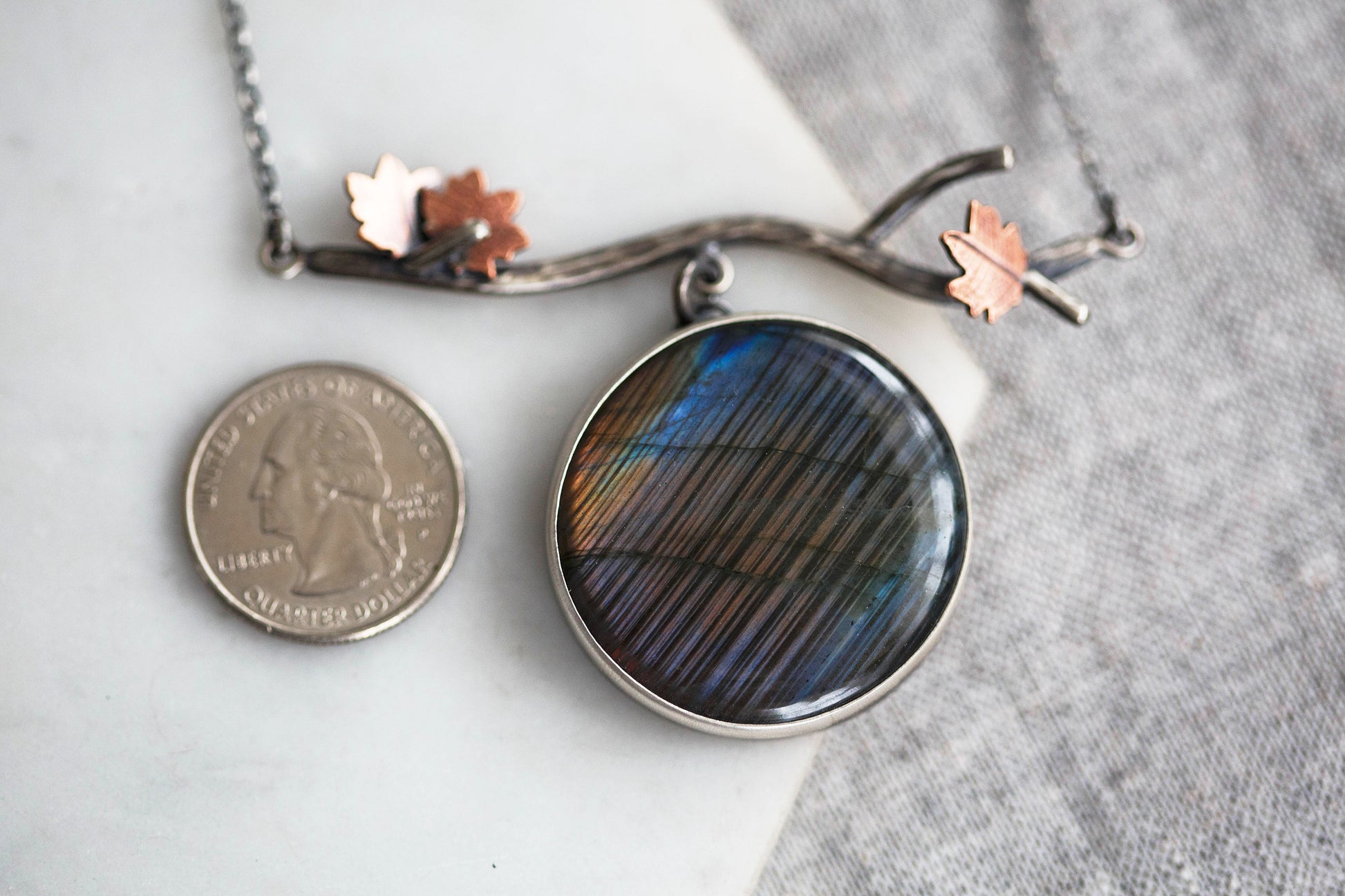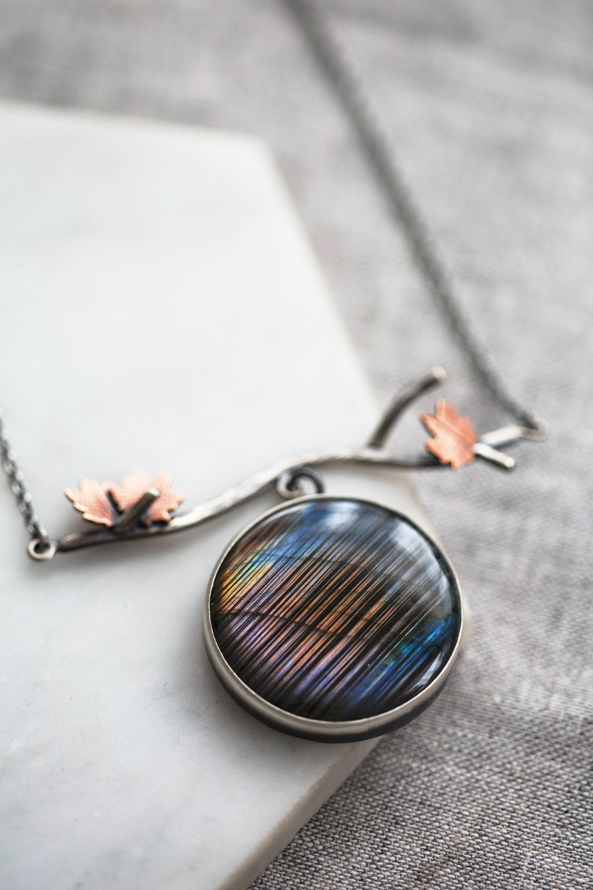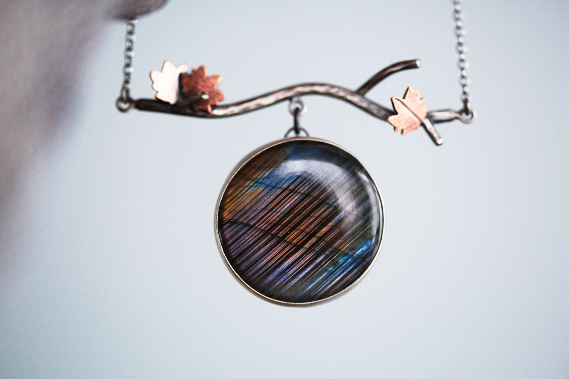 The gemstones are suspended from hand-forged sterling silver branches, carefully textured and oxidized to look like a late-autumn reaching branch. And along the branch are carefully placed sawn copper leaves with a leaf-print taken from real leaves.