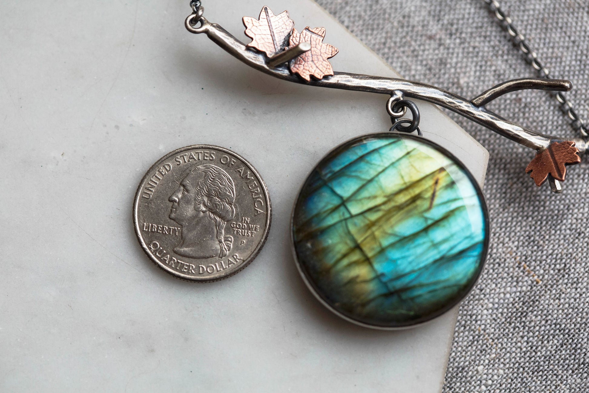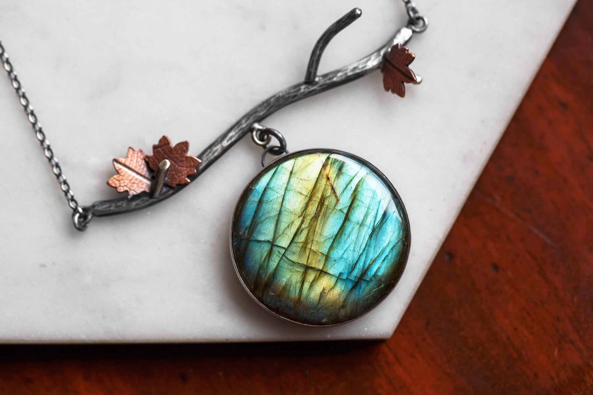 The gemstones are suspended from hand-forged sterling silver branches, carefully textured and oxidized to look like a late-autumn reaching branch. And along the branch are carefully placed sawn copper leaves with a leaf-print taken from real leaves.