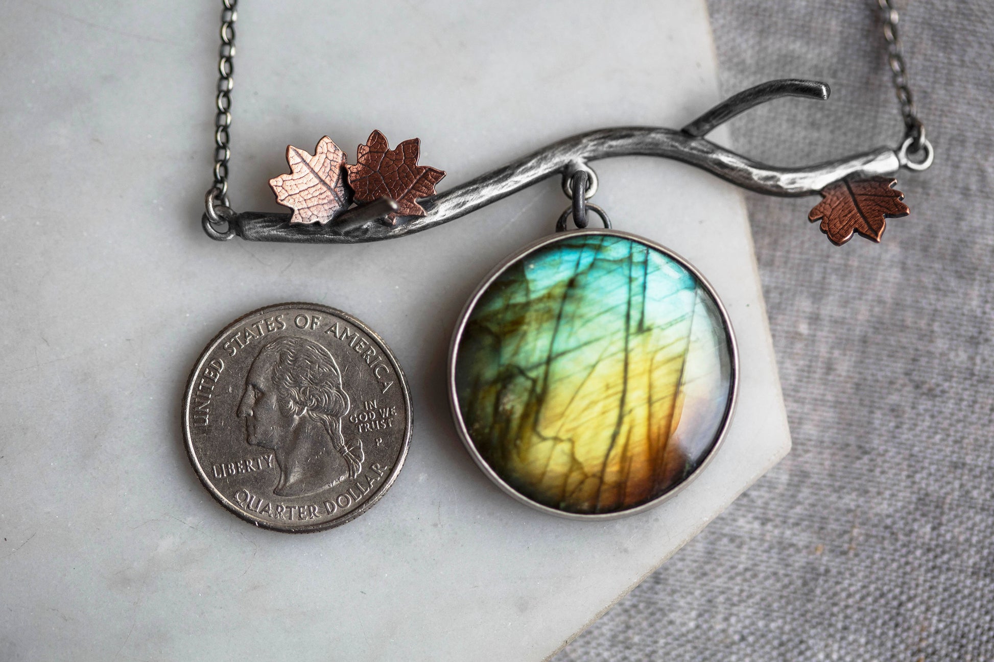 The gemstones are suspended from hand-forged sterling silver branches, carefully textured and oxidized to look like a late-autumn reaching branch. And along the branch are carefully placed sawn copper leaves with a leaf-print taken from real leaves.
