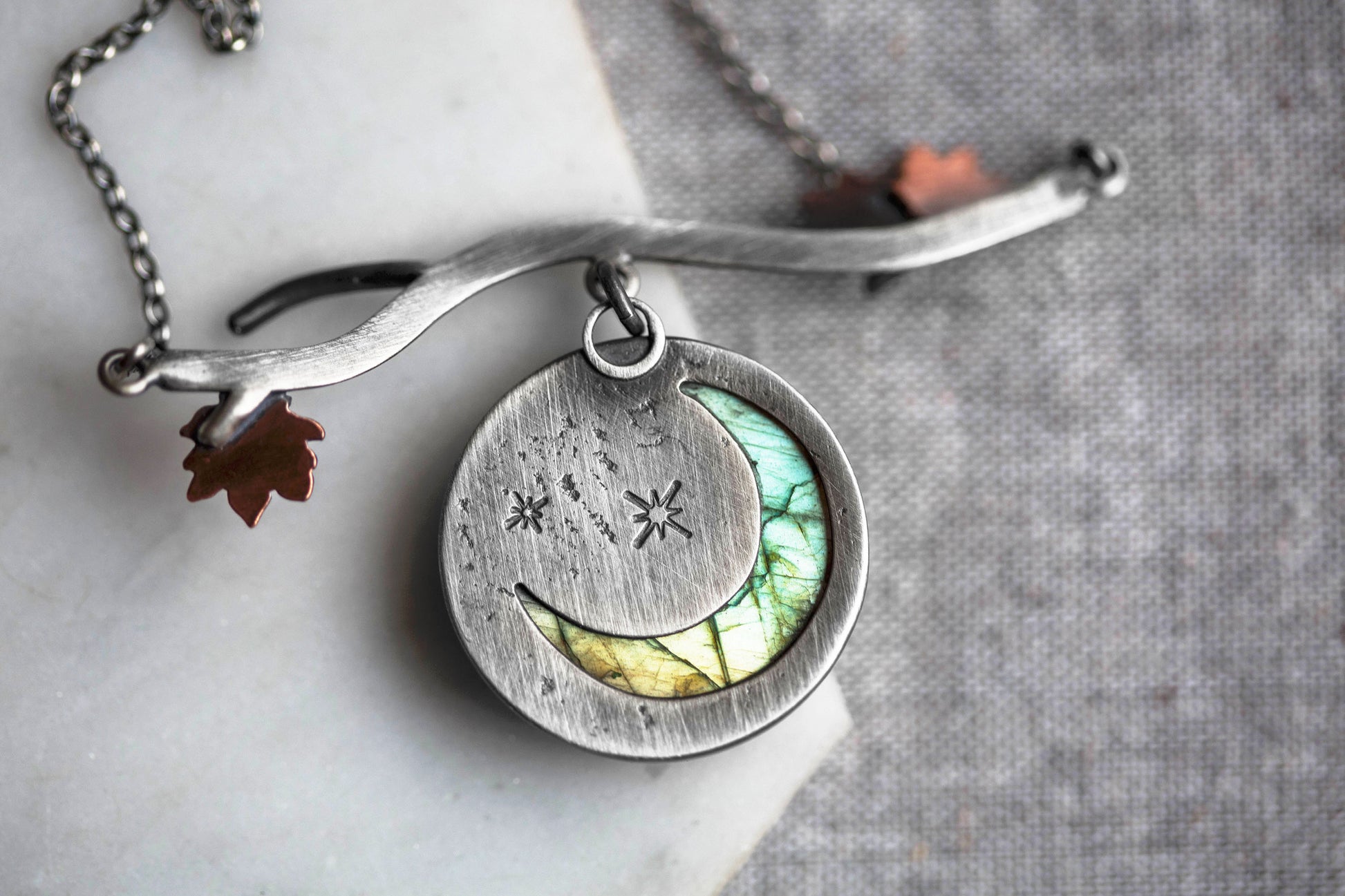 Each flashing labradorite gemstone is held by straight sterling silver bezel. The back of the pendant features a cluster of stars and a crescent moon window showing the backs of the stones. Some of the windows will flash brightly, and others remain dark and mysterious.
