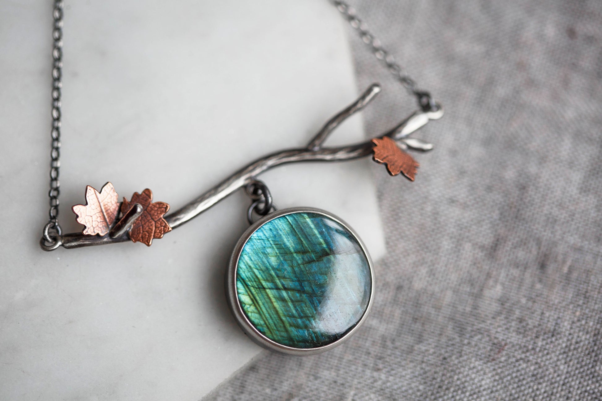 The gemstones are suspended from hand-forged sterling silver branches, carefully textured and oxidized to look like a late-autumn reaching branch. And along the branch are carefully placed sawn copper leaves with a leaf-print taken from real leaves.