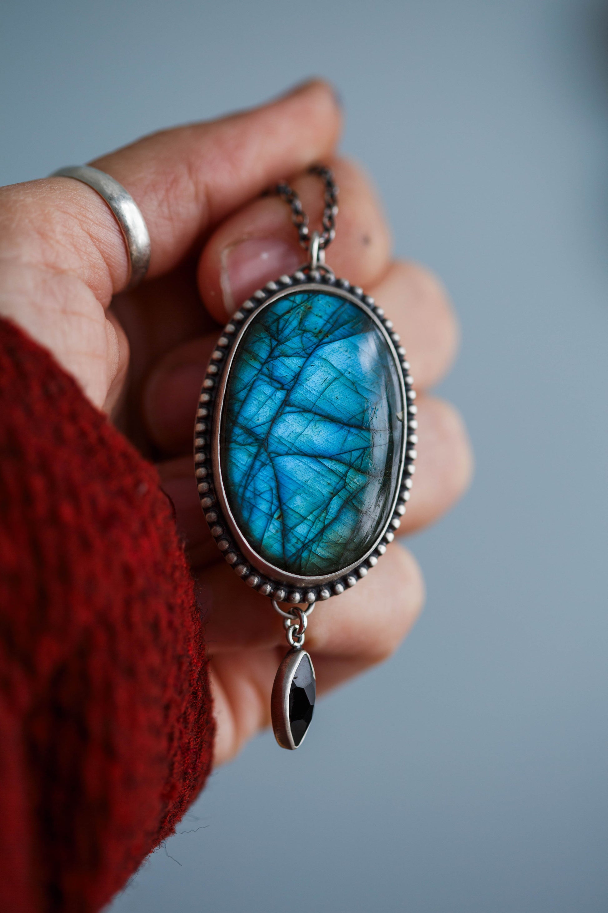 Below each labradorite pendant is a single onyx gemstones, faceted to reflect bits of light.
