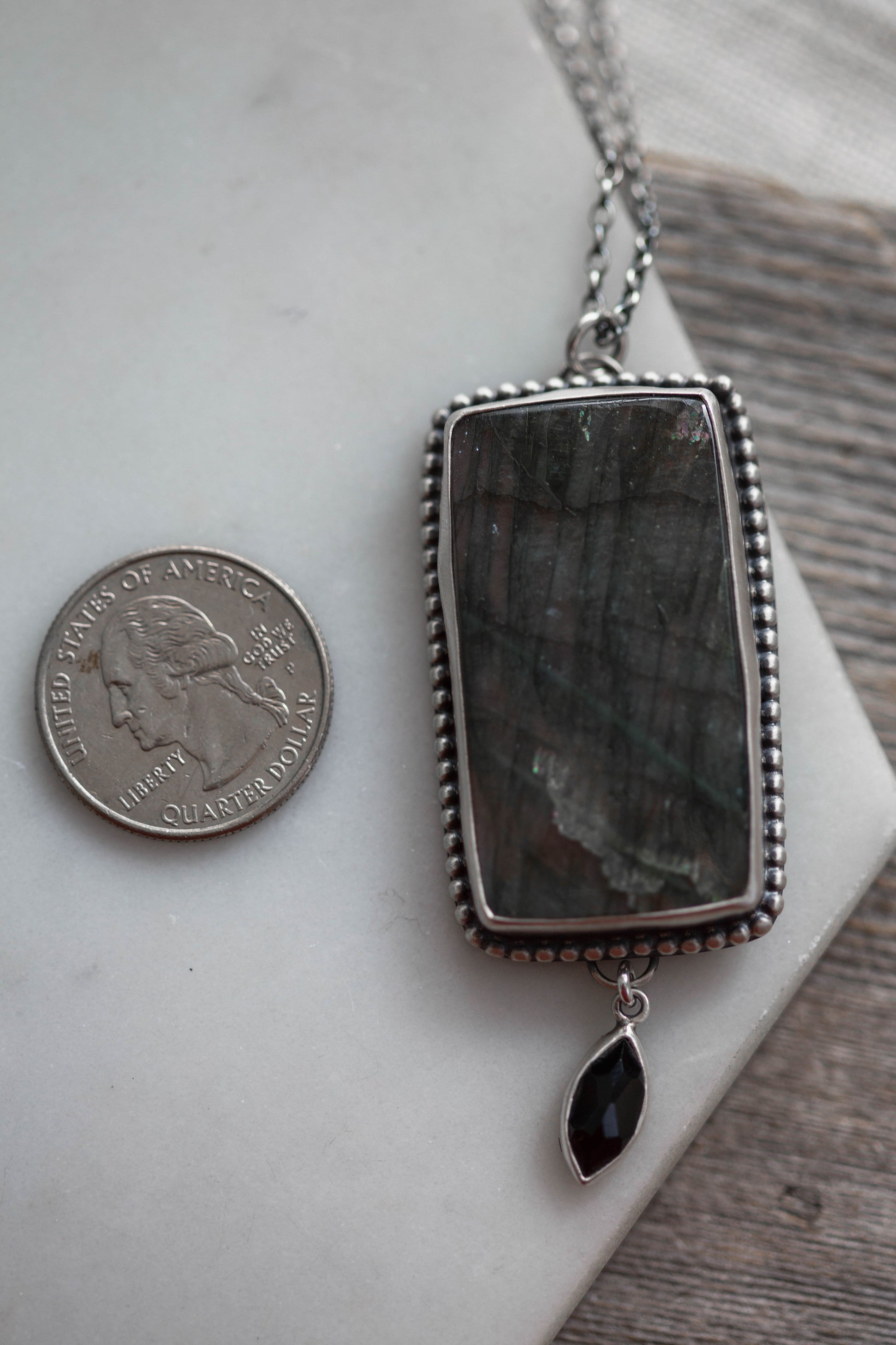 Below each labradorite pendant is a single onyx gemstones, faceted to reflect bits of light.