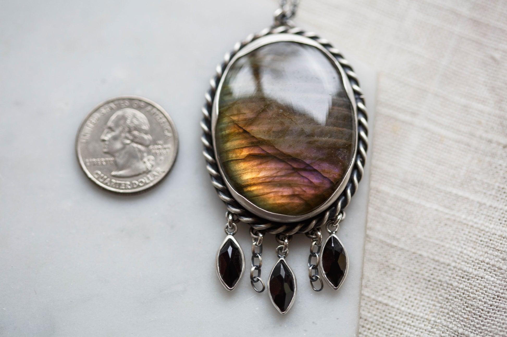 Below each labradorite pendant are onyx gemstones, faceted to reflect bits of light. And between, little bits of chain, like the chains rattled by disgruntled ghosts.