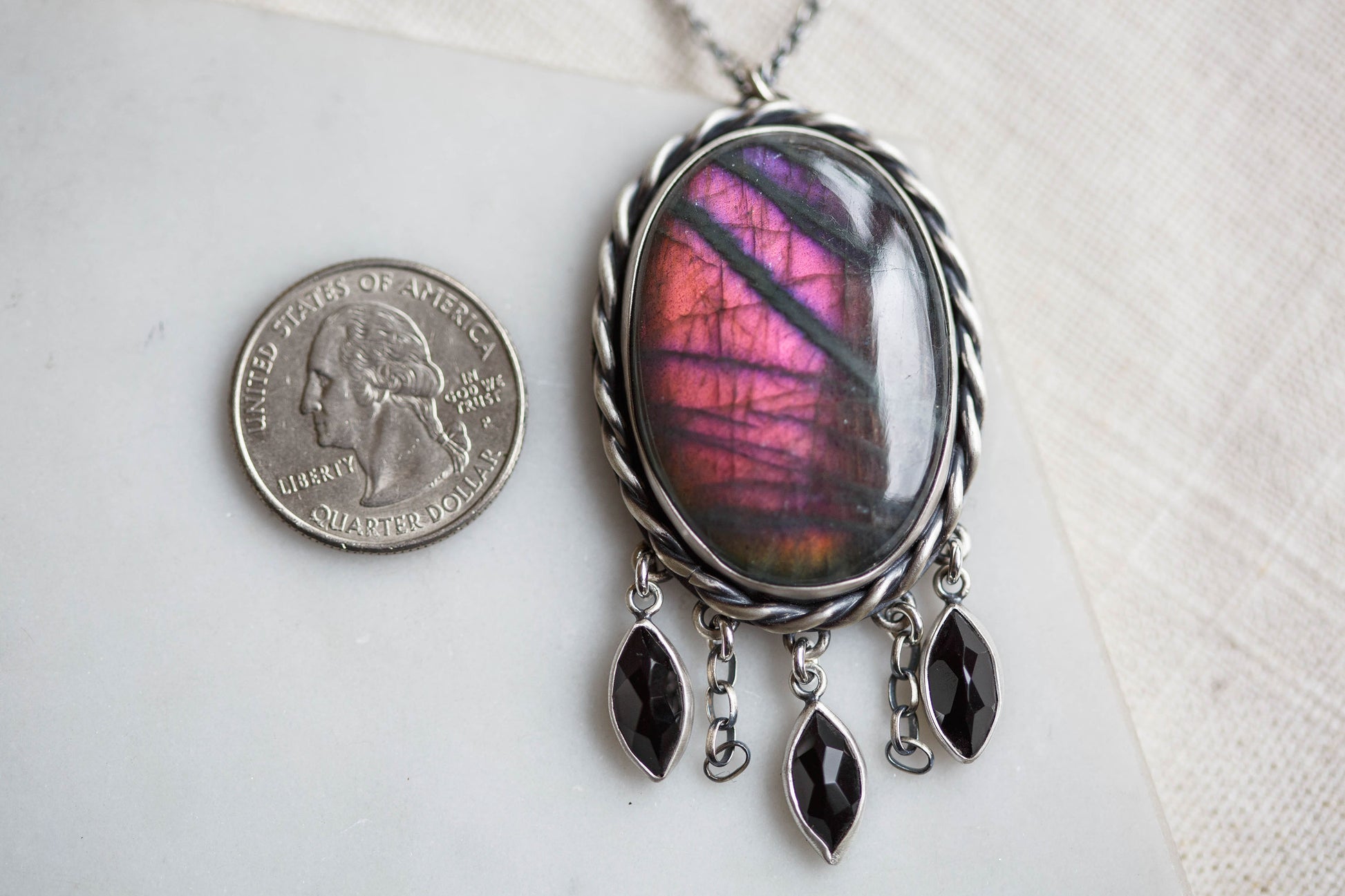 Below each labradorite pendant are onyx gemstones, faceted to reflect bits of light. And between, little bits of chain, like the chains rattled by disgruntled ghosts.