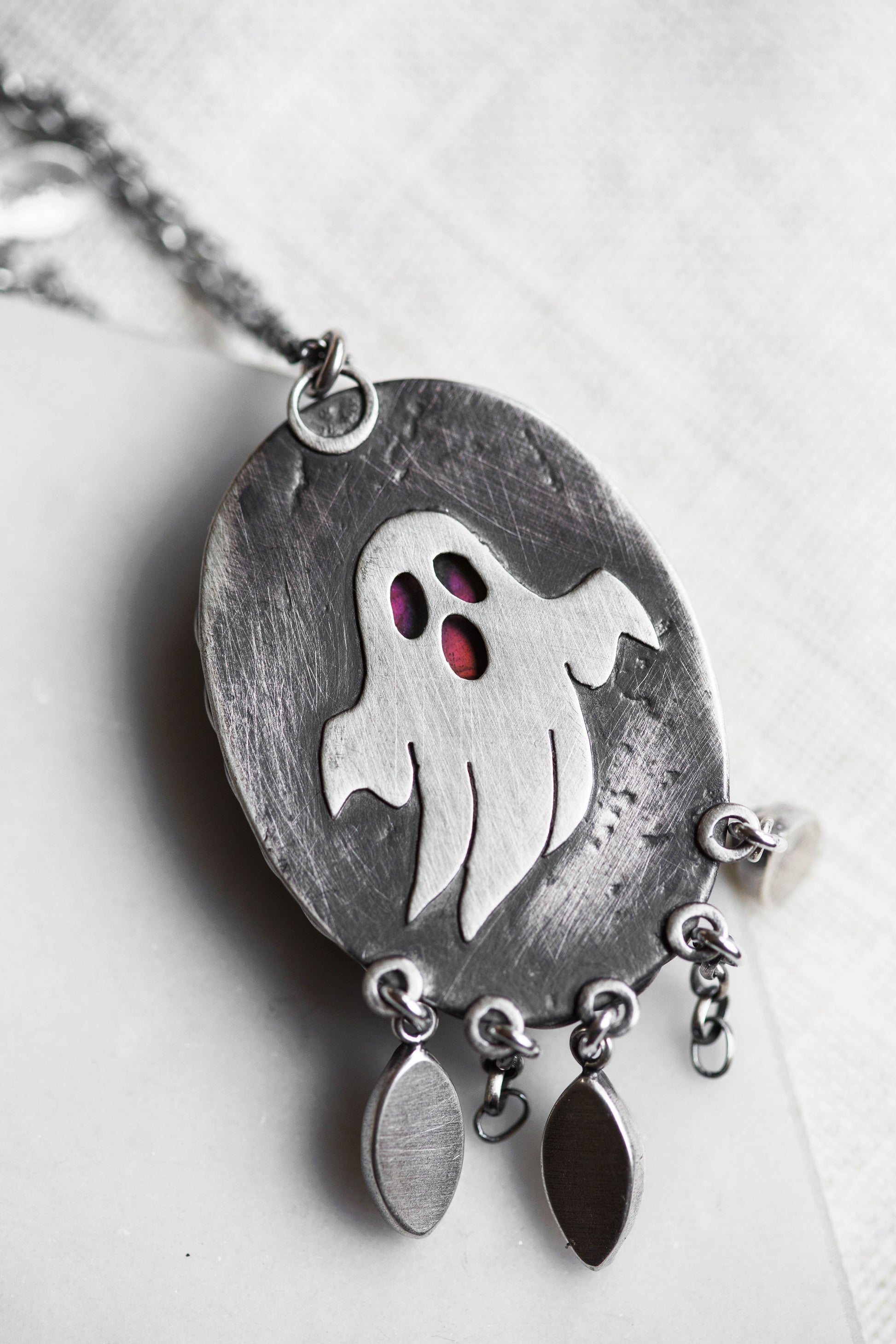 Surrounding the pendants is a hand-twisted vine border, like the undergrowth of a cemetery reaching out its furtive tendrils. The backs of the pendants feature sweet, little sheet ghosts floating across a dark gray background.