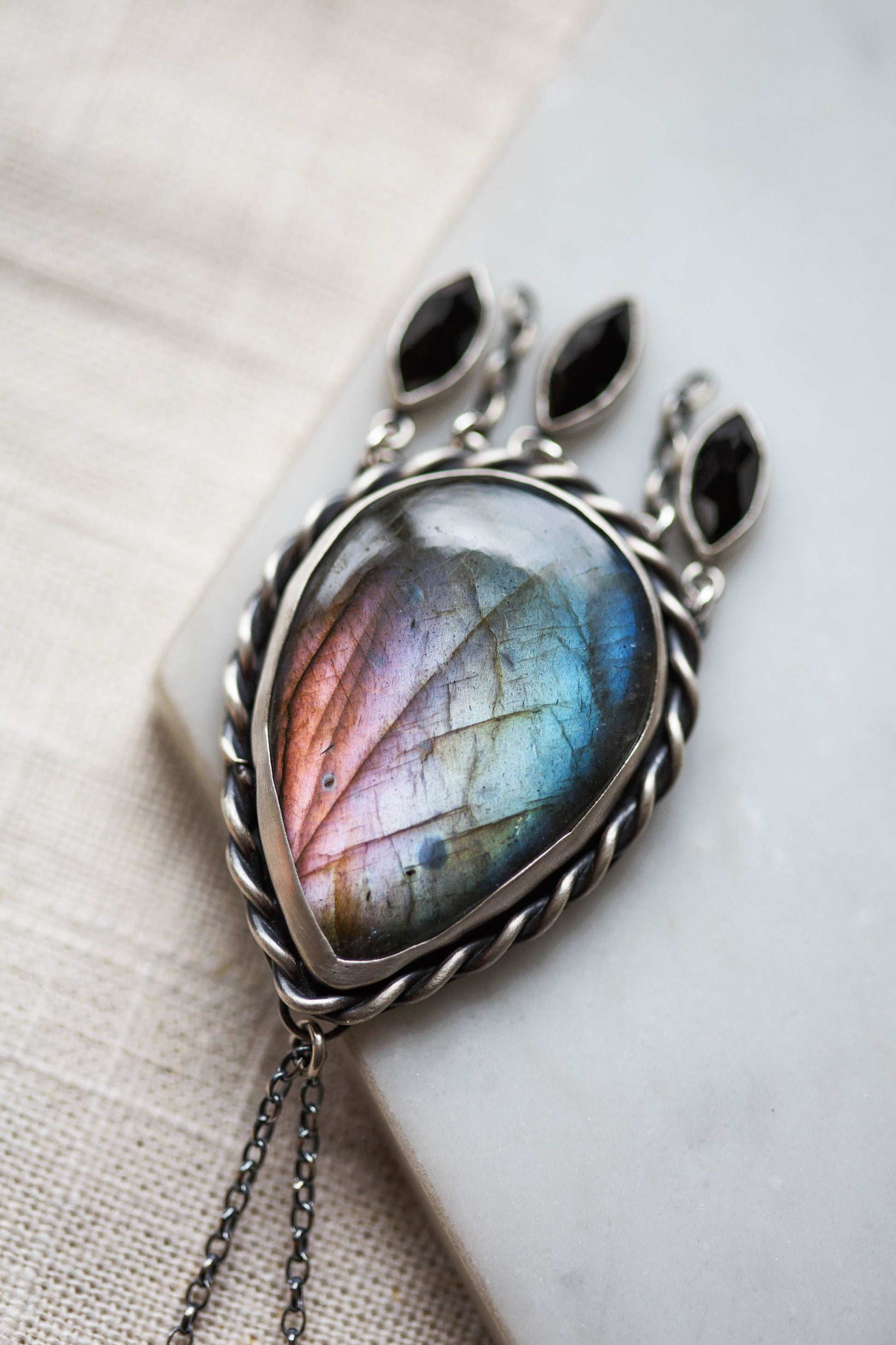 Below each labradorite pendant are onyx gemstones, faceted to reflect bits of light. And between, little bits of chain, like the chains rattled by disgruntled ghosts.