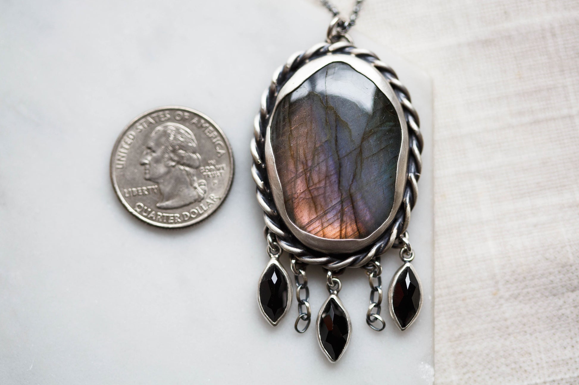 Below each labradorite pendant are onyx gemstones, faceted to reflect bits of light. And between, little bits of chain, like the chains rattled by disgruntled ghosts.