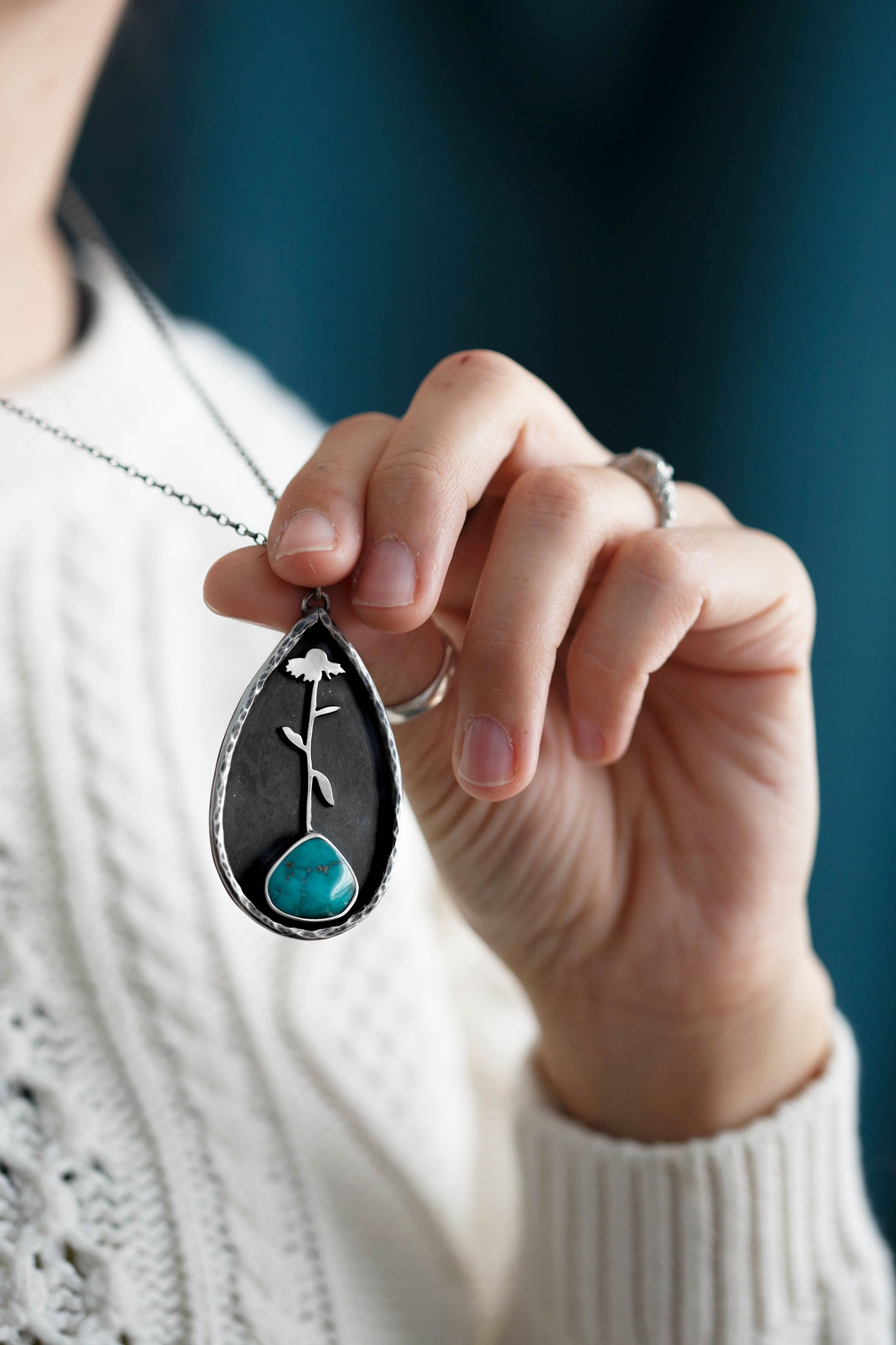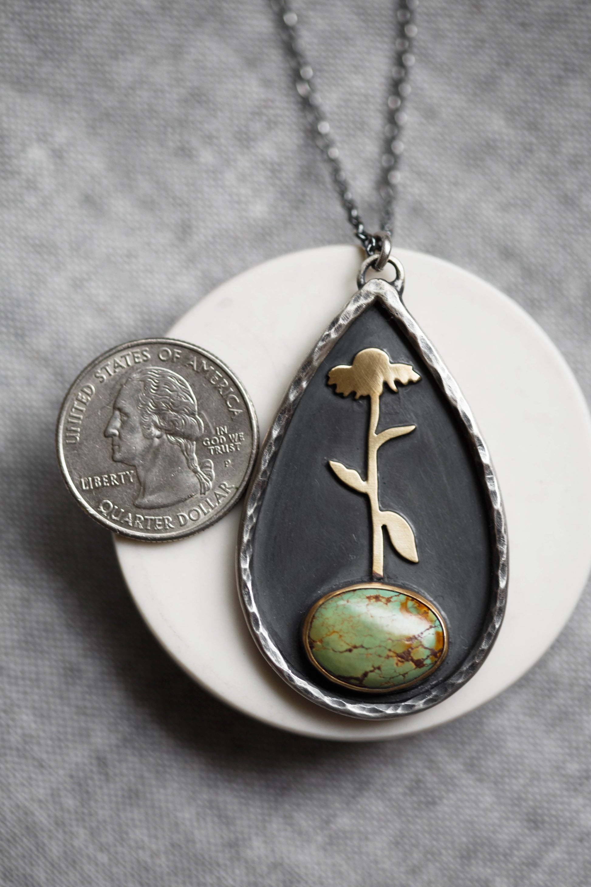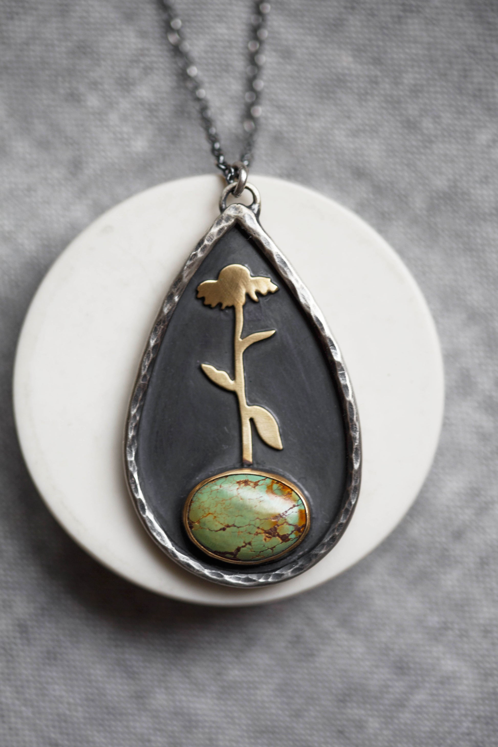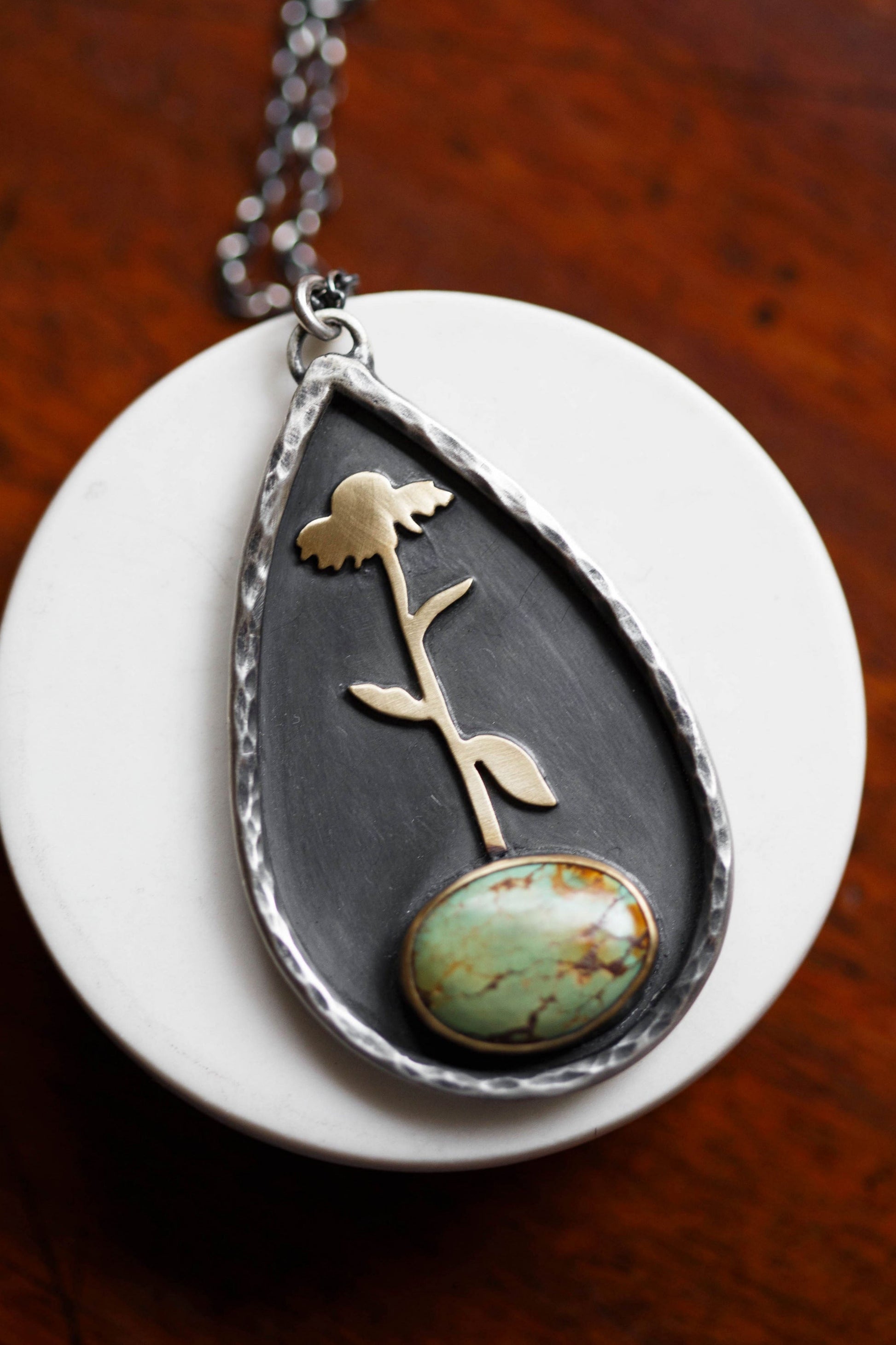 A medallion necklace with a single coneflower growing out of a turquoise gemstone, each one unique. Outlining the flower and turquoise gemstone is a hammered branch border
