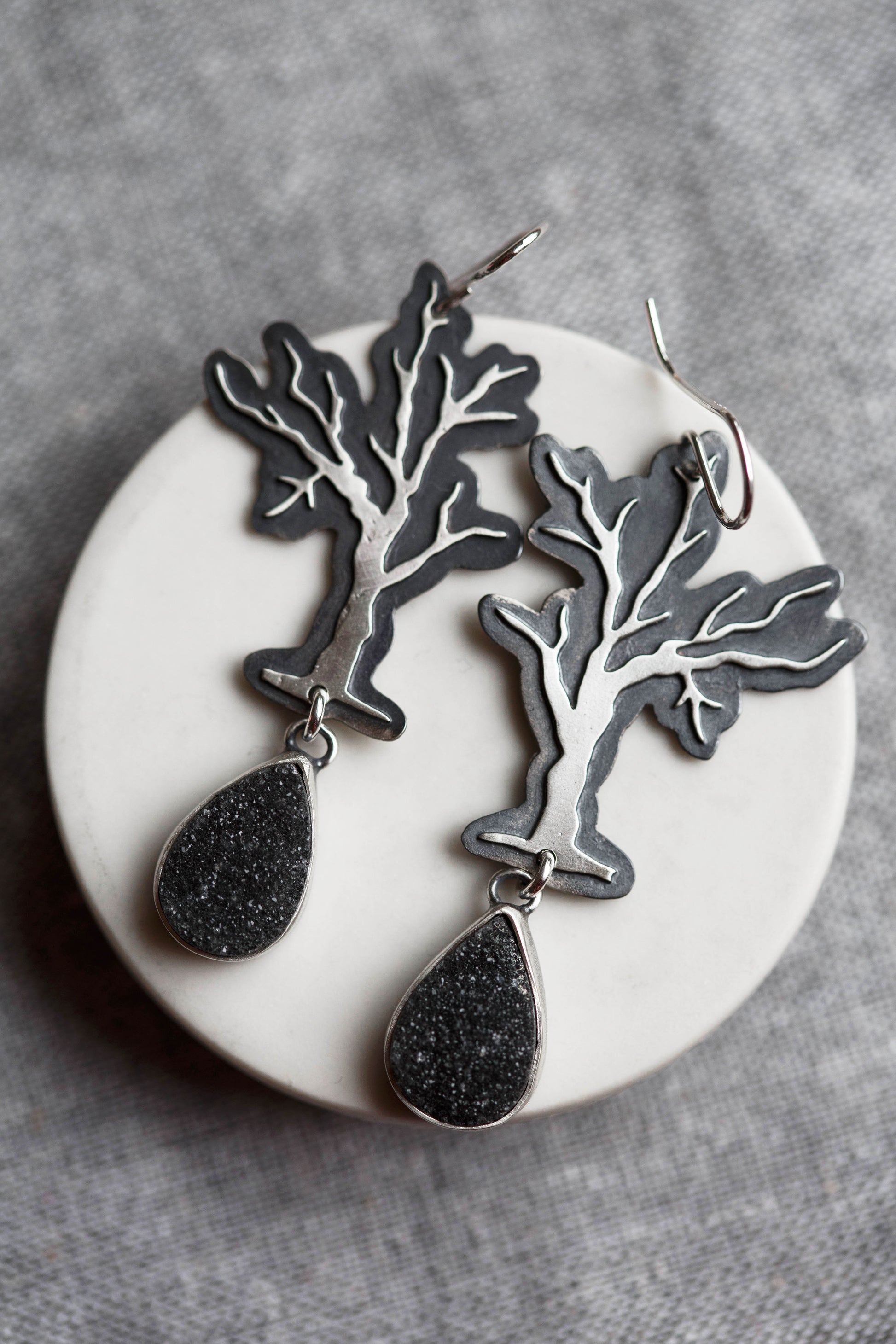 And suspended below the trees are sparkling black druzy teardrops, like slices of the night sky.