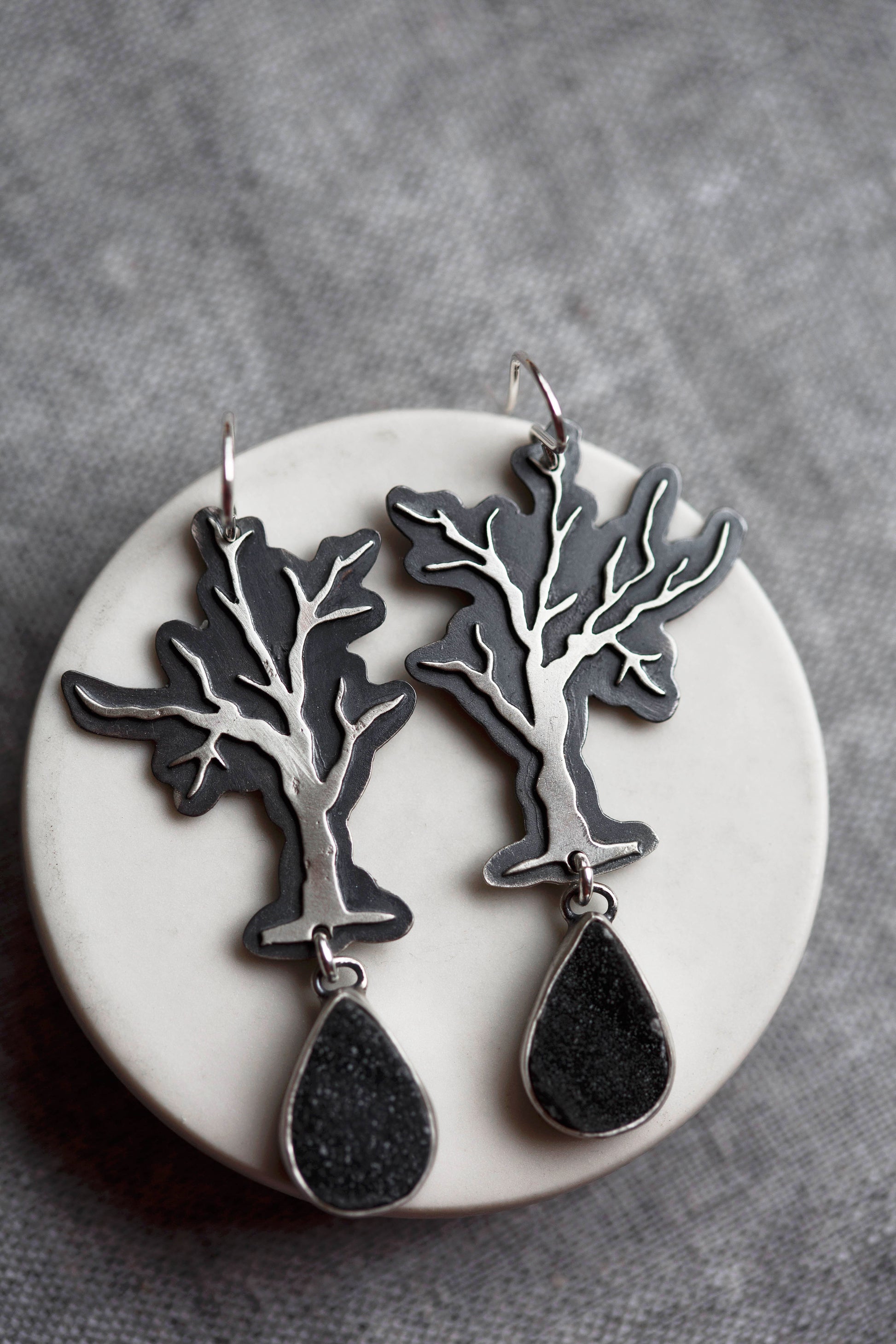 These earrings feature intricately cut leafless trees set against a dark shadowy background.