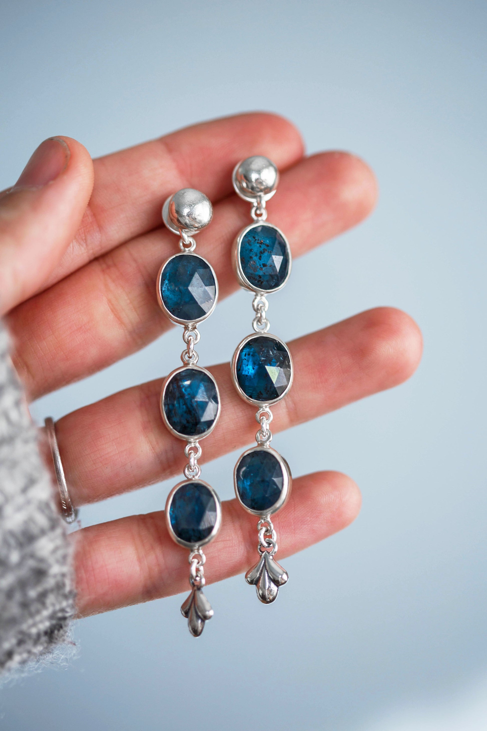 The gemstones are simply set in straight bezels. They are suspended in slightly graduated size from top to bottom. At the very bottom of the earrings is a little frond made of molten silver and hand sawn and smoothed before affixing them to the gemstone.