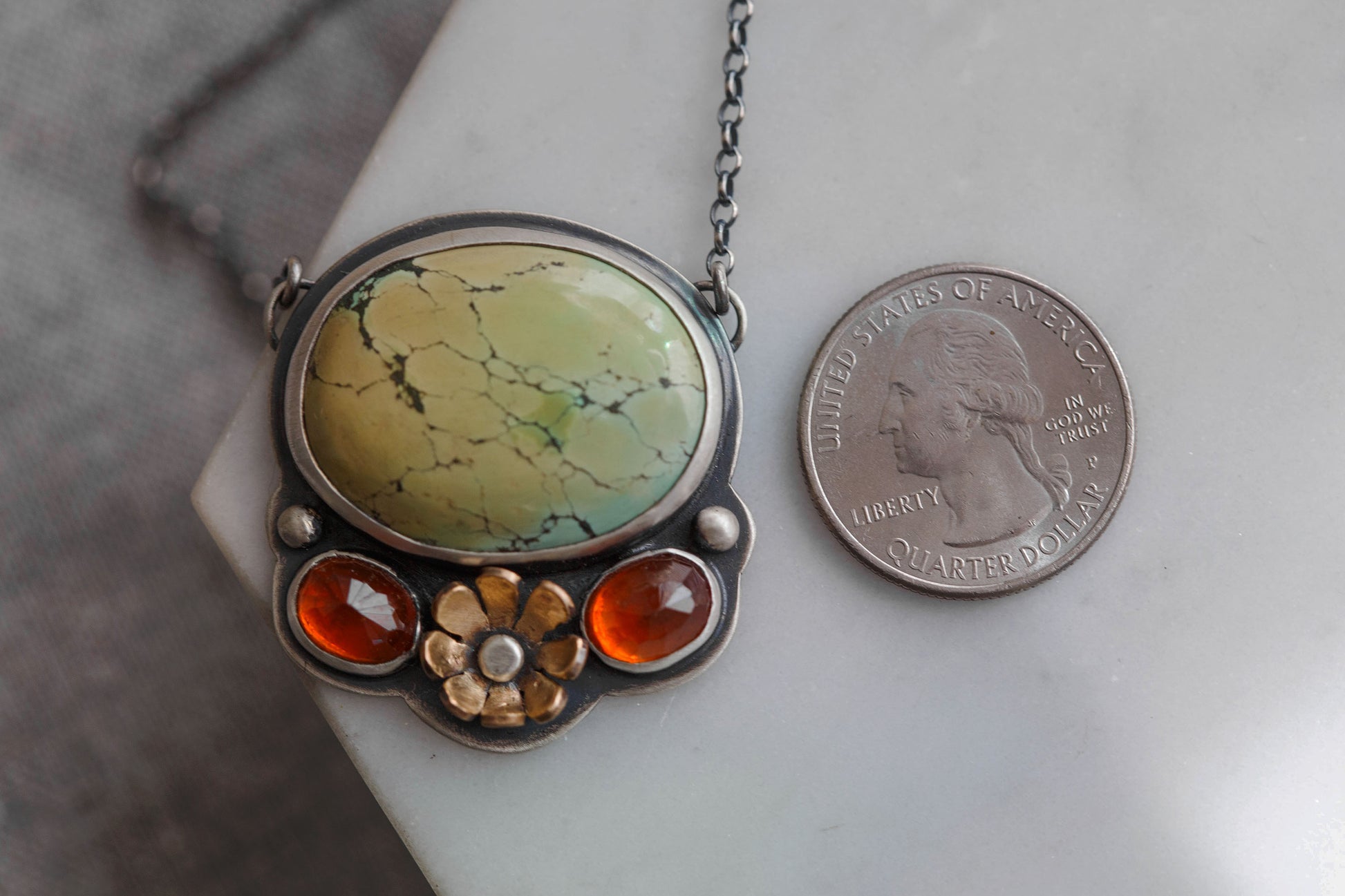 These necklaces all feature a large focal turquoise gemstone, all very different in cut, color, shape, and matrix. As unique as it's wearer. Below each turquoise is a single, warm brass flower, and to either side a faceted hessonite garnet and a tiny sterling silver pebble.