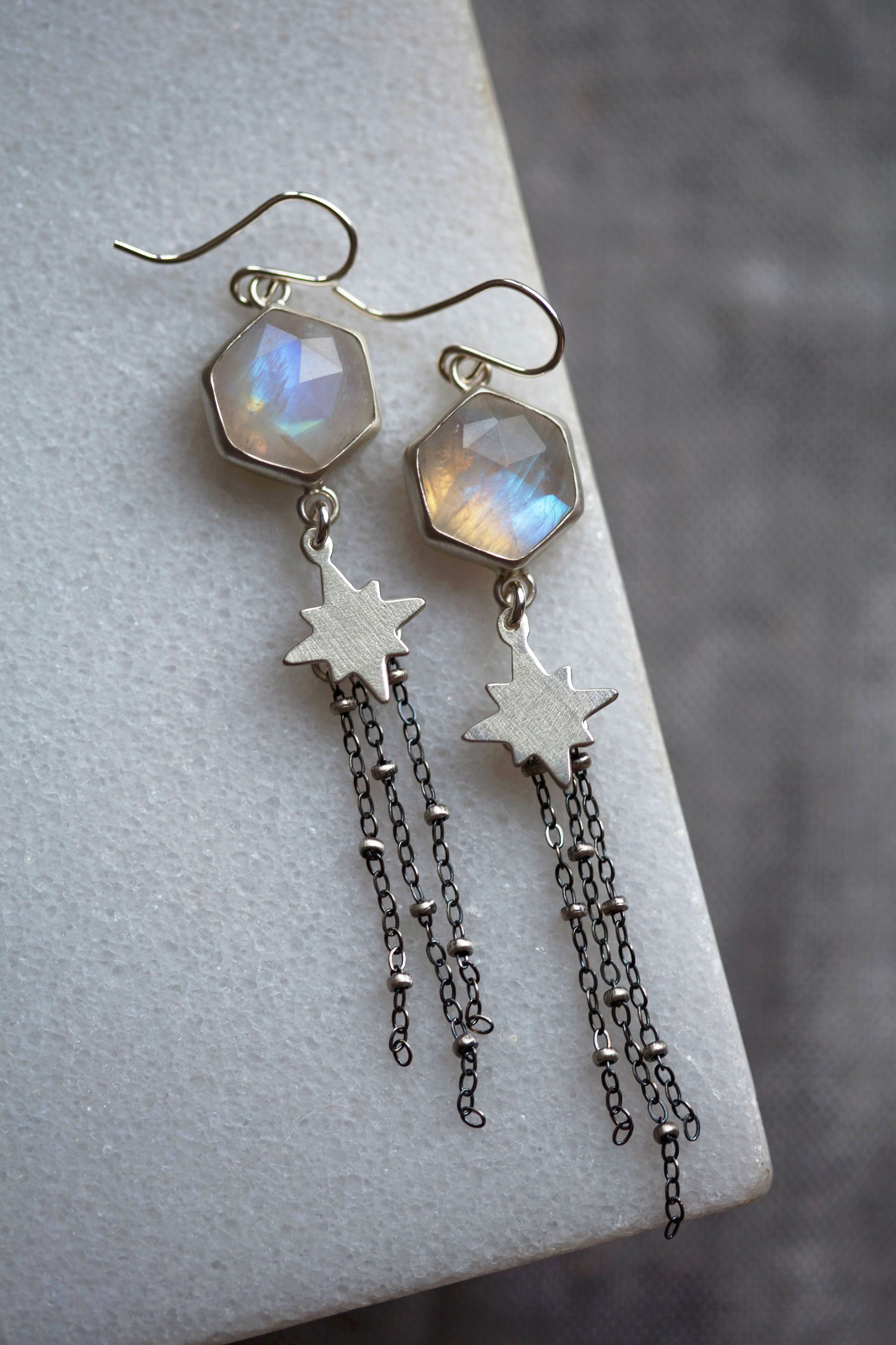 These earrings feature rose cut moonstone gemstones suspended above a sterling silver star with a satellite chain tassel delicately swaying below.