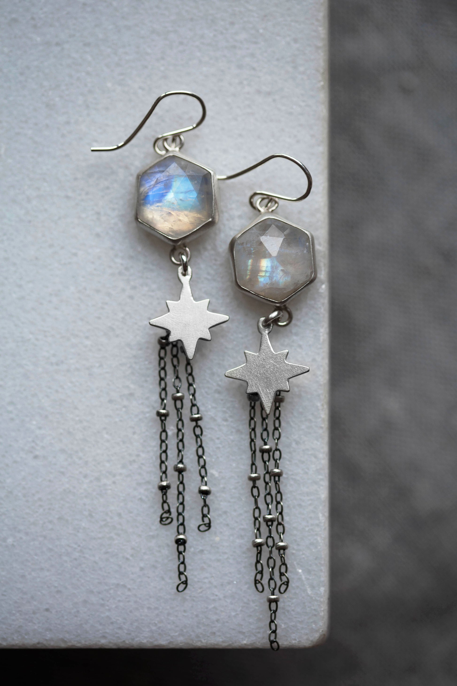 These earrings feature rose cut moonstone gemstones suspended above a sterling silver star with a satellite chain tassel delicately swaying below.