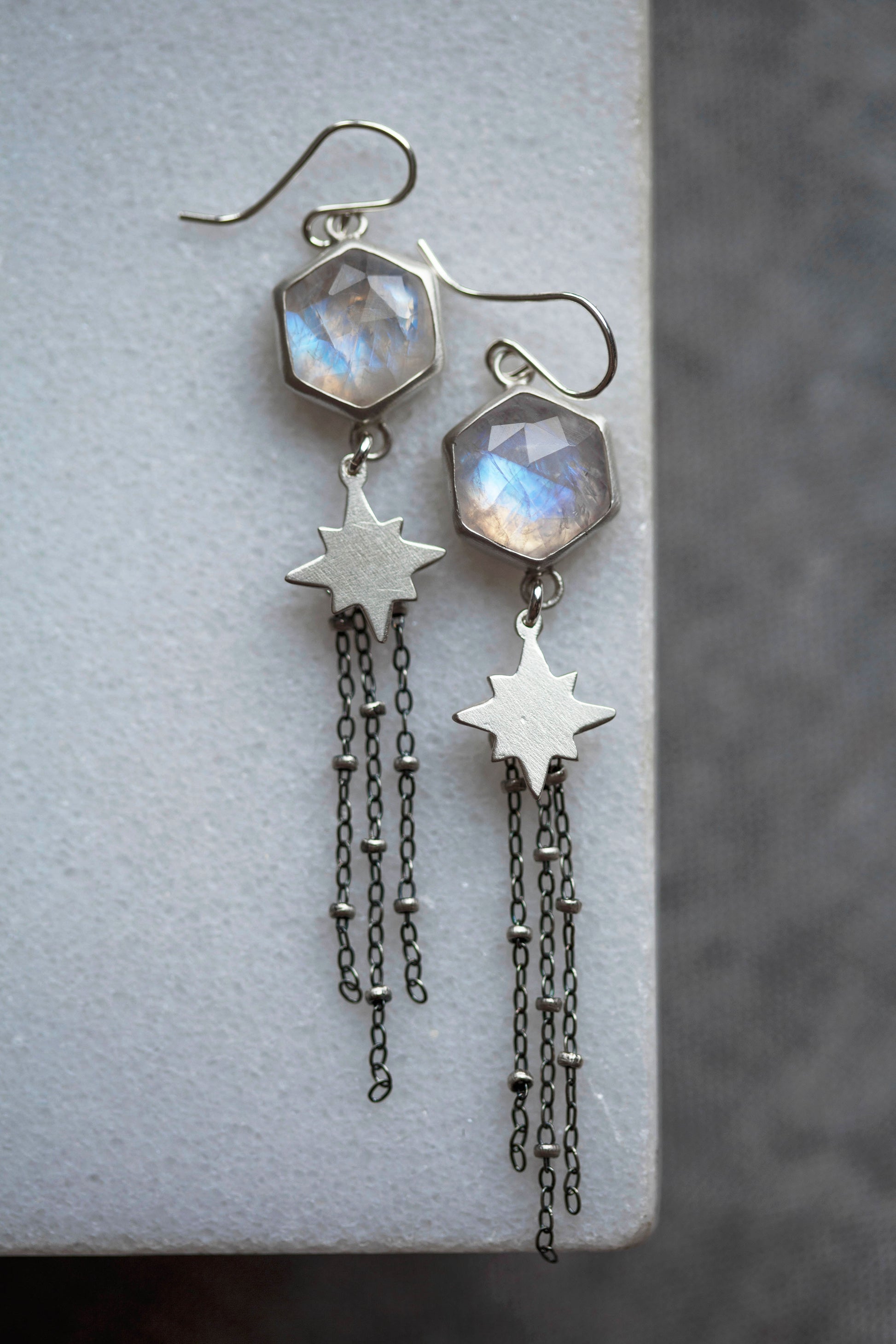 These earrings feature rose cut moonstone gemstones suspended above a sterling silver star with a satellite chain tassel delicately swaying below.