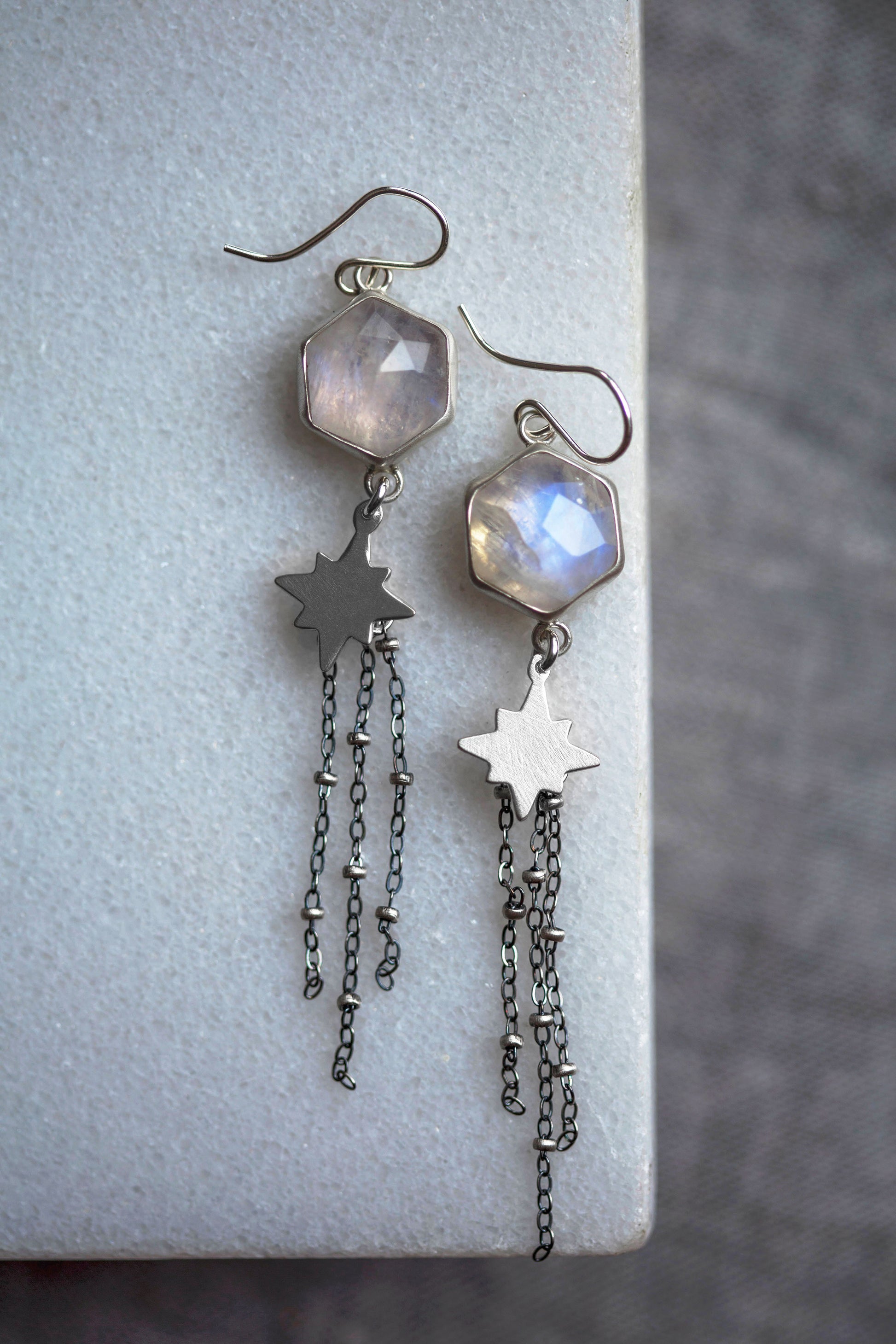 These earrings feature rose cut moonstone gemstones suspended above a sterling silver star with a satellite chain tassel delicately swaying below.