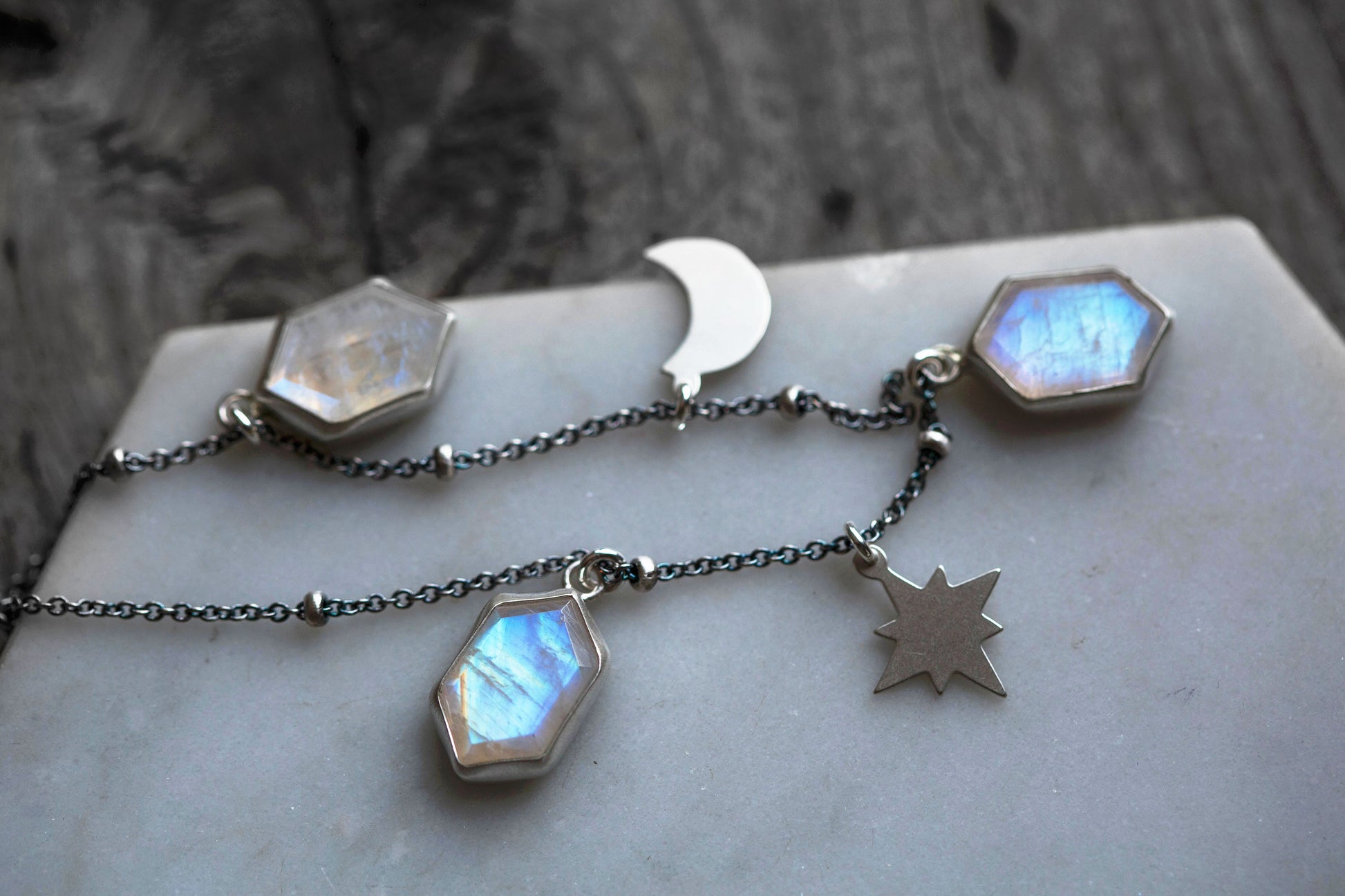 A sweet, simple layering necklace to be worn on midnight walks and while gathering up moonshine. A field of stars and moons and winter magic drifting across the neck.