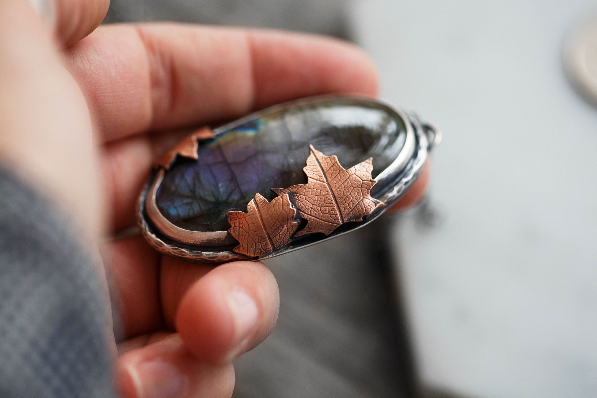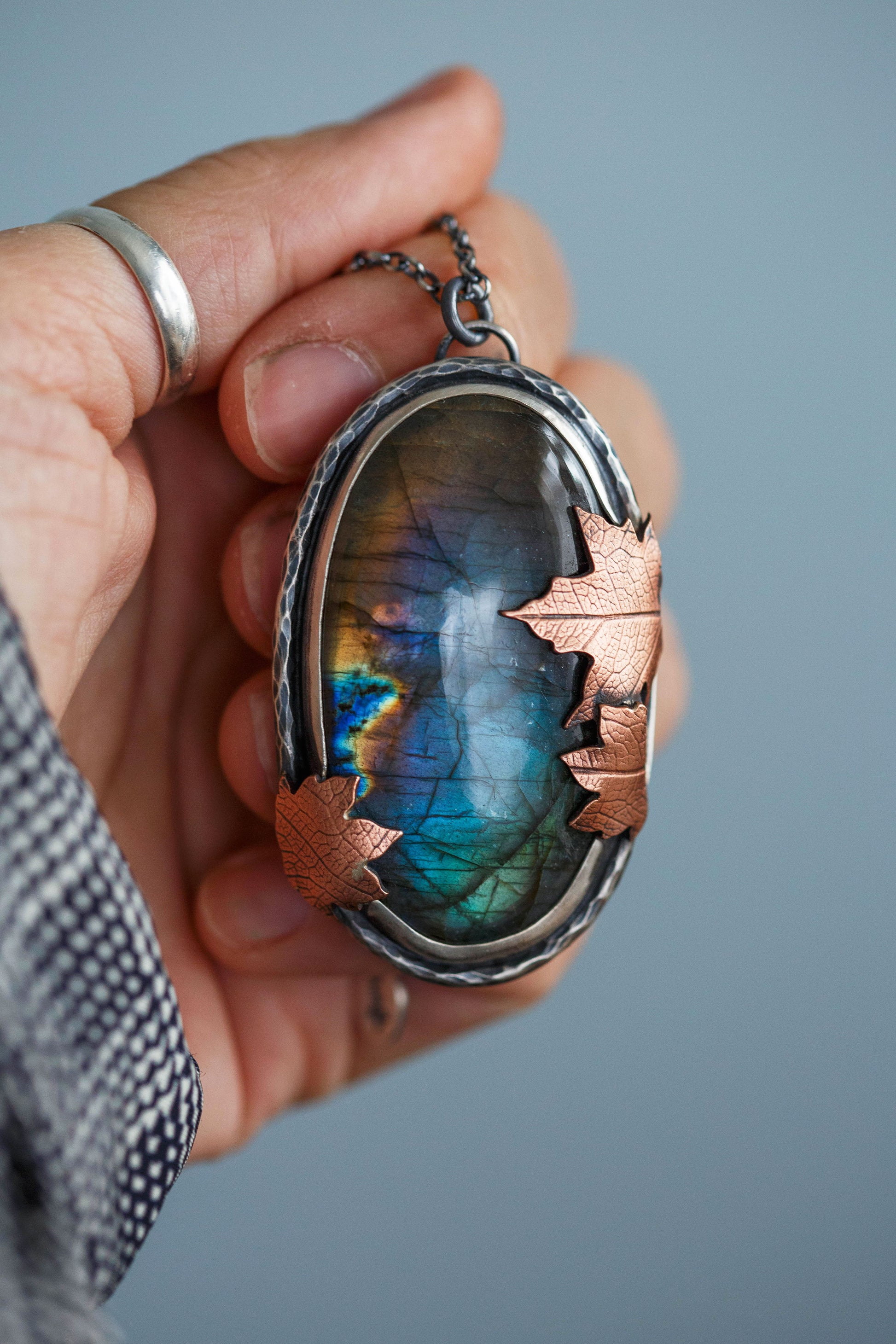 Each flashing labradorite gemstone is held by straight sterling silver bezel. Surrounding the gemstones are hand-textured branch borders. And gently draping over the stones are carefully sawn copper leaves with a leaf-print taken from real leaves.