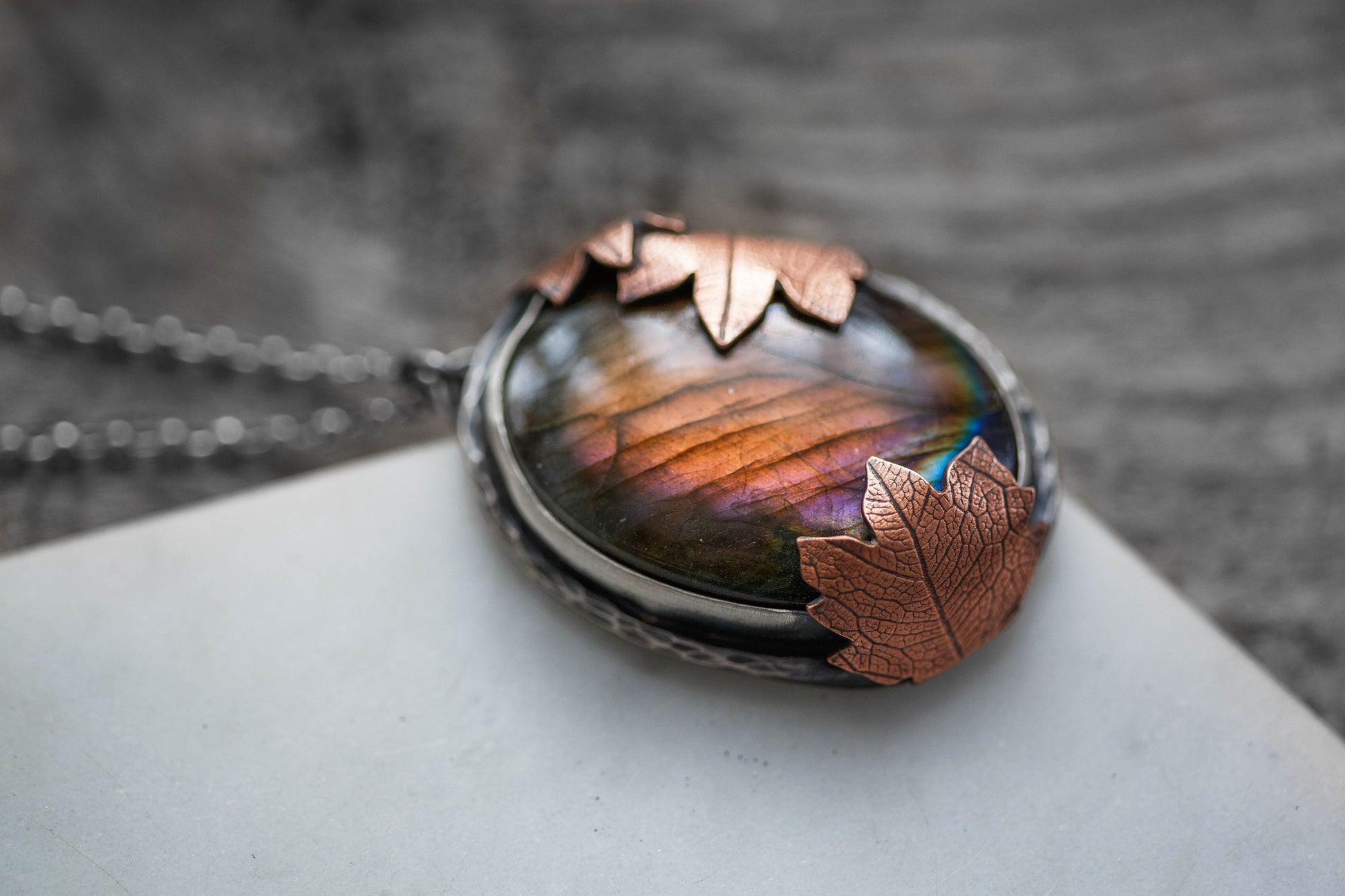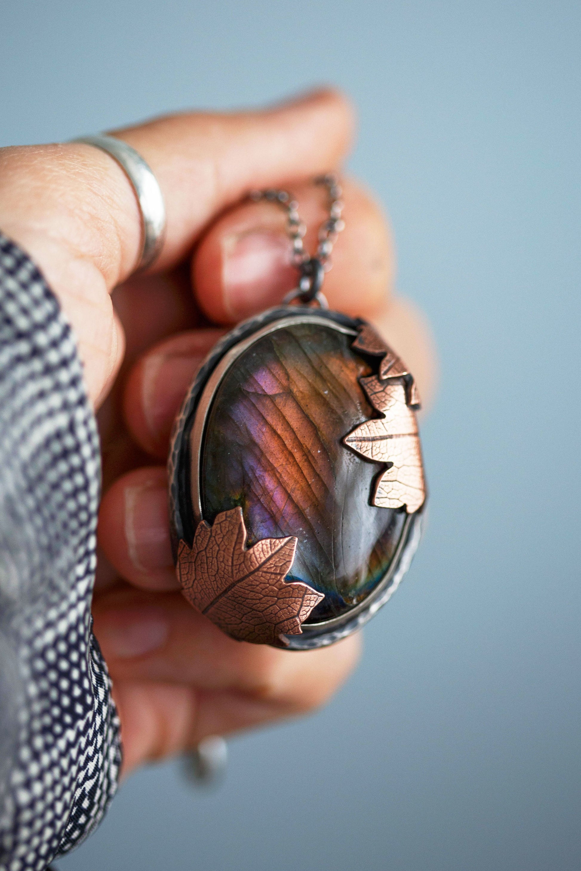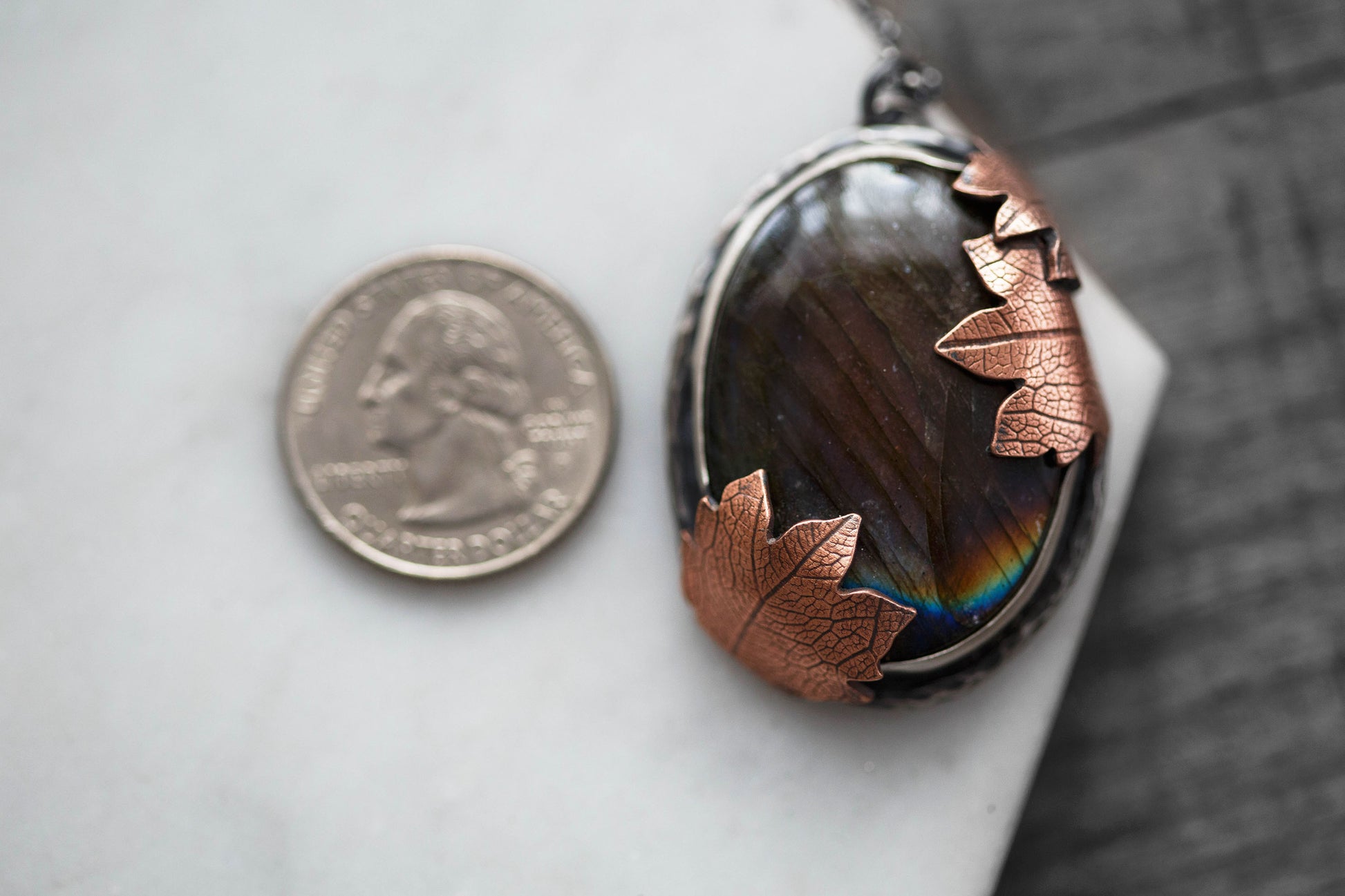 Each flashing labradorite gemstone is held by straight sterling silver bezel. Surrounding the gemstones are hand-textured branch borders. And gently draping over the stones are carefully sawn copper leaves with a leaf-print taken from real leaves.