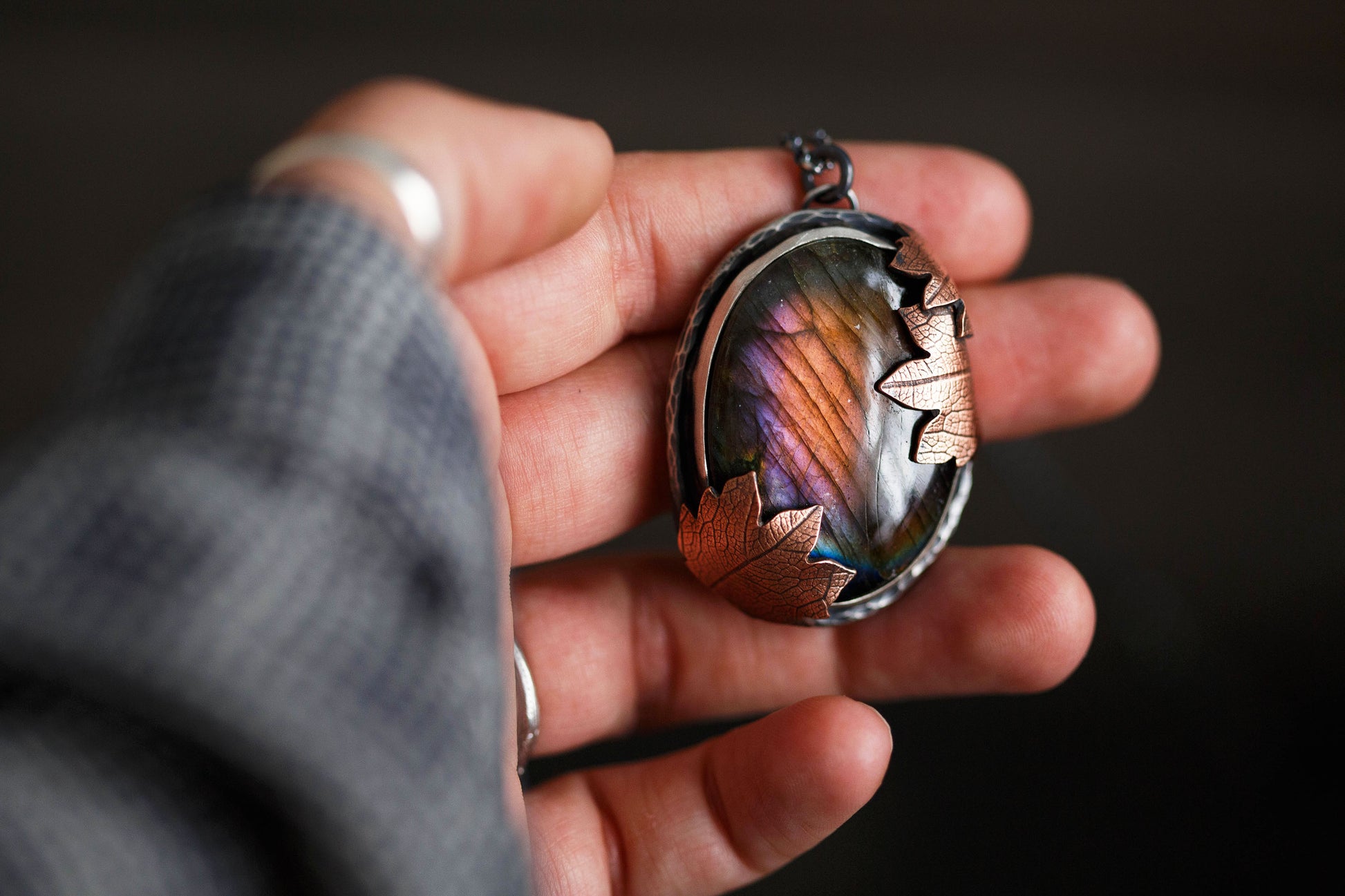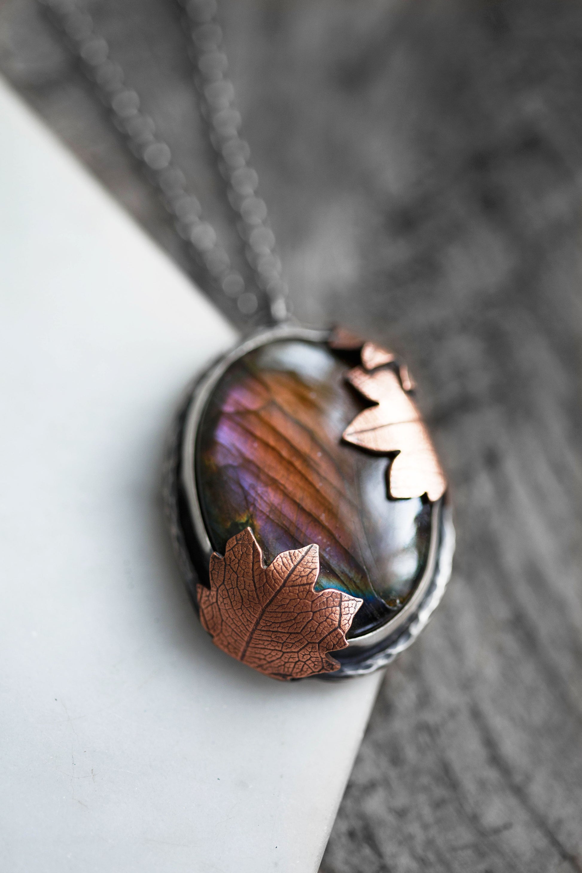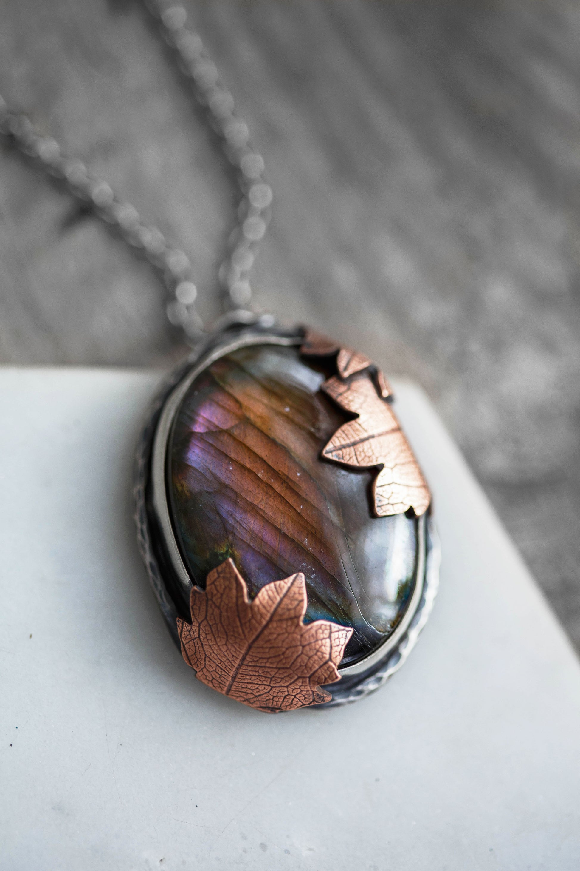 Each flashing labradorite gemstone is held by straight sterling silver bezel. Surrounding the gemstones are hand-textured branch borders. And gently draping over the stones are carefully sawn copper leaves with a leaf-print taken from real leaves.
