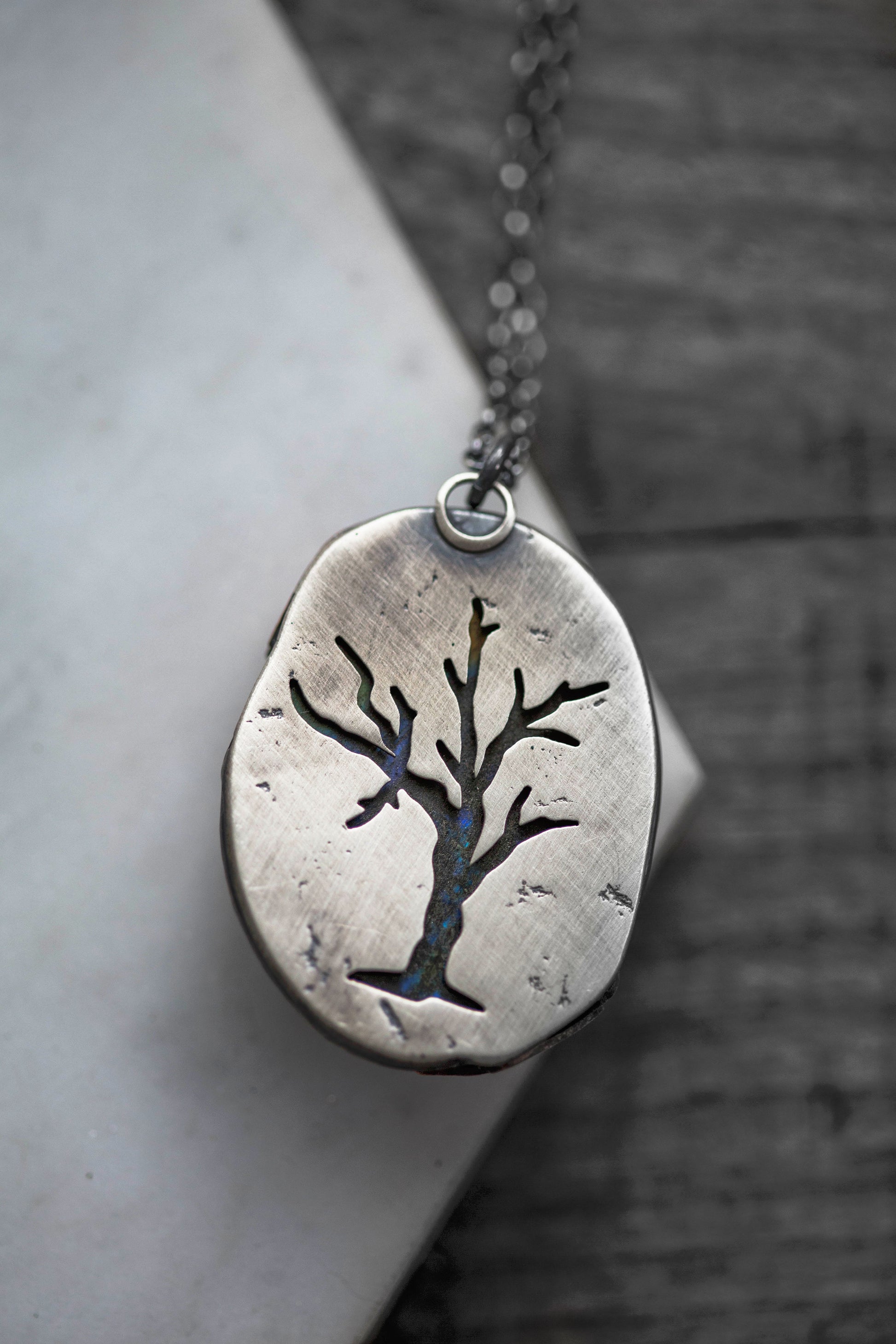 This pendant has been aged and hand-polished for a textured, organic look, and to bring out the lowlights and accent the stone.