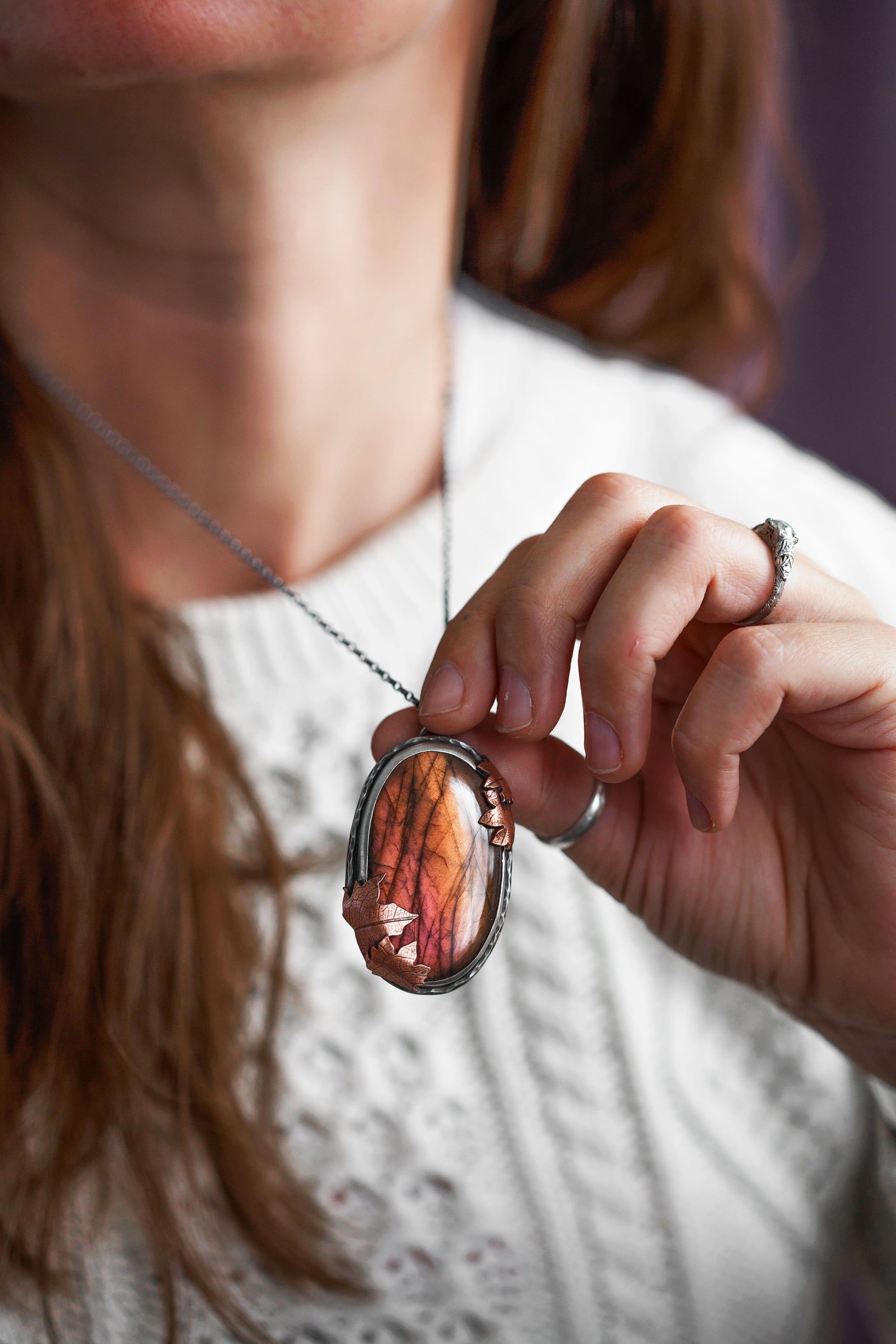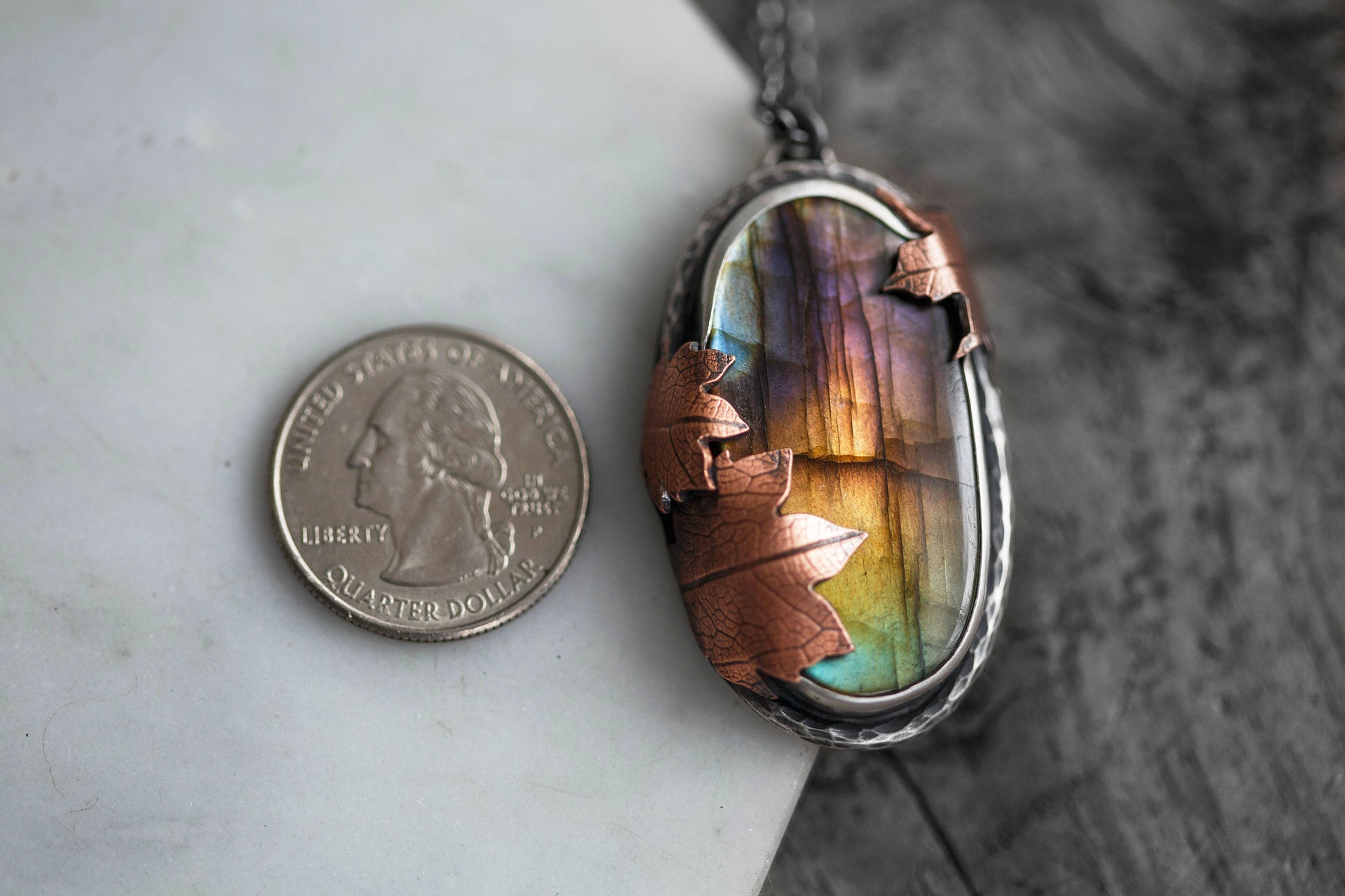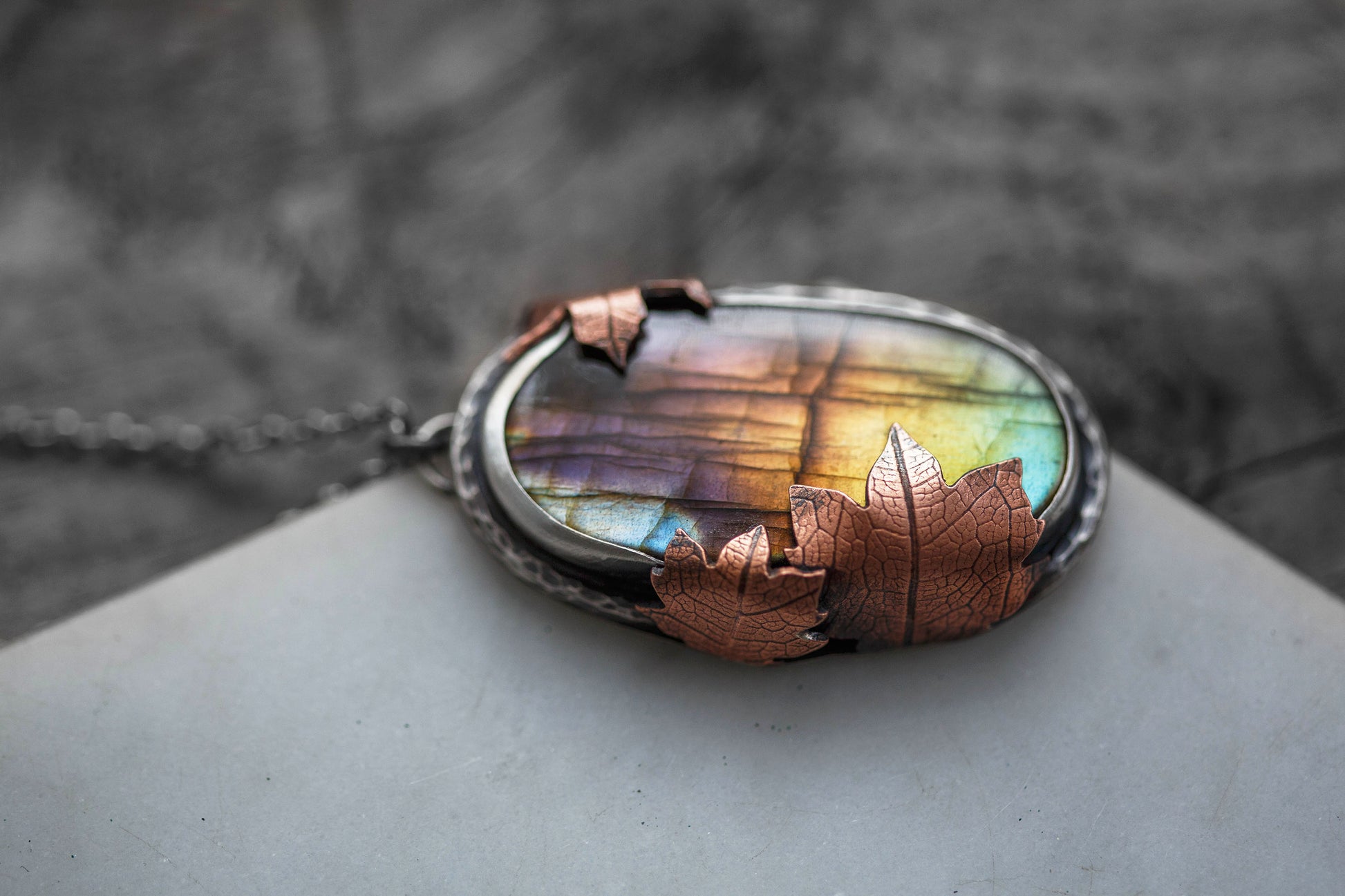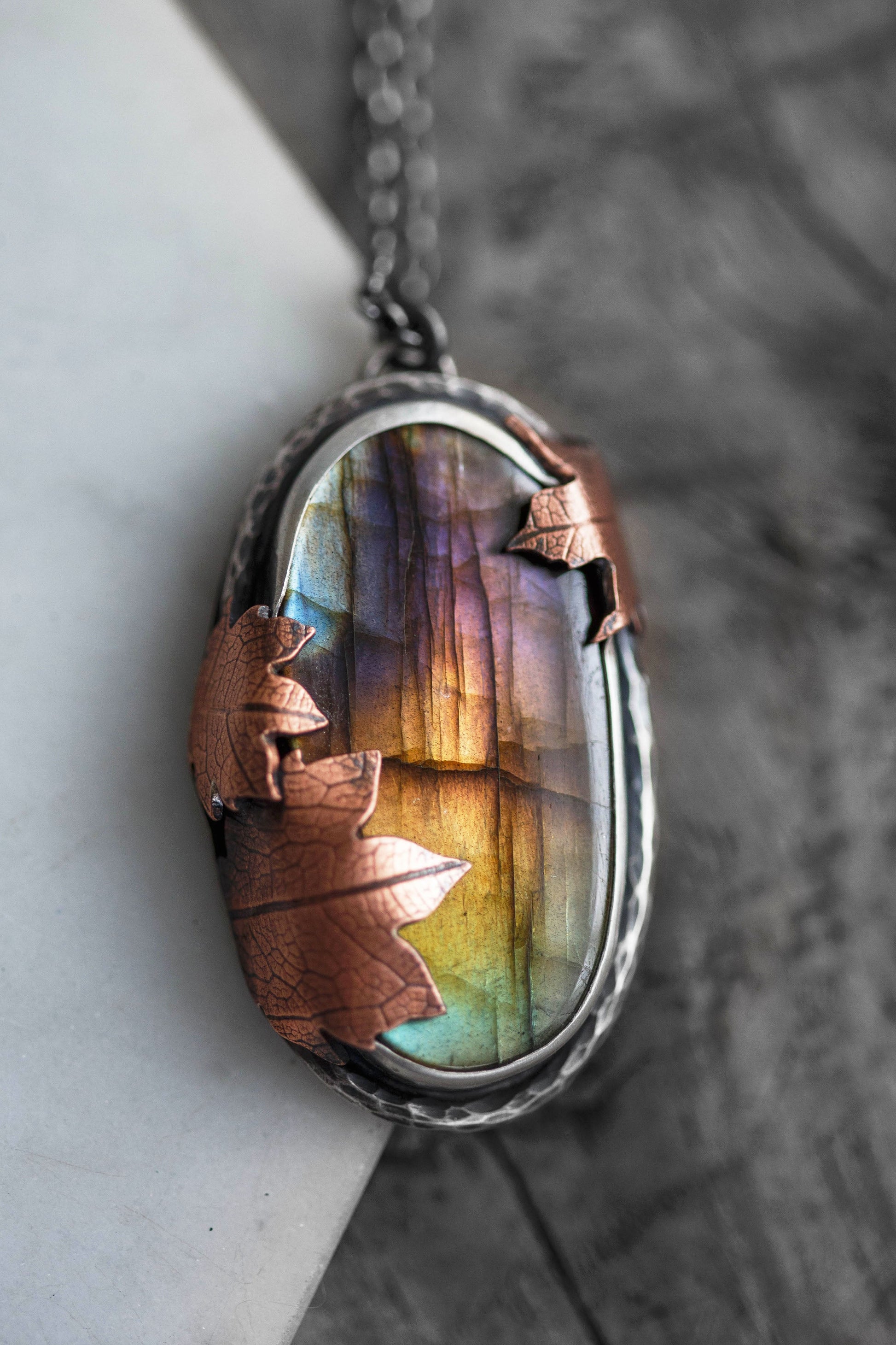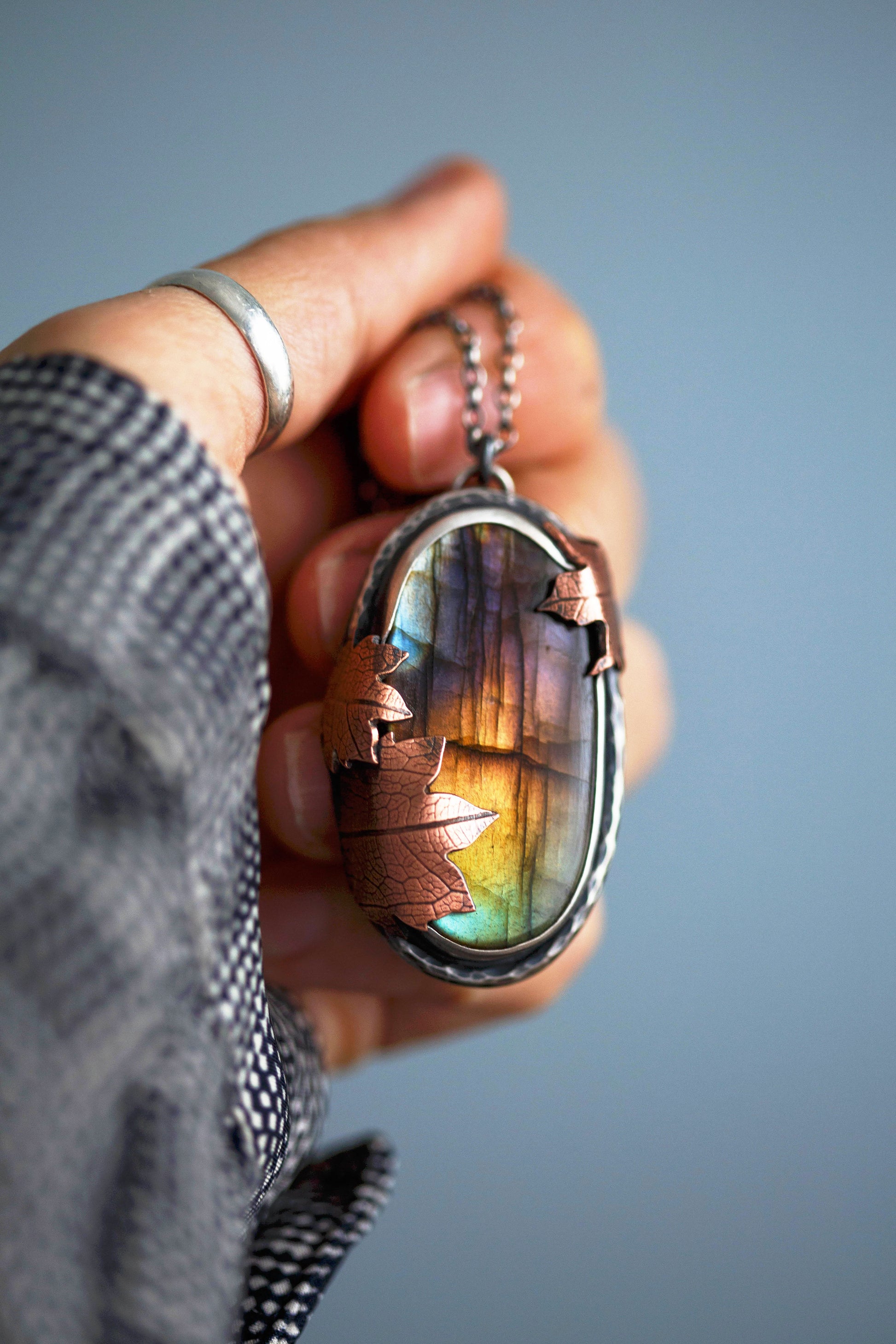 Each flashing labradorite gemstone is held by straight sterling silver bezel. Surrounding the gemstones are hand-textured branch borders. And gently draping over the stones are carefully sawn copper leaves with a leaf-print taken from real leaves.