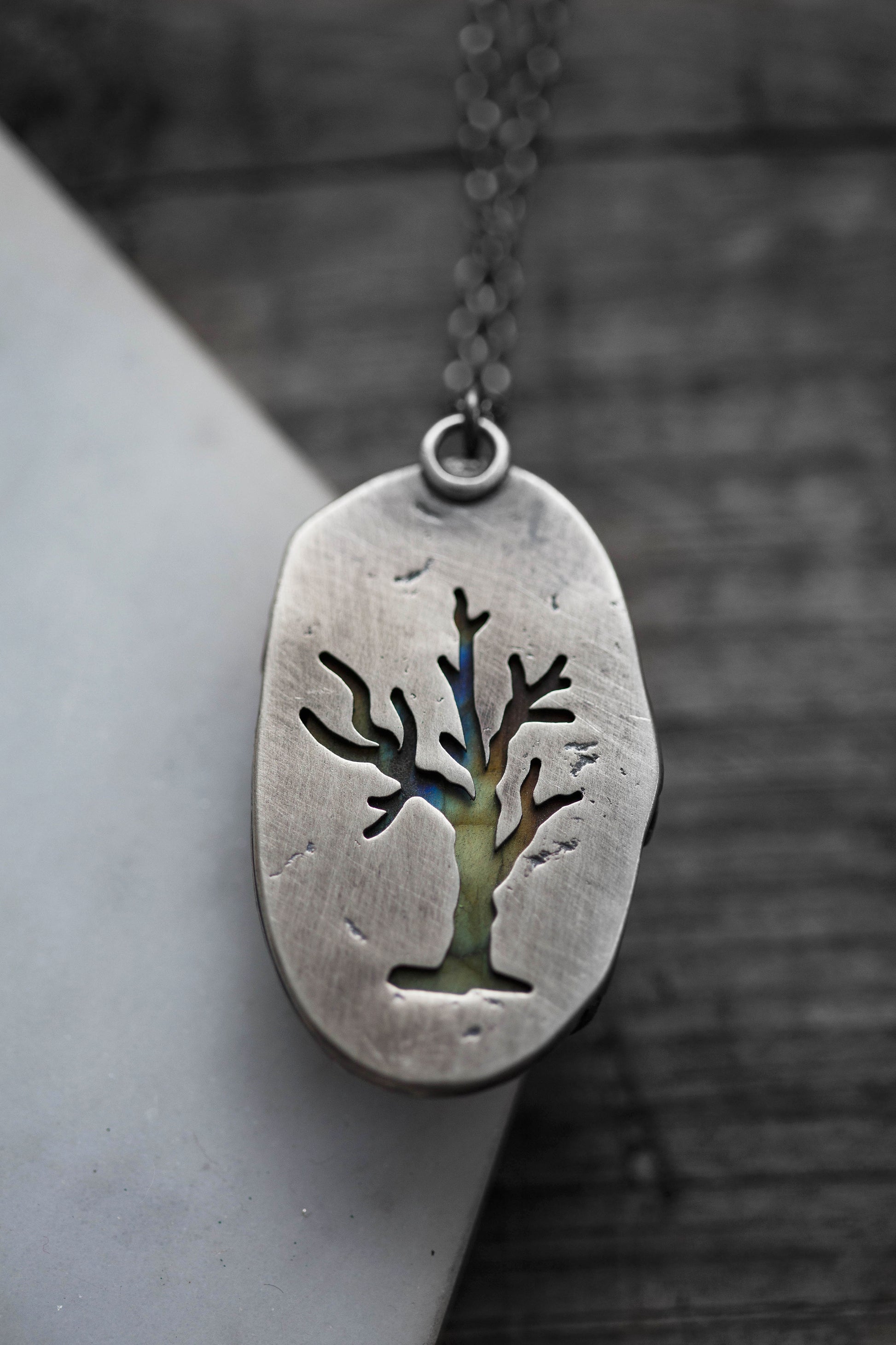 The backs of the pendants feature carefully sawn leafless trees revealing the backs of the stones. As with the moon pendants, some of the windows reveal bright, flashing labradorite backs, while others remain dark and furtive.