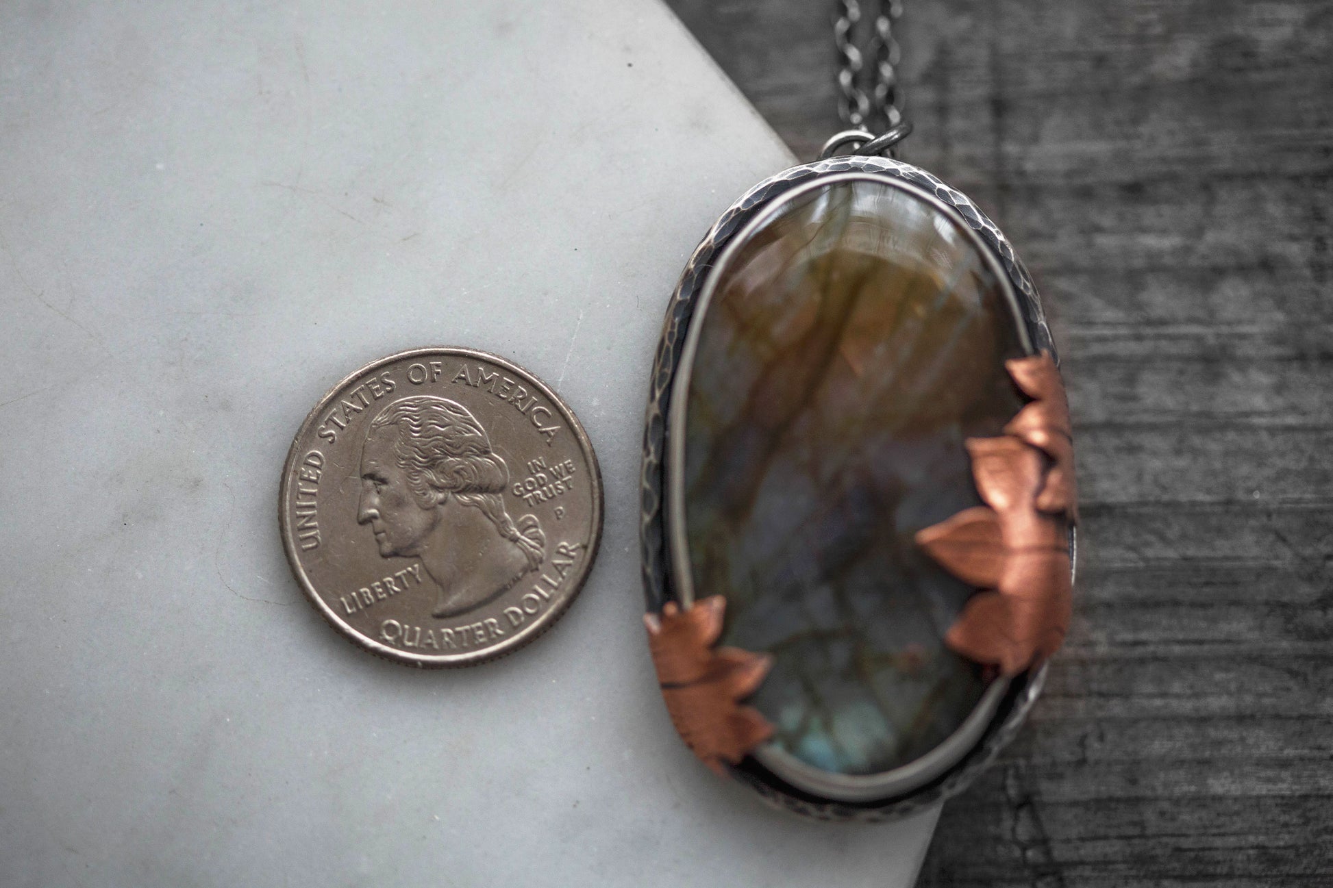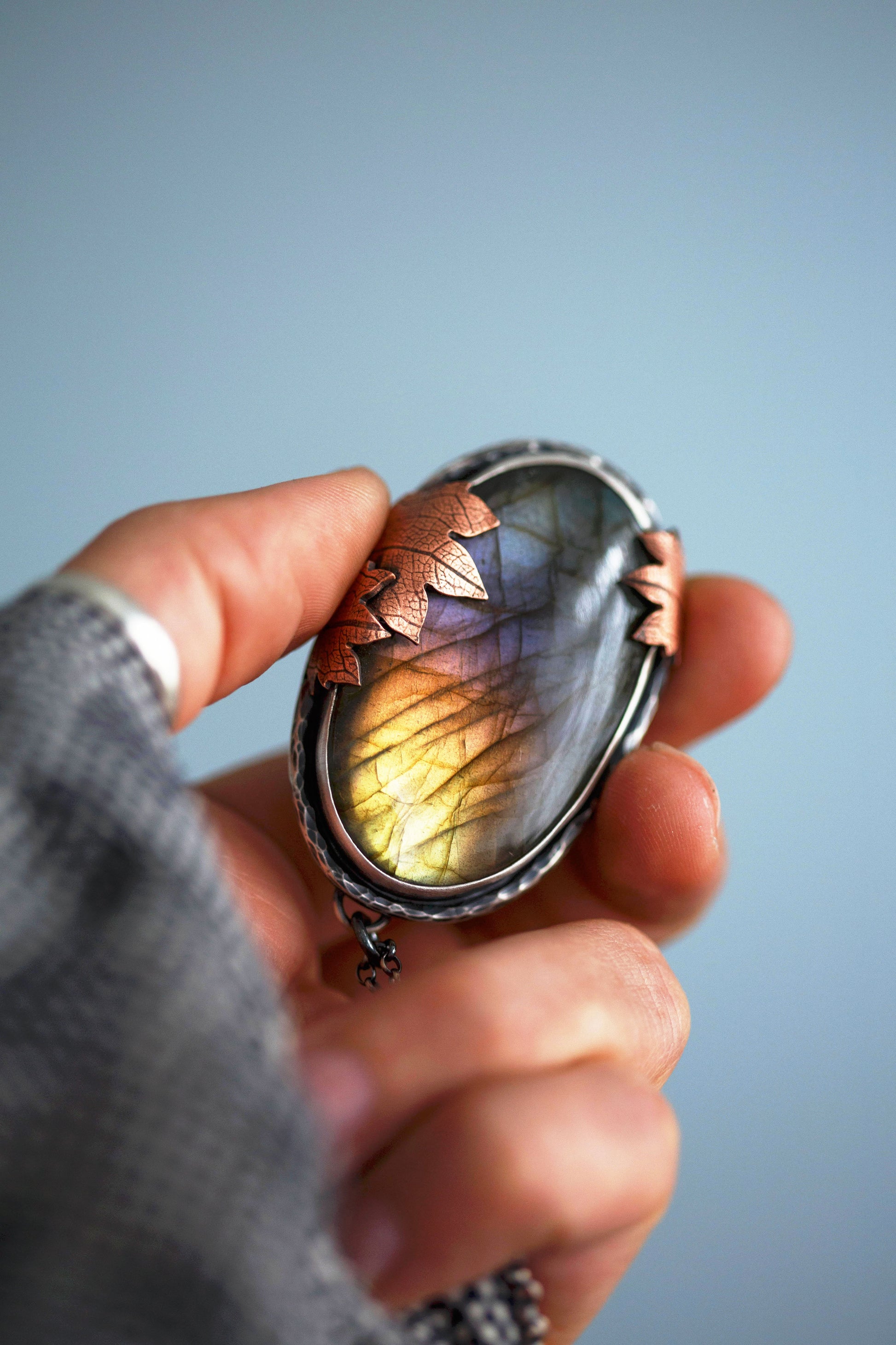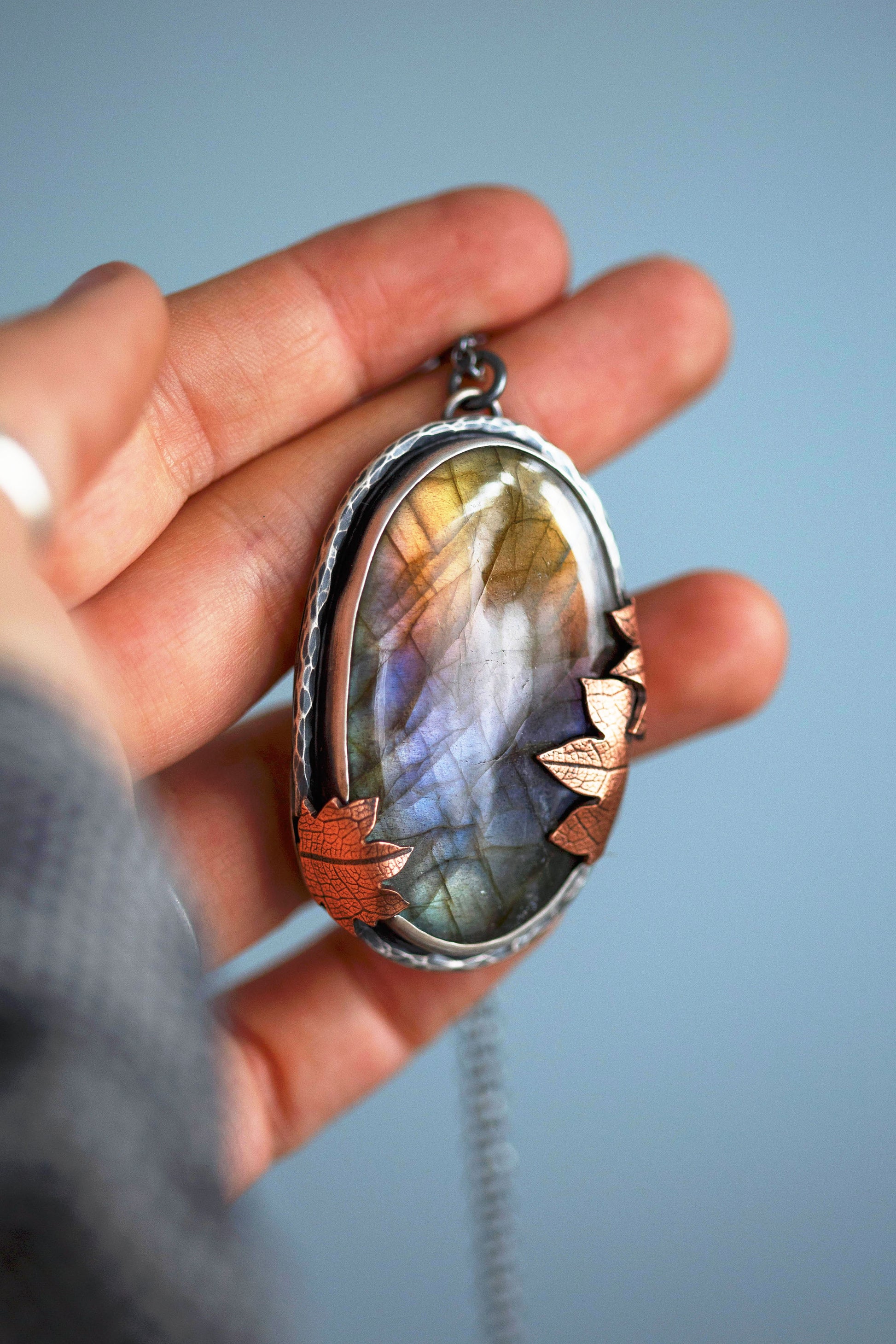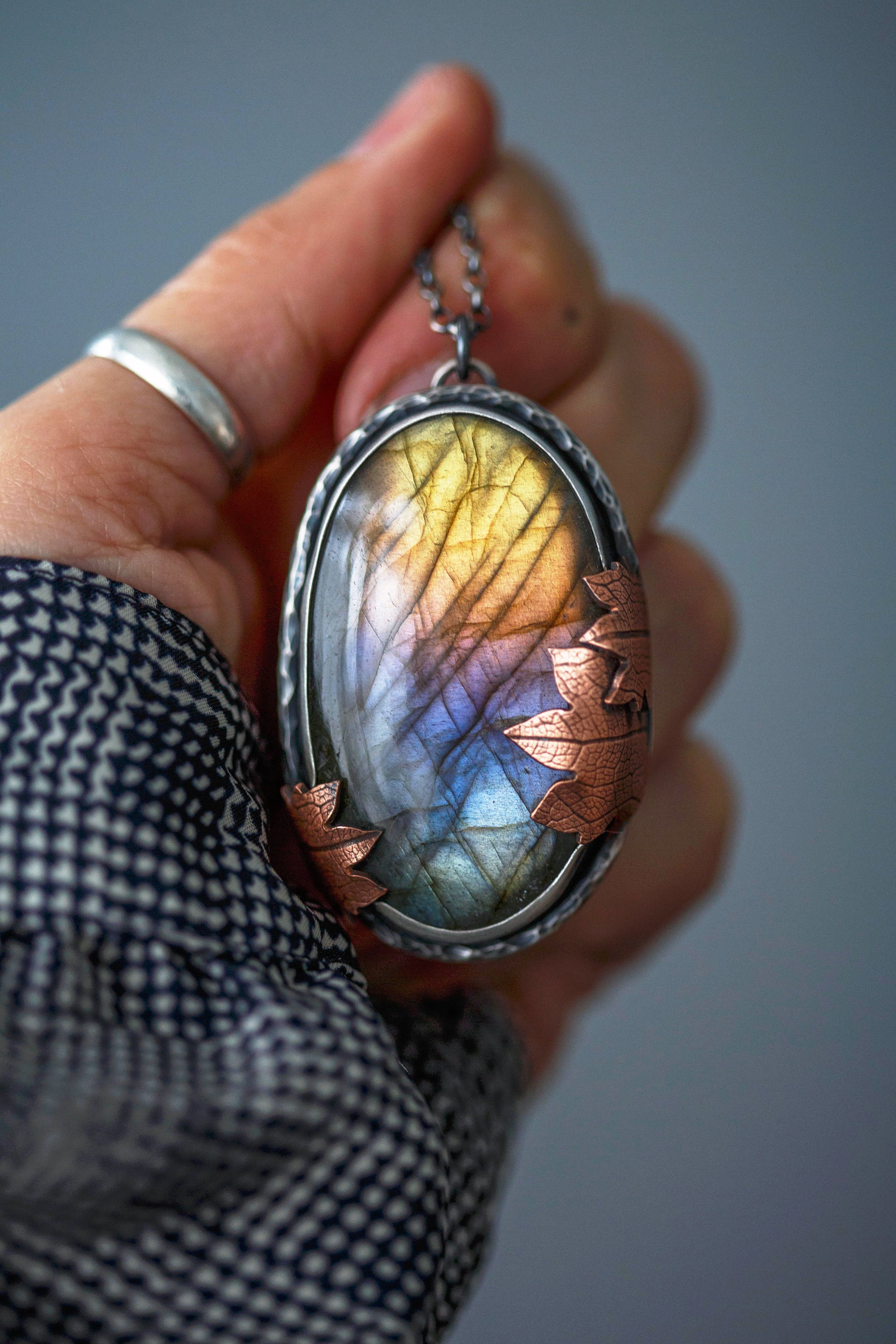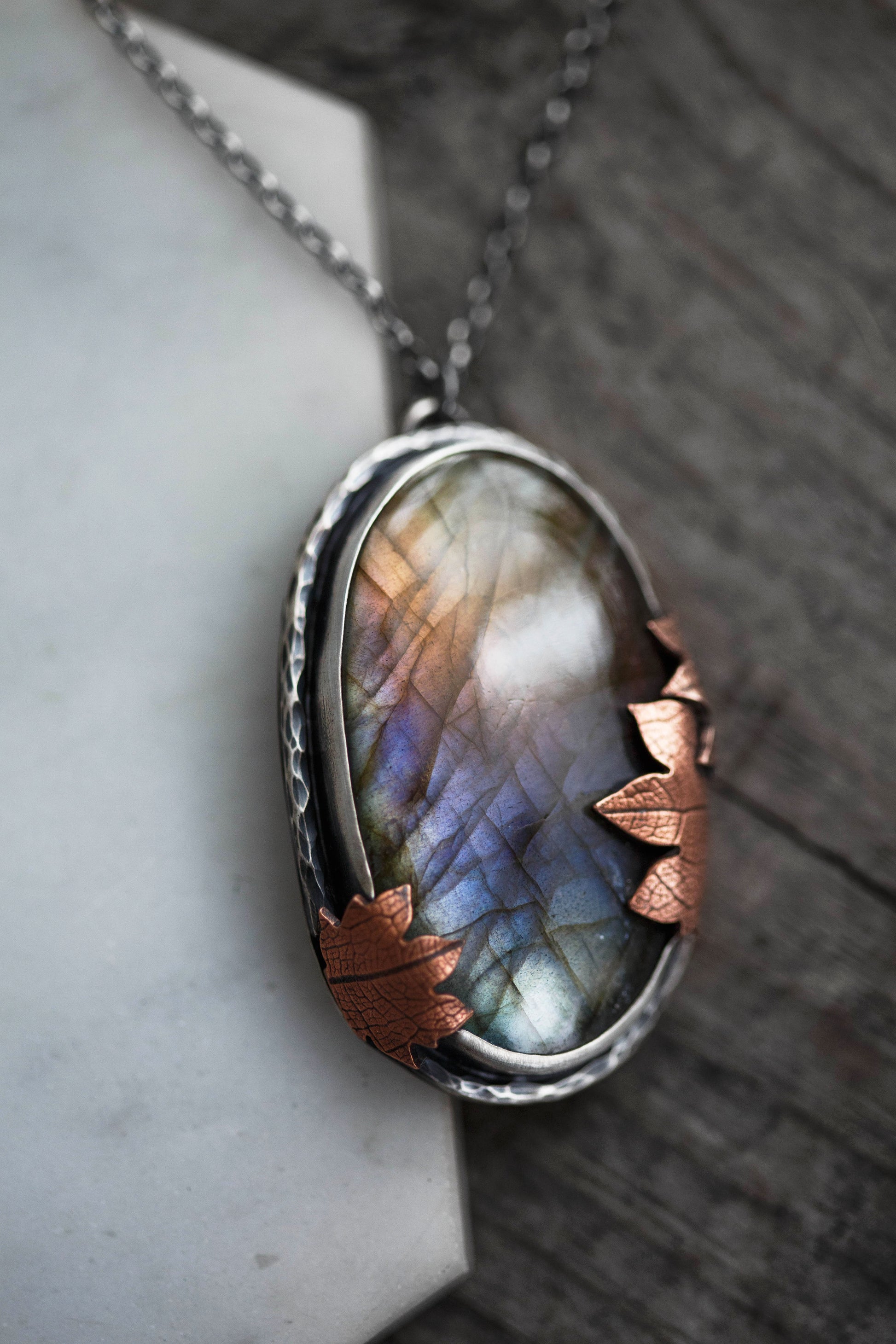 Each flashing labradorite gemstone is held by straight sterling silver bezel. Surrounding the gemstones are hand-textured branch borders. And gently draping over the stones are carefully sawn copper leaves with a leaf-print taken from real leaves.