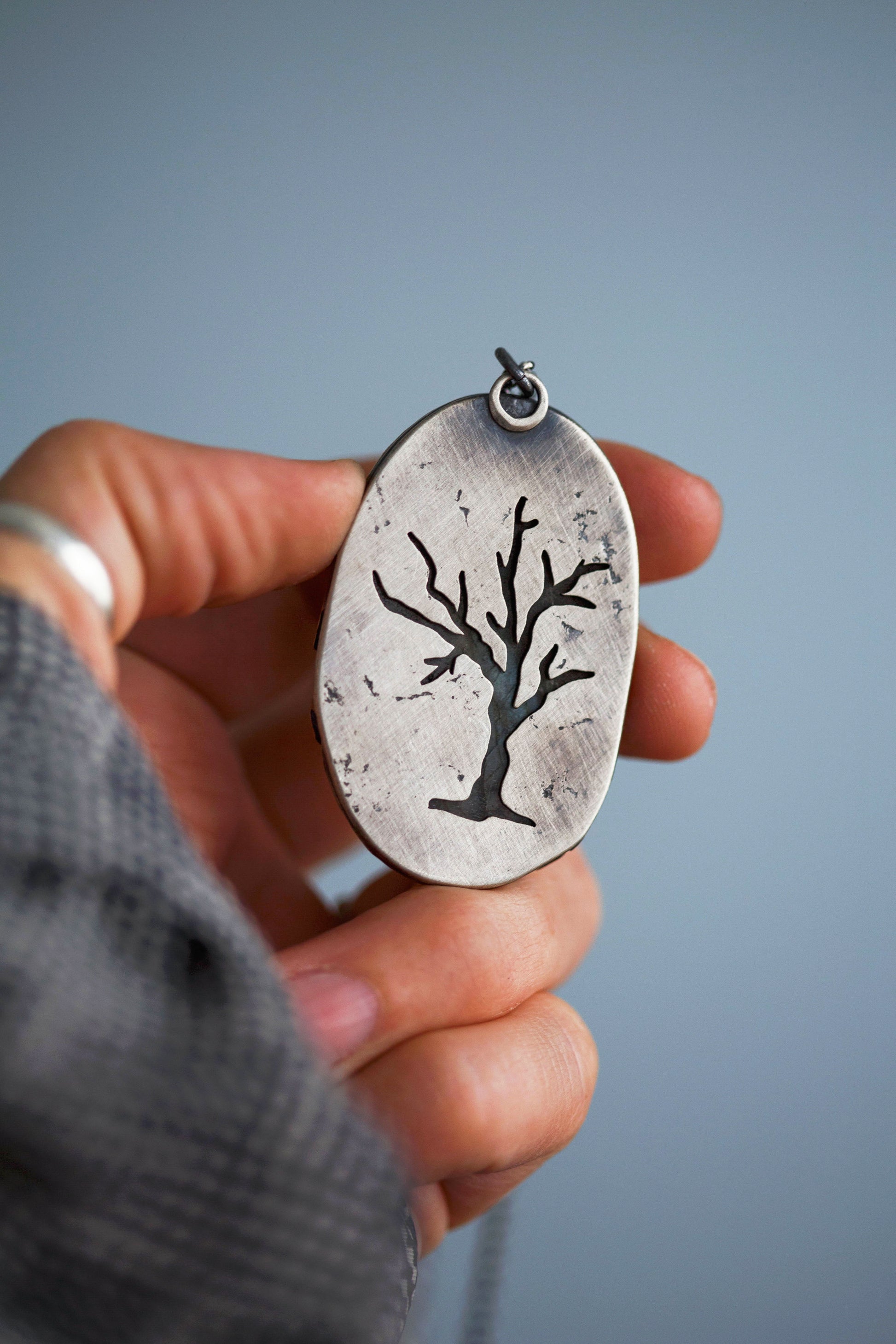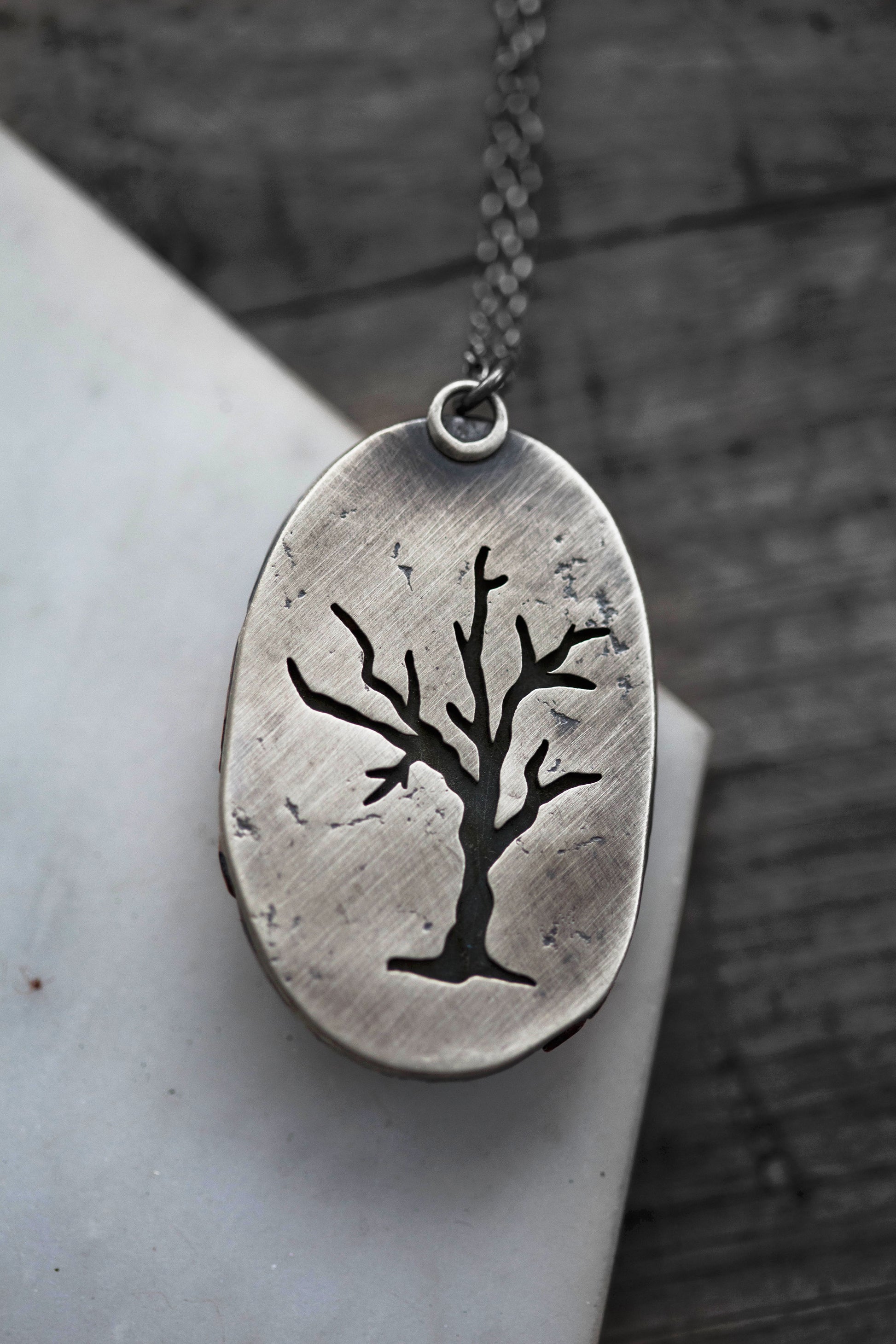 This pendant has been aged and hand-polished for a textured, organic look, and to bring out the lowlights and accent the stone.