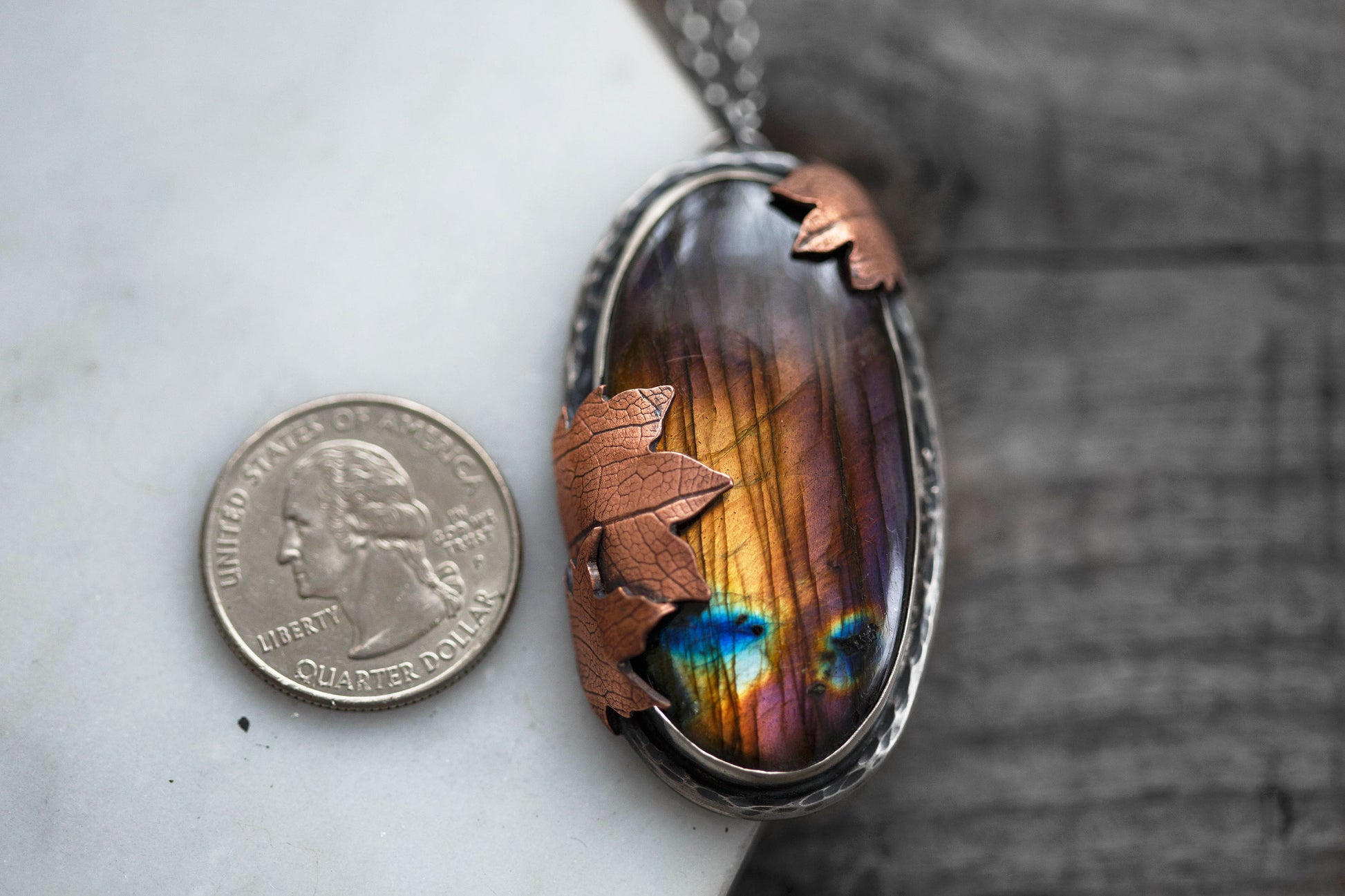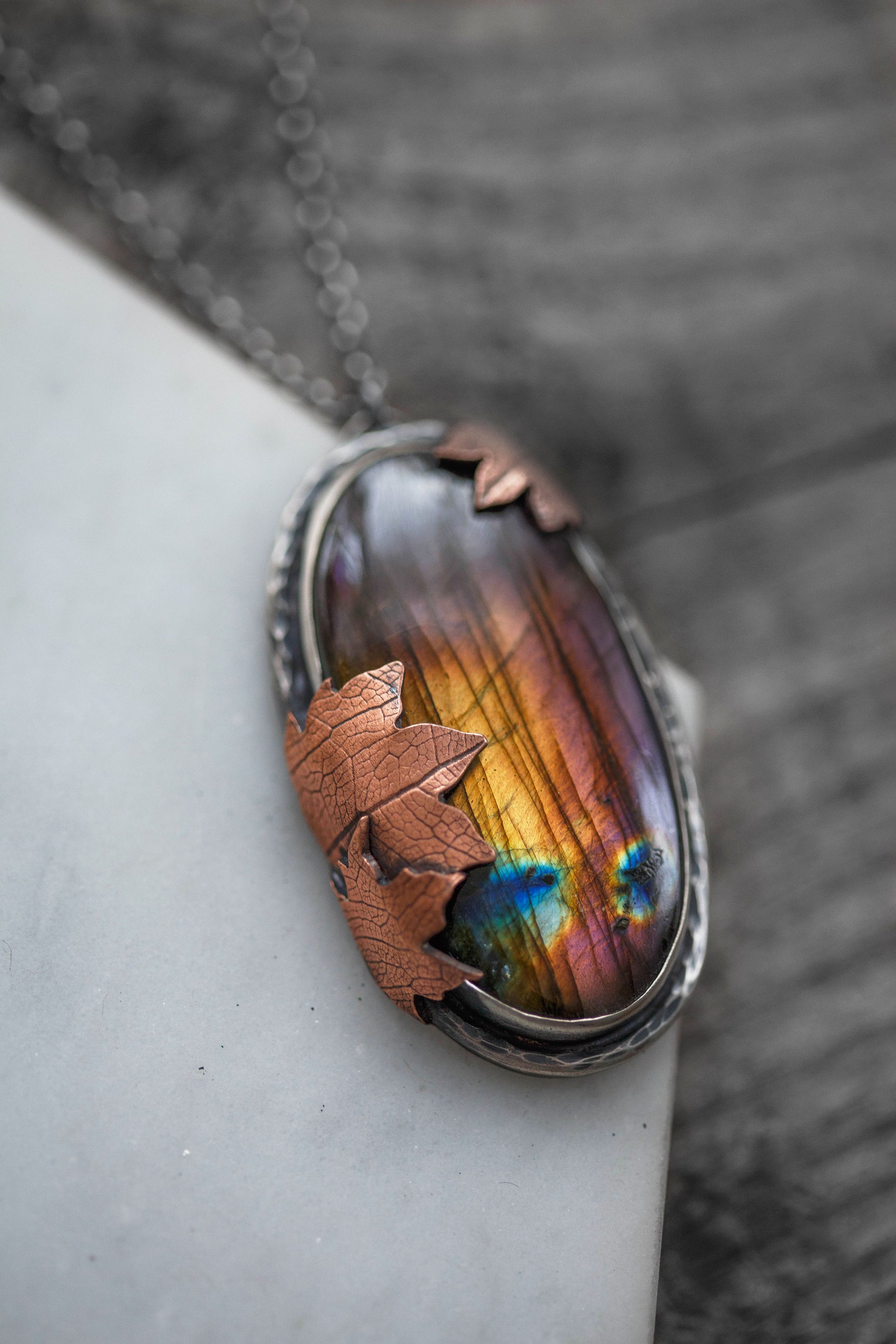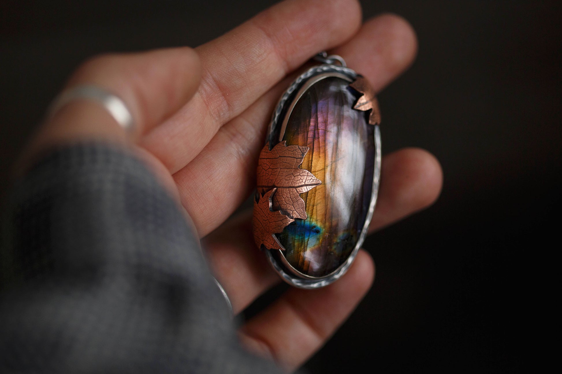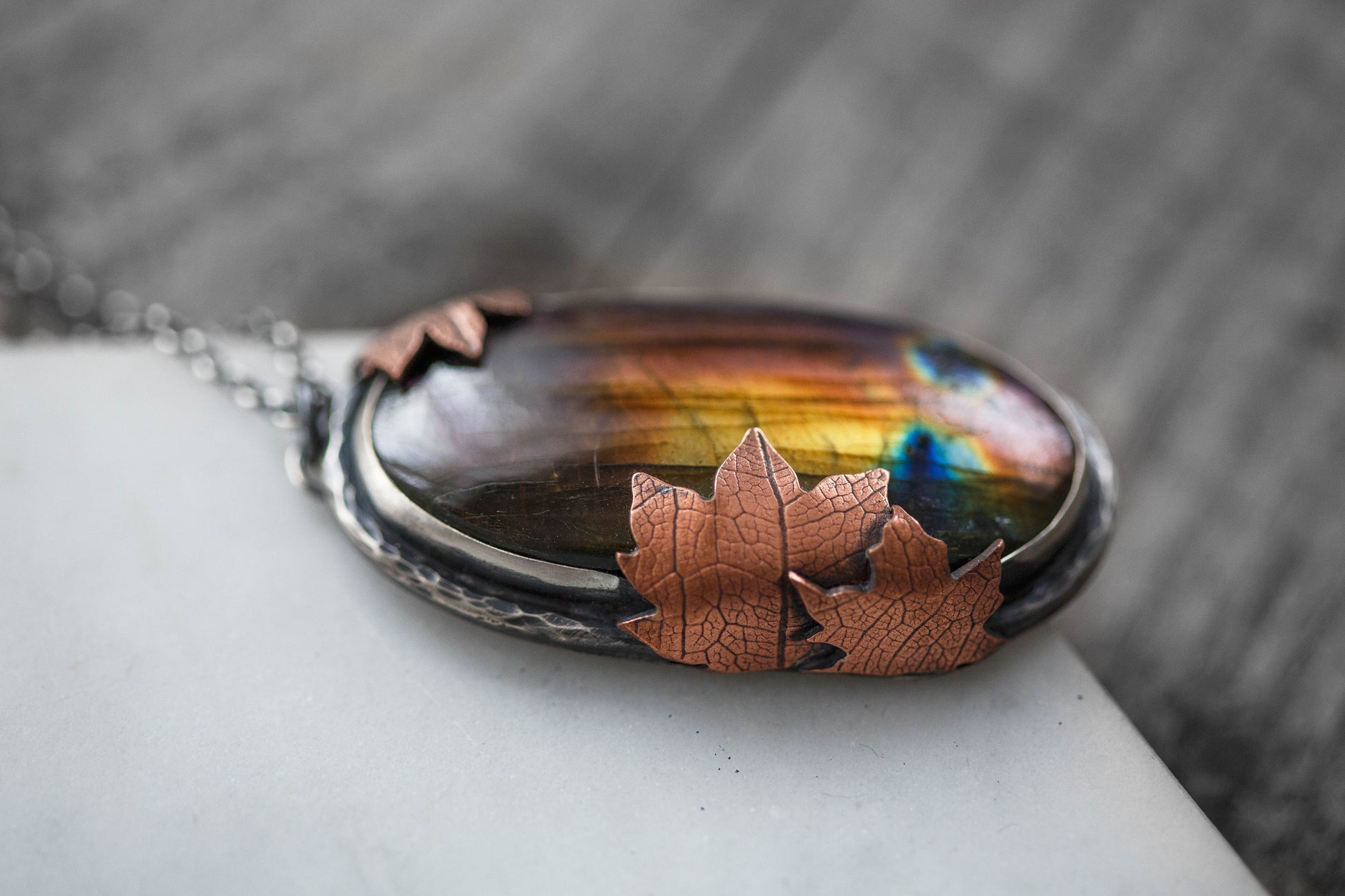 Each flashing labradorite gemstone is held by straight sterling silver bezel. Surrounding the gemstones are hand-textured branch borders. And gently draping over the stones are carefully sawn copper leaves with a leaf-print taken from real leaves.