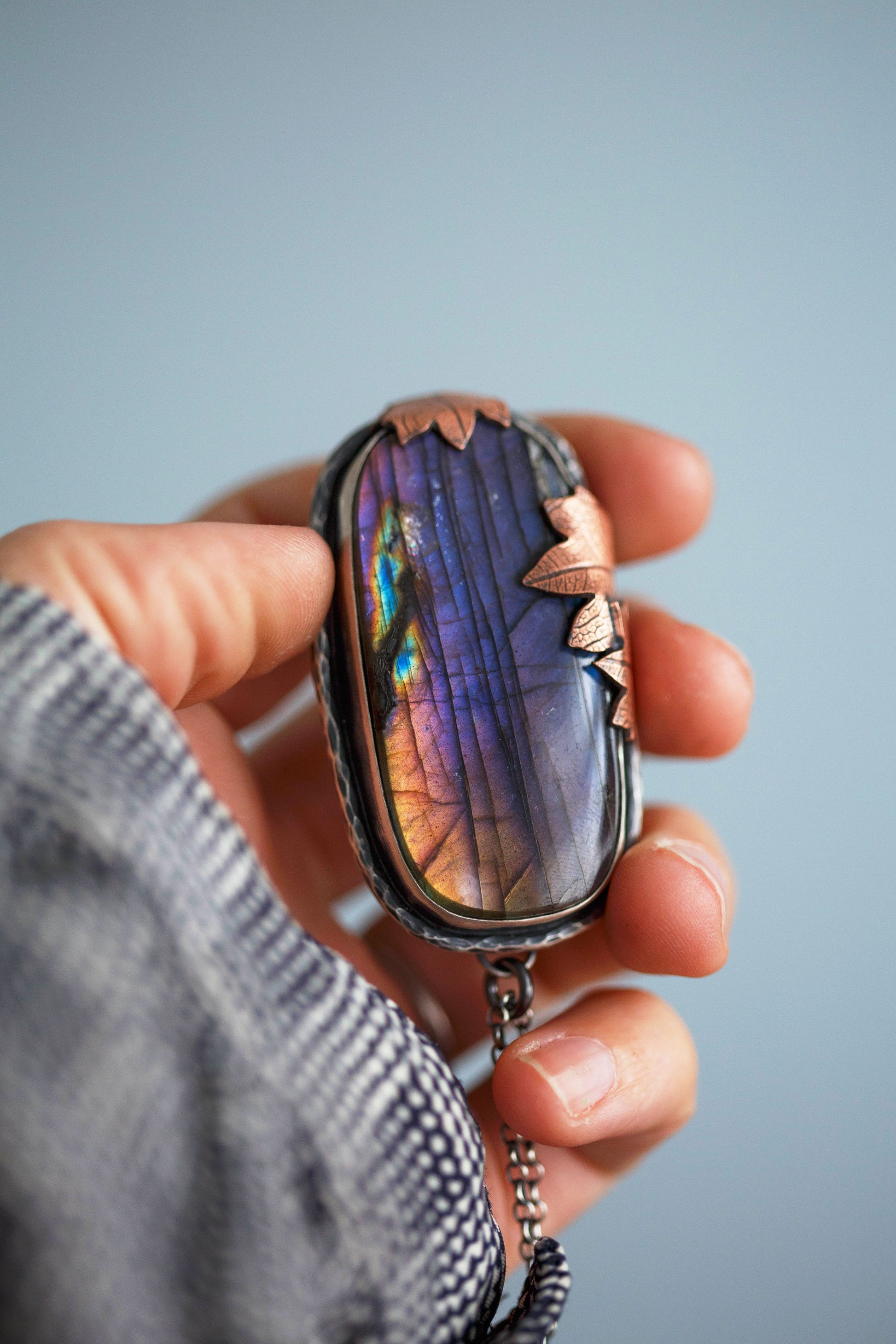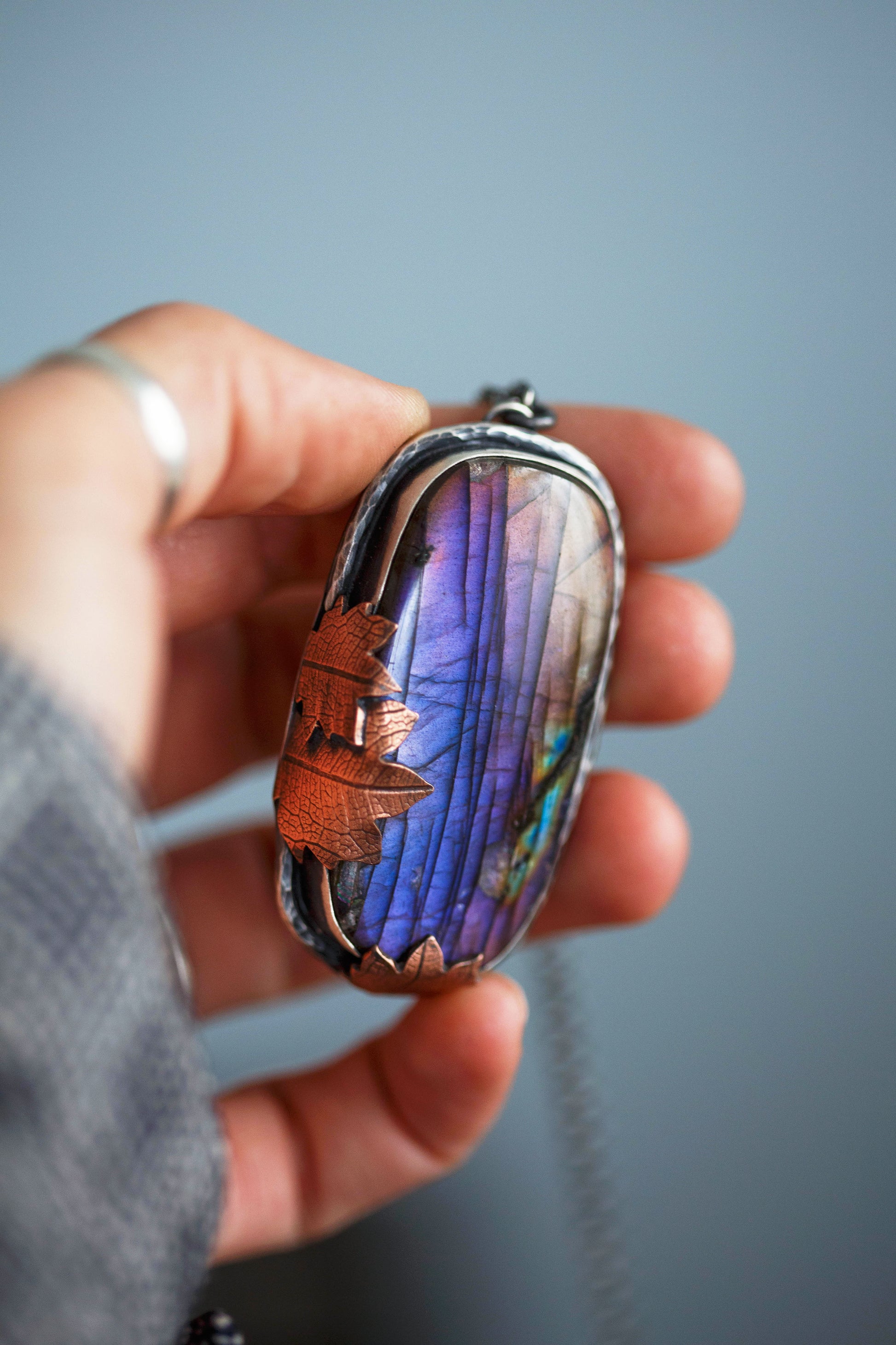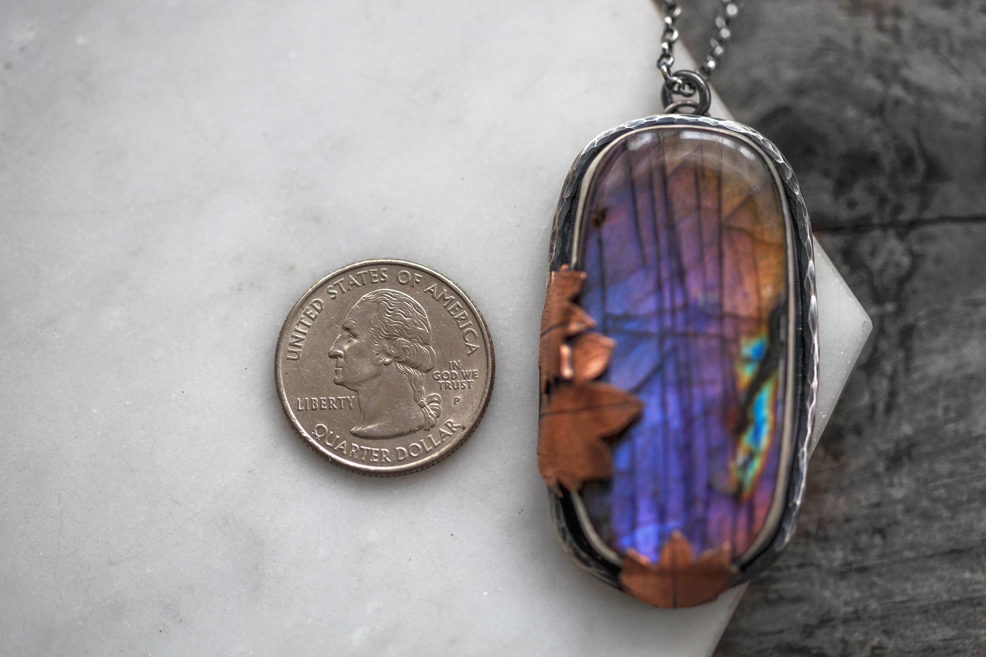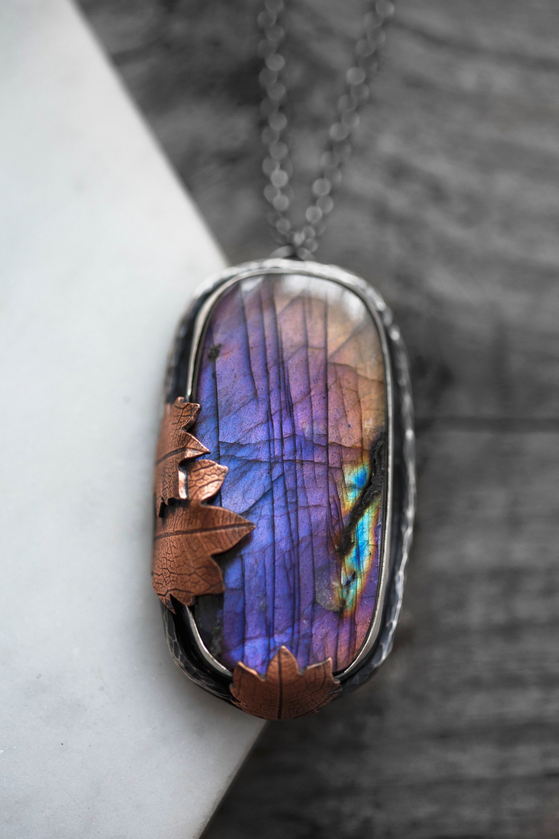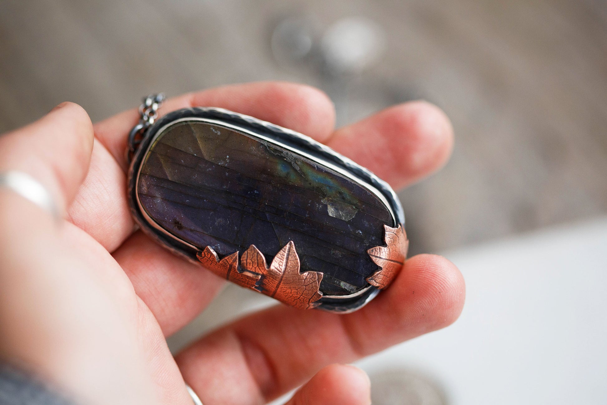 Each flashing labradorite gemstone is held by straight sterling silver bezel. Surrounding the gemstones are hand-textured branch borders. And gently draping over the stones are carefully sawn copper leaves with a leaf-print taken from real leaves.
