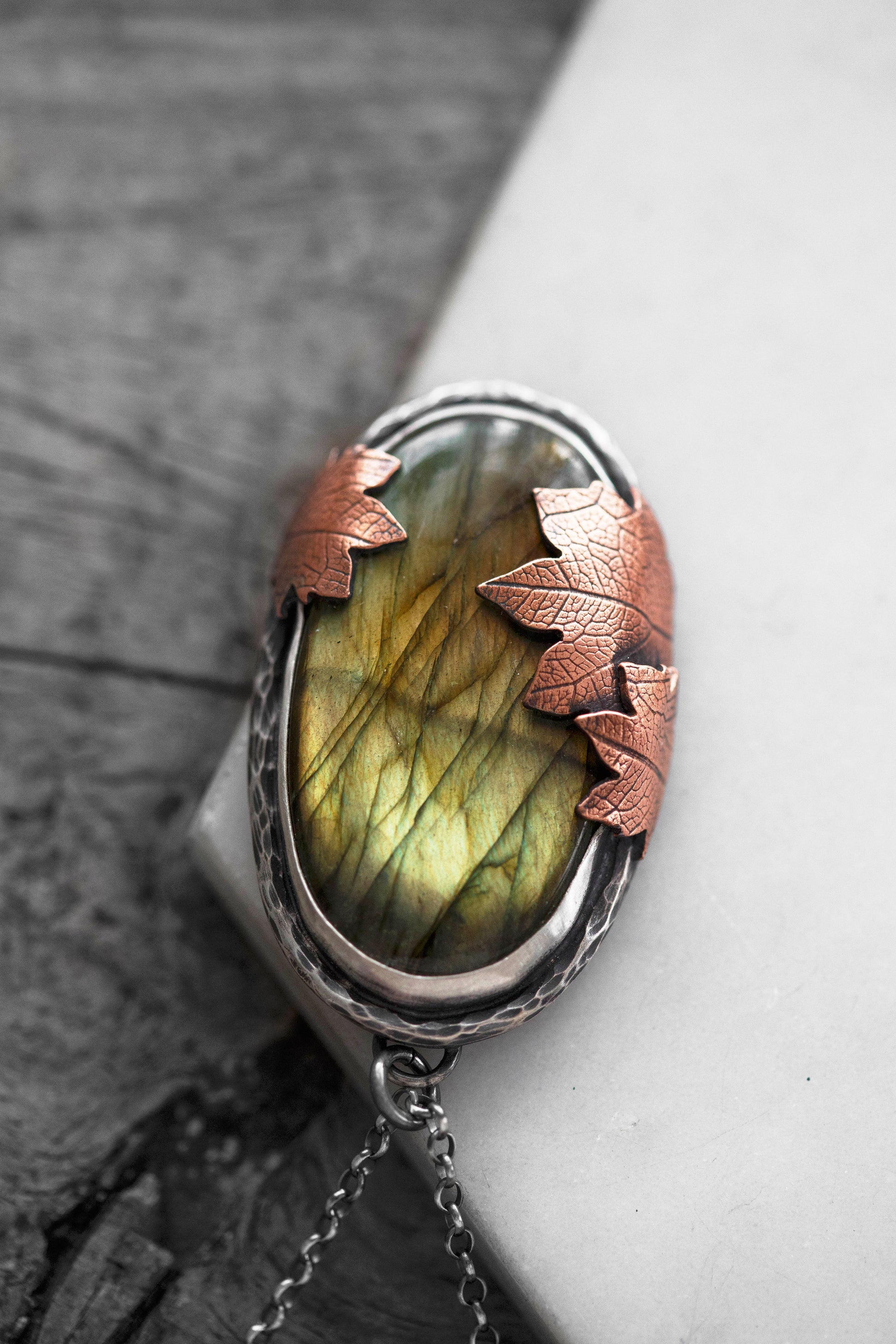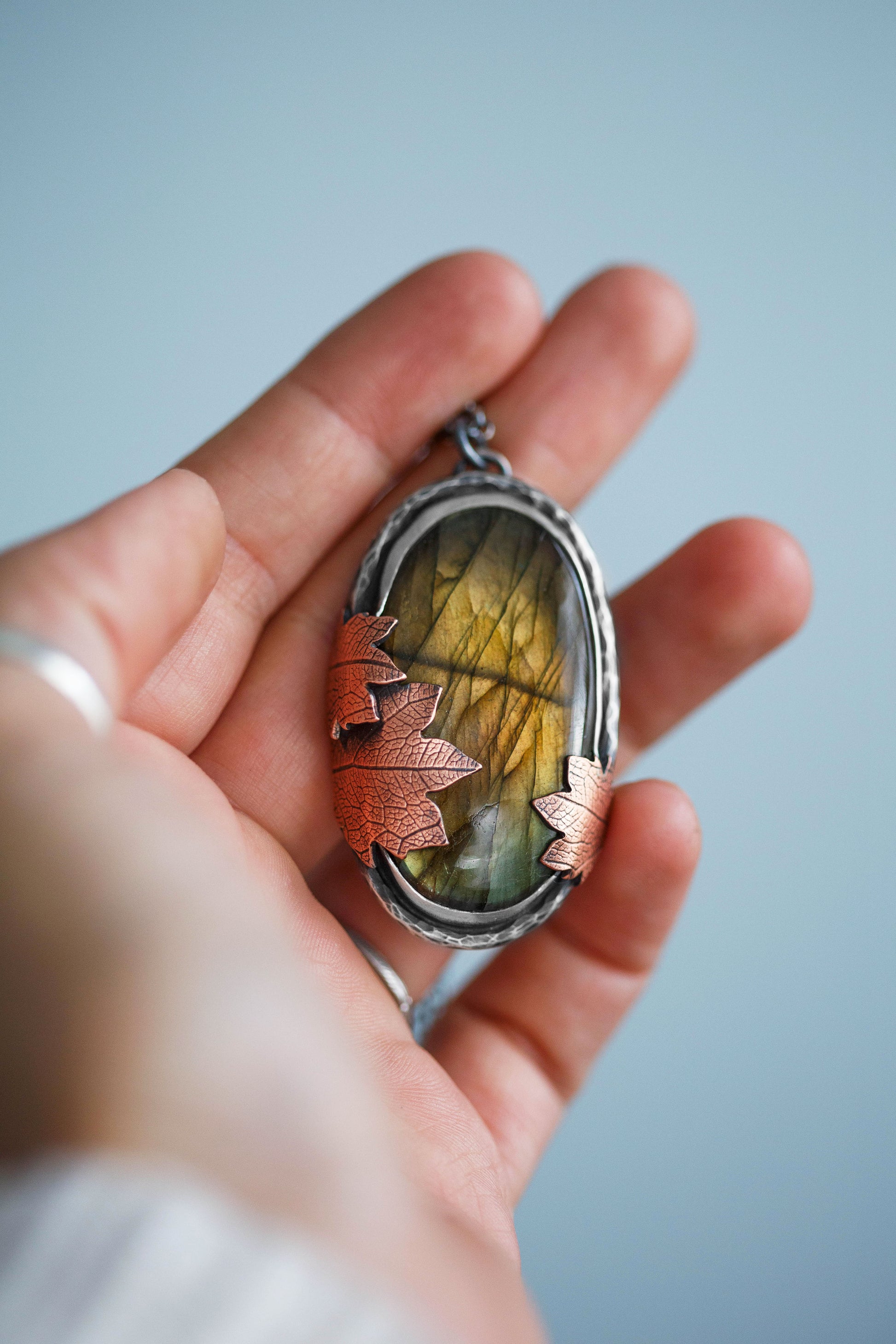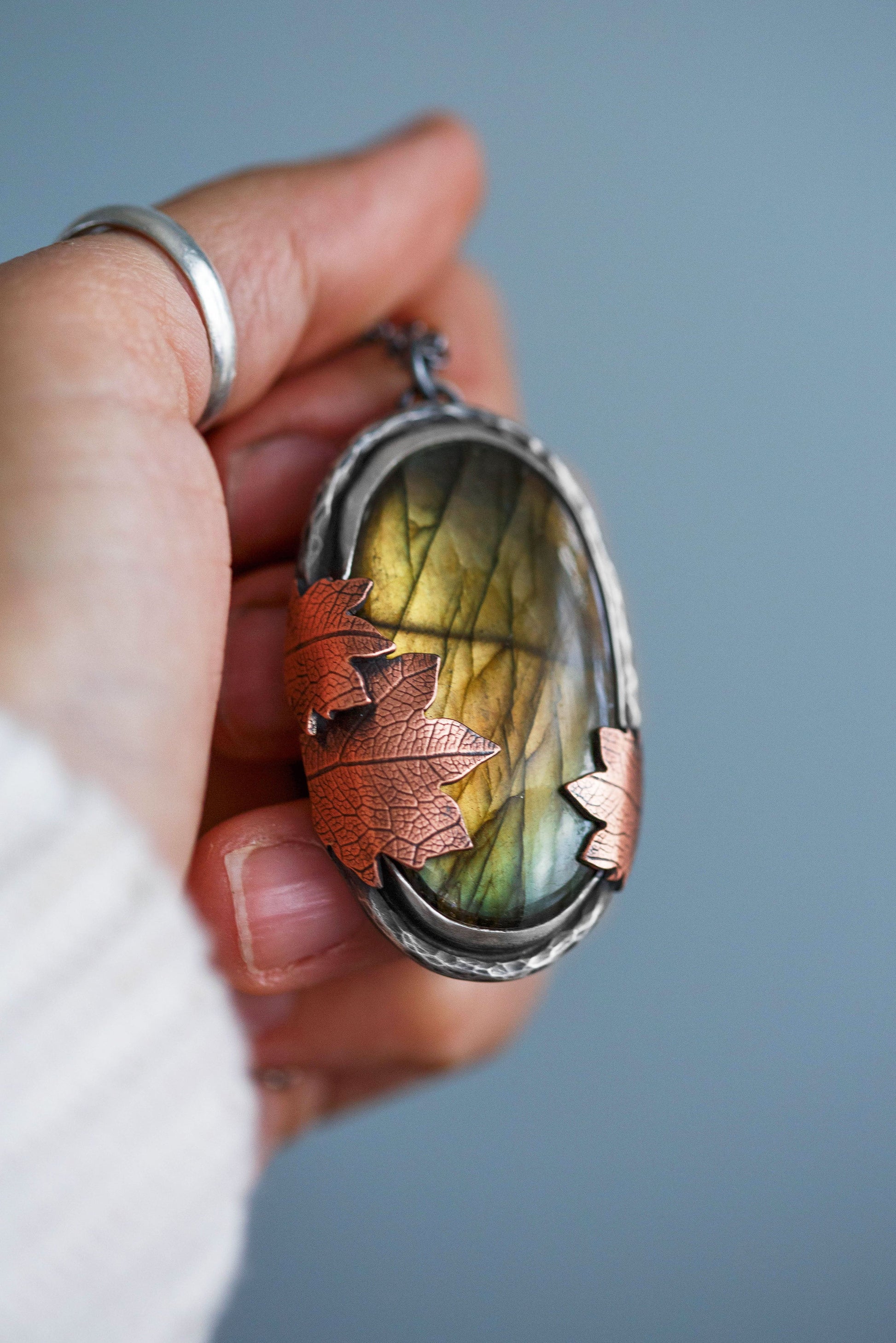 Each flashing labradorite gemstone is held by straight sterling silver bezel. Surrounding the gemstones are hand-textured branch borders. And gently draping over the stones are carefully sawn copper leaves with a leaf-print taken from real leaves.