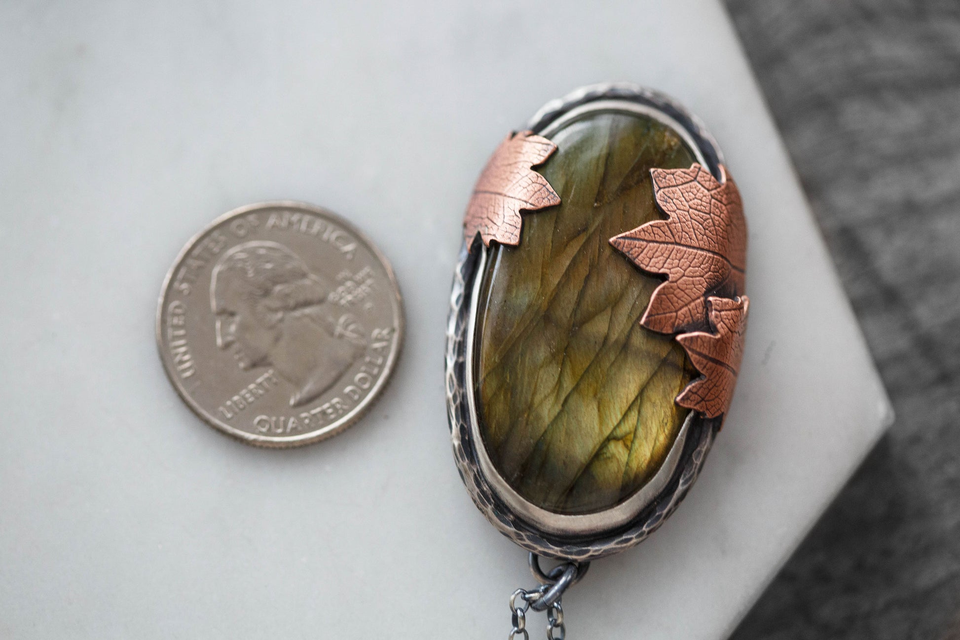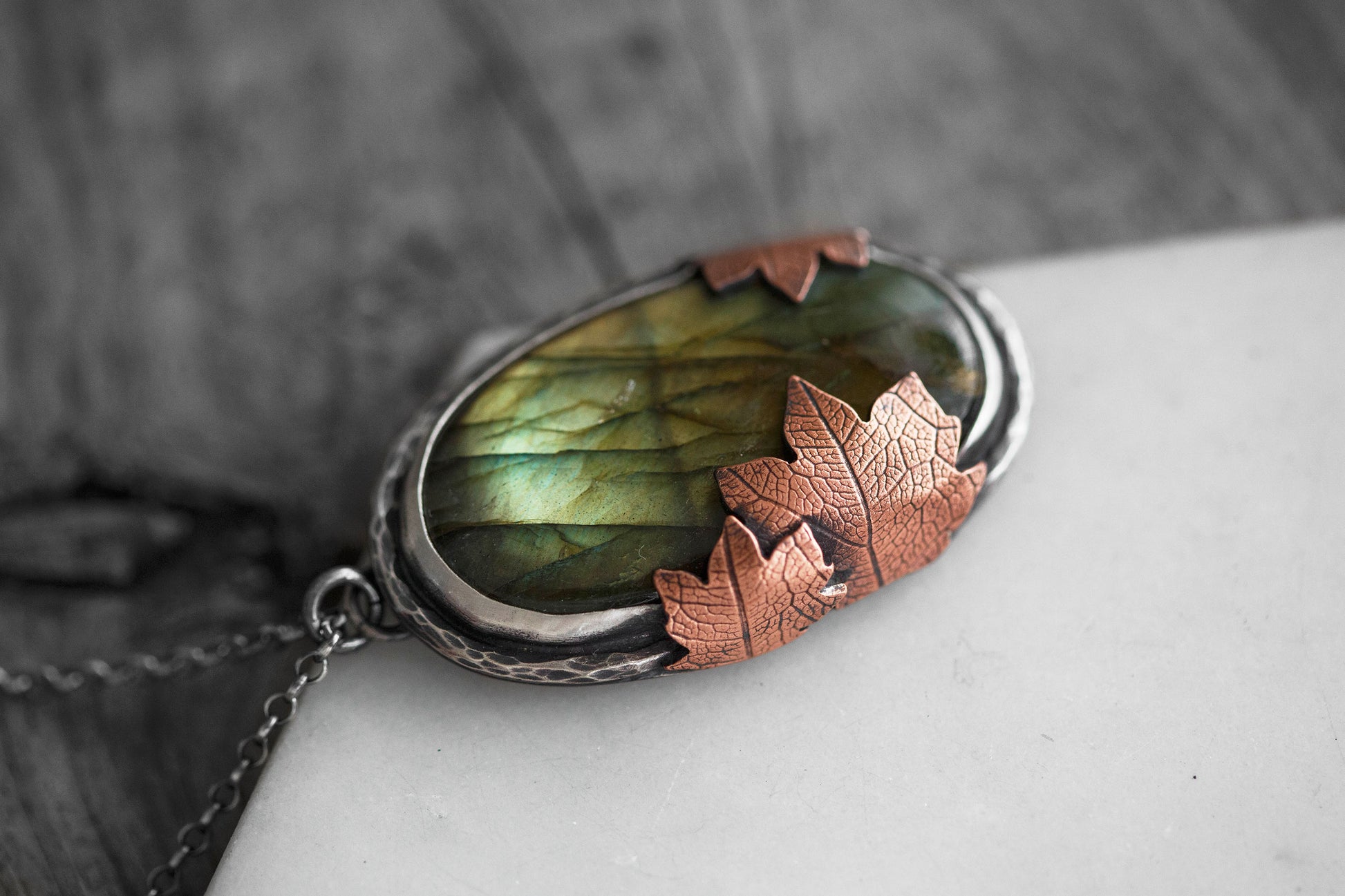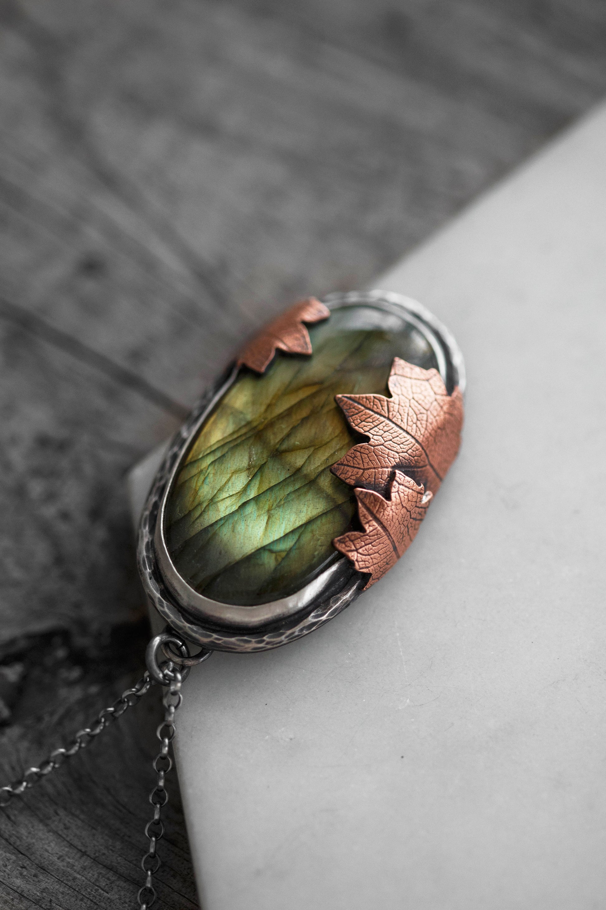 Each flashing labradorite gemstone is held by straight sterling silver bezel. Surrounding the gemstones are hand-textured branch borders. And gently draping over the stones are carefully sawn copper leaves with a leaf-print taken from real leaves.