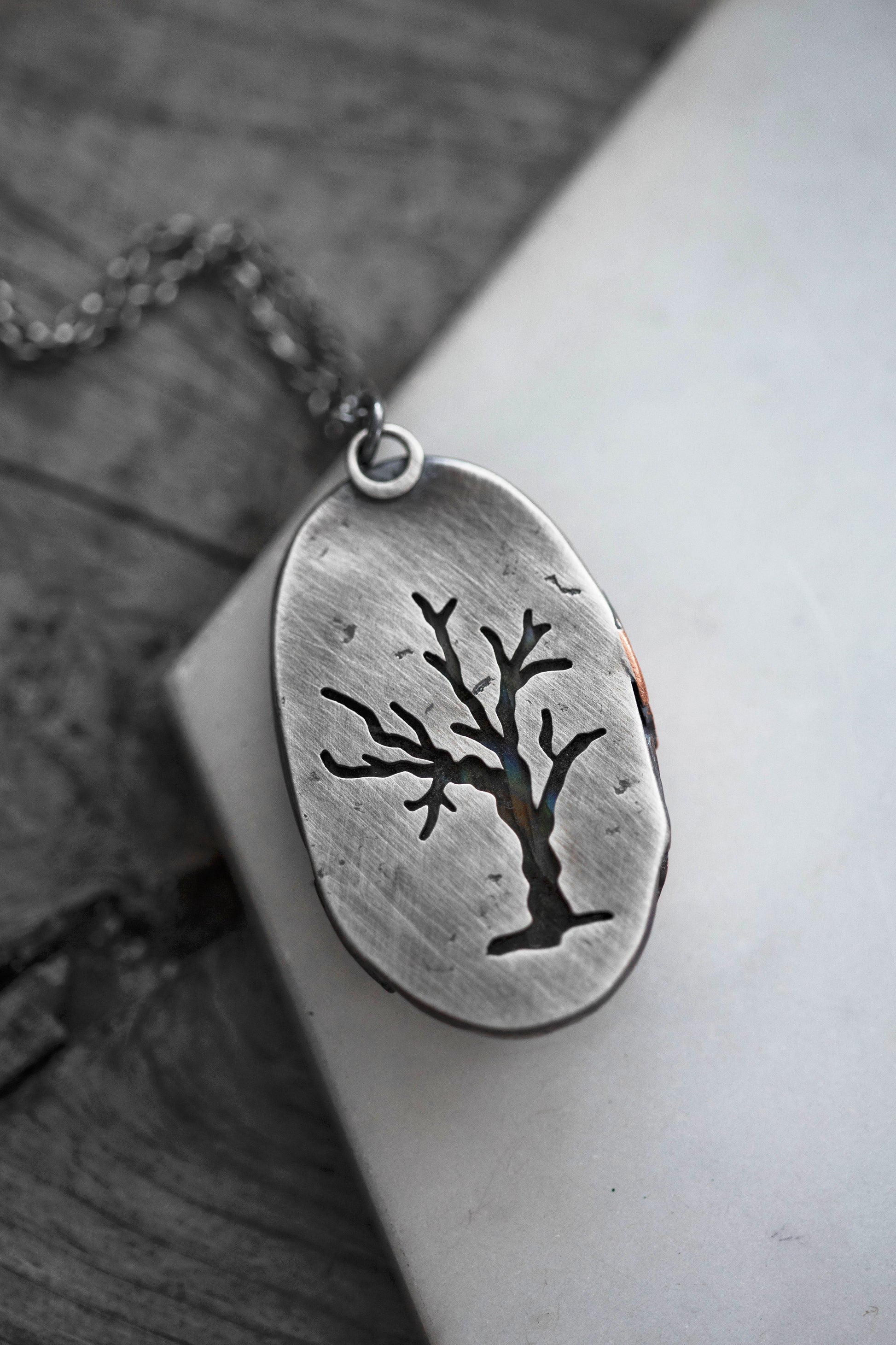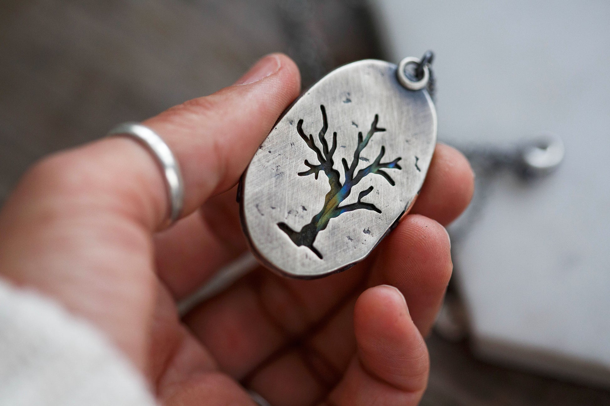 The backs of the pendants feature carefully sawn leafless trees revealing the backs of the stones. As with the moon pendants, some of the windows reveal bright, flashing labradorite backs, while others remain dark and furtive.