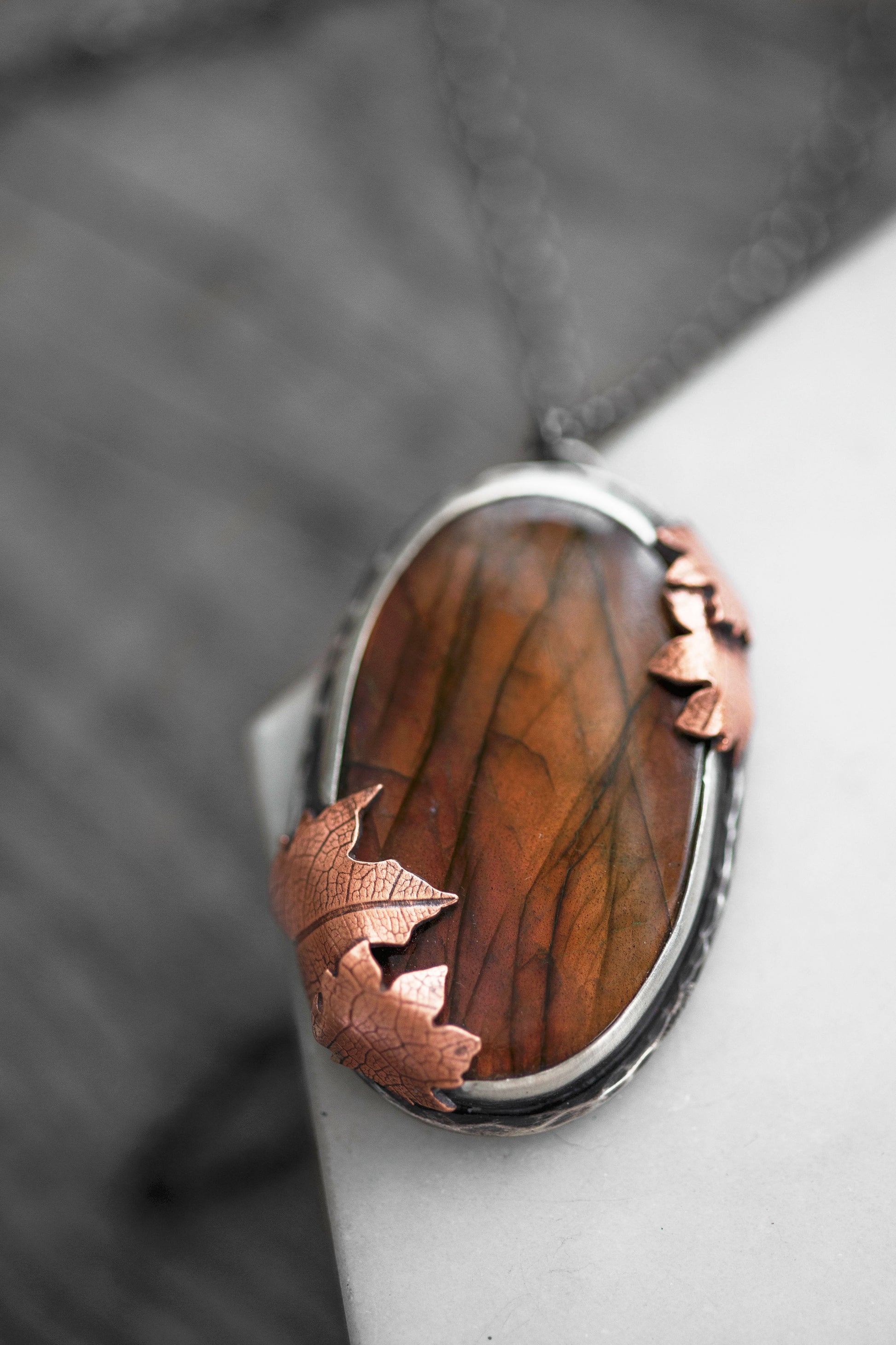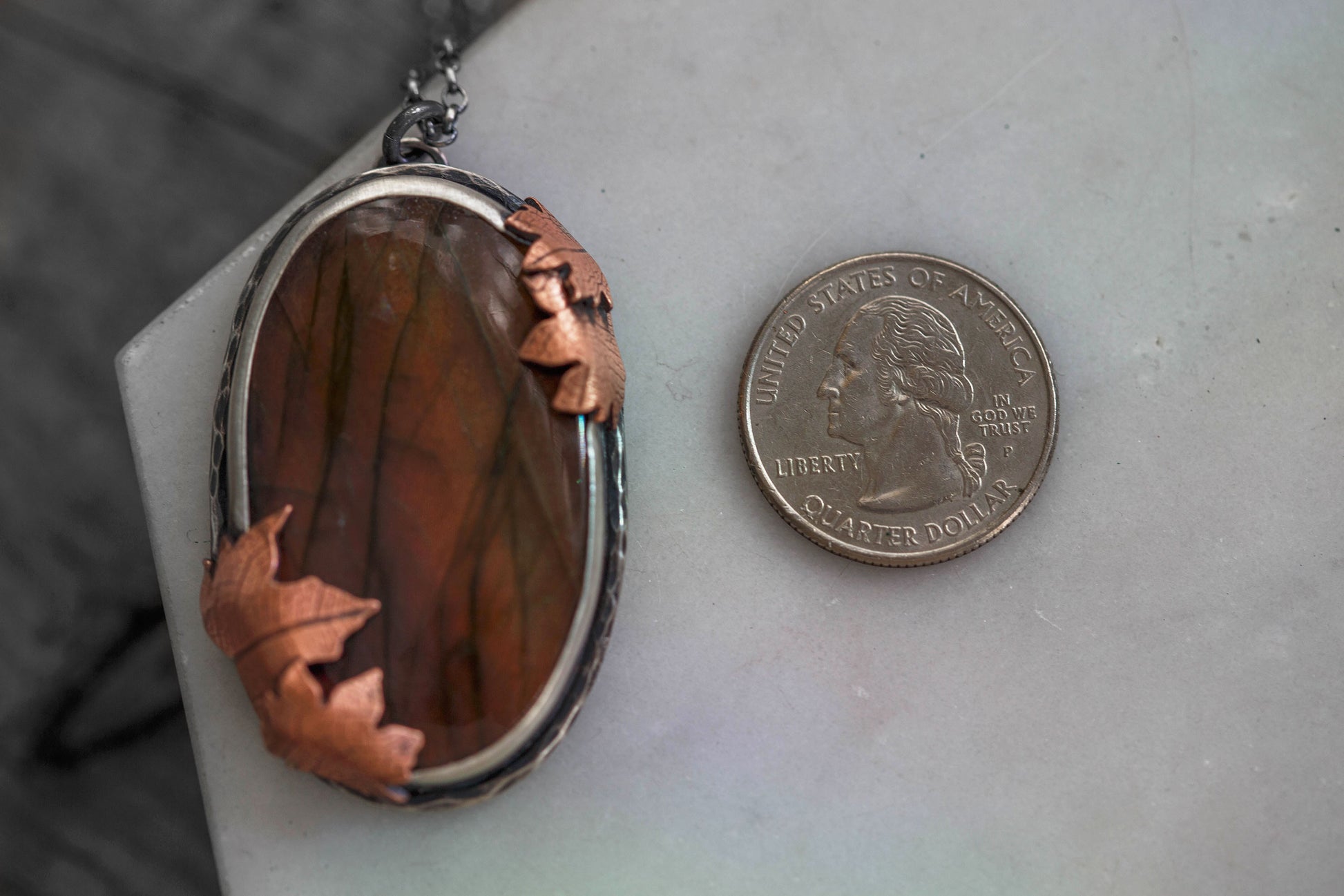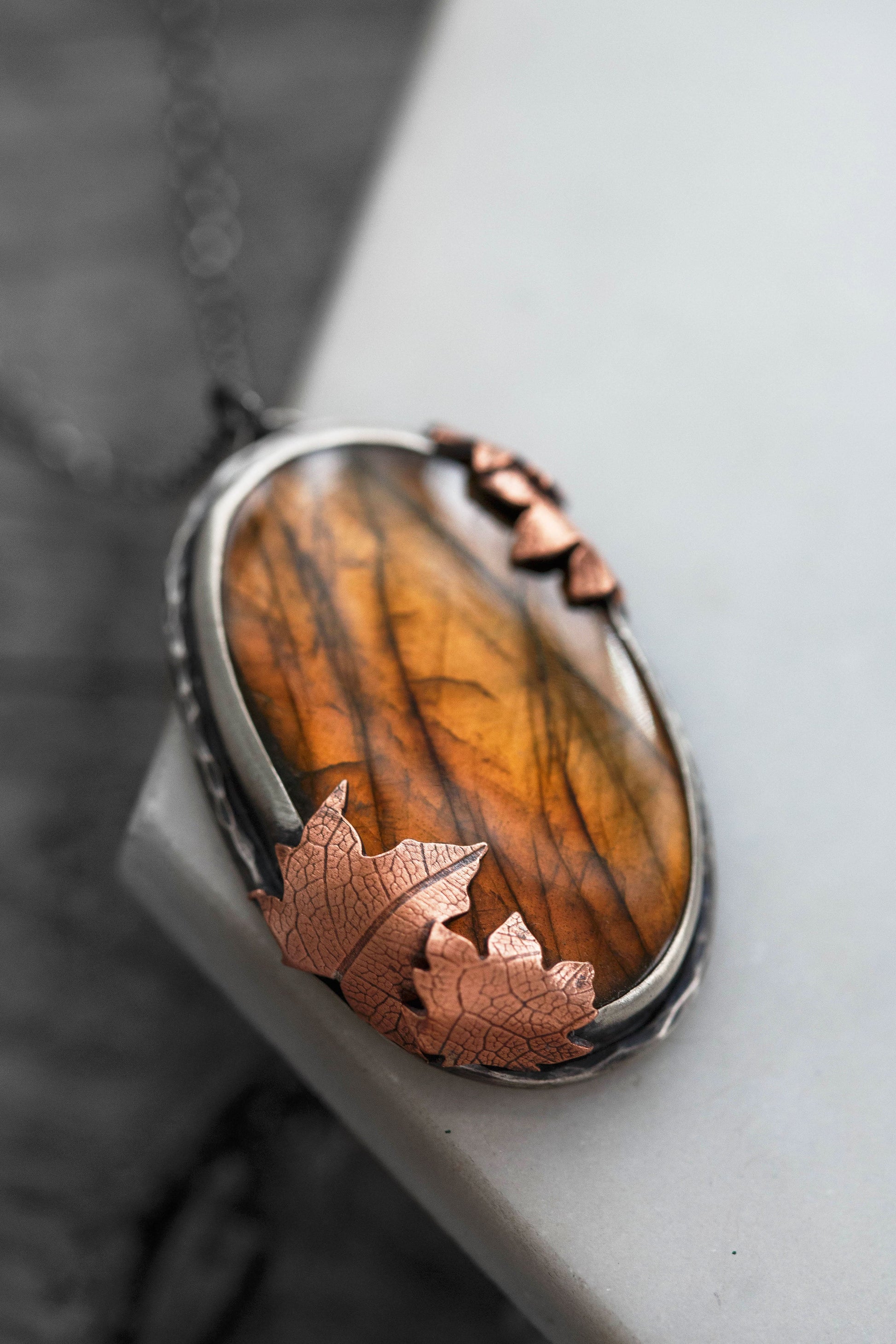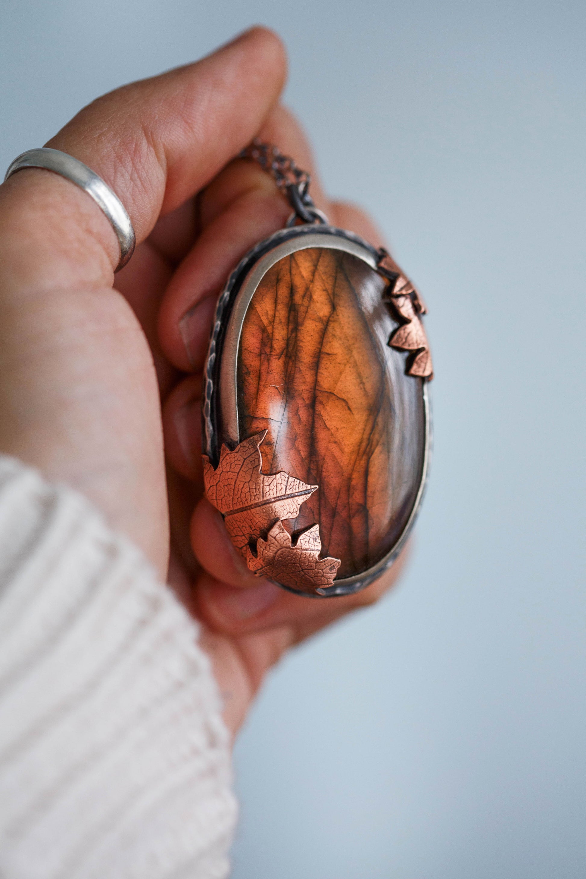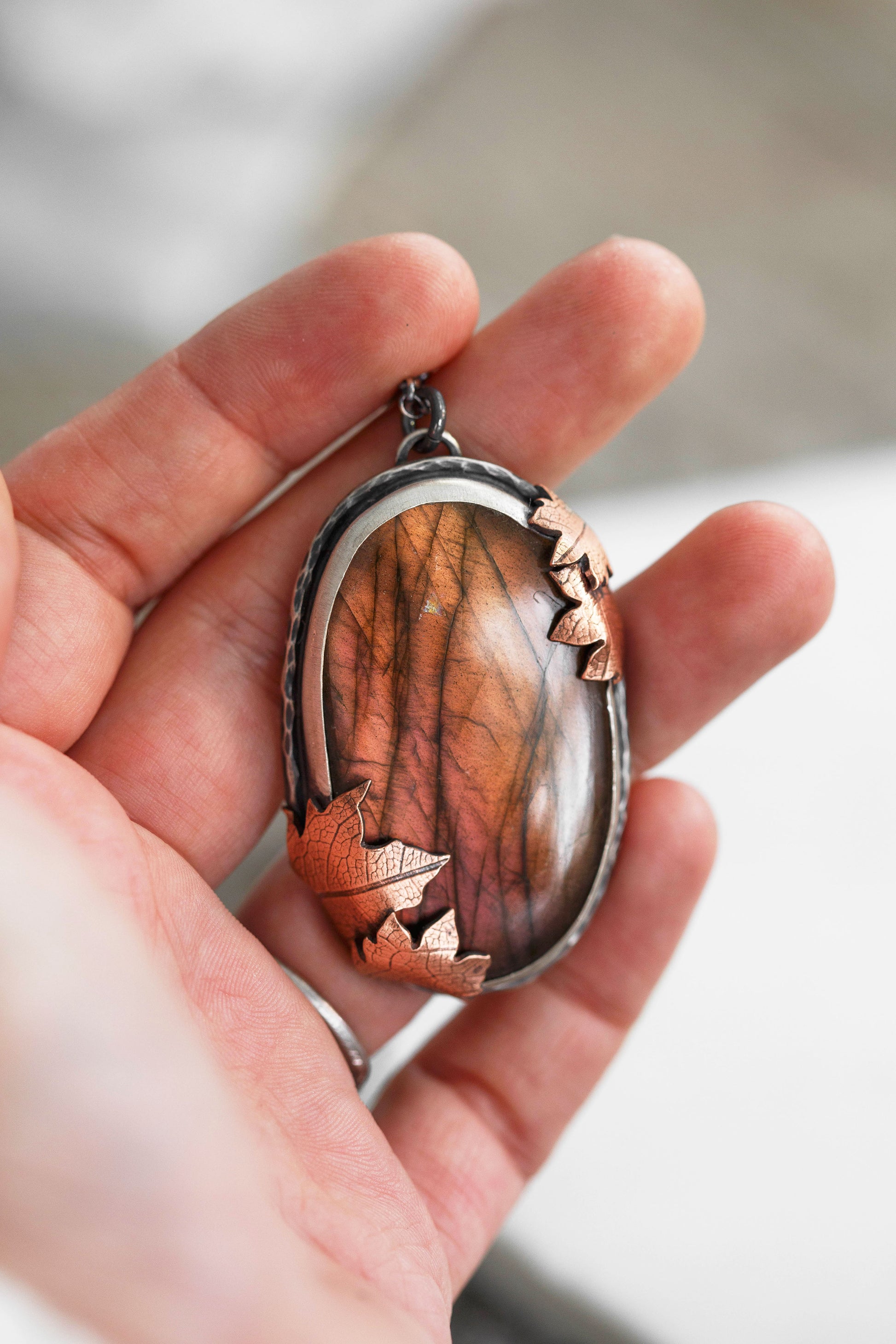 Each flashing labradorite gemstone is held by straight sterling silver bezel. Surrounding the gemstones are hand-textured branch borders. And gently draping over the stones are carefully sawn copper leaves with a leaf-print taken from real leaves.