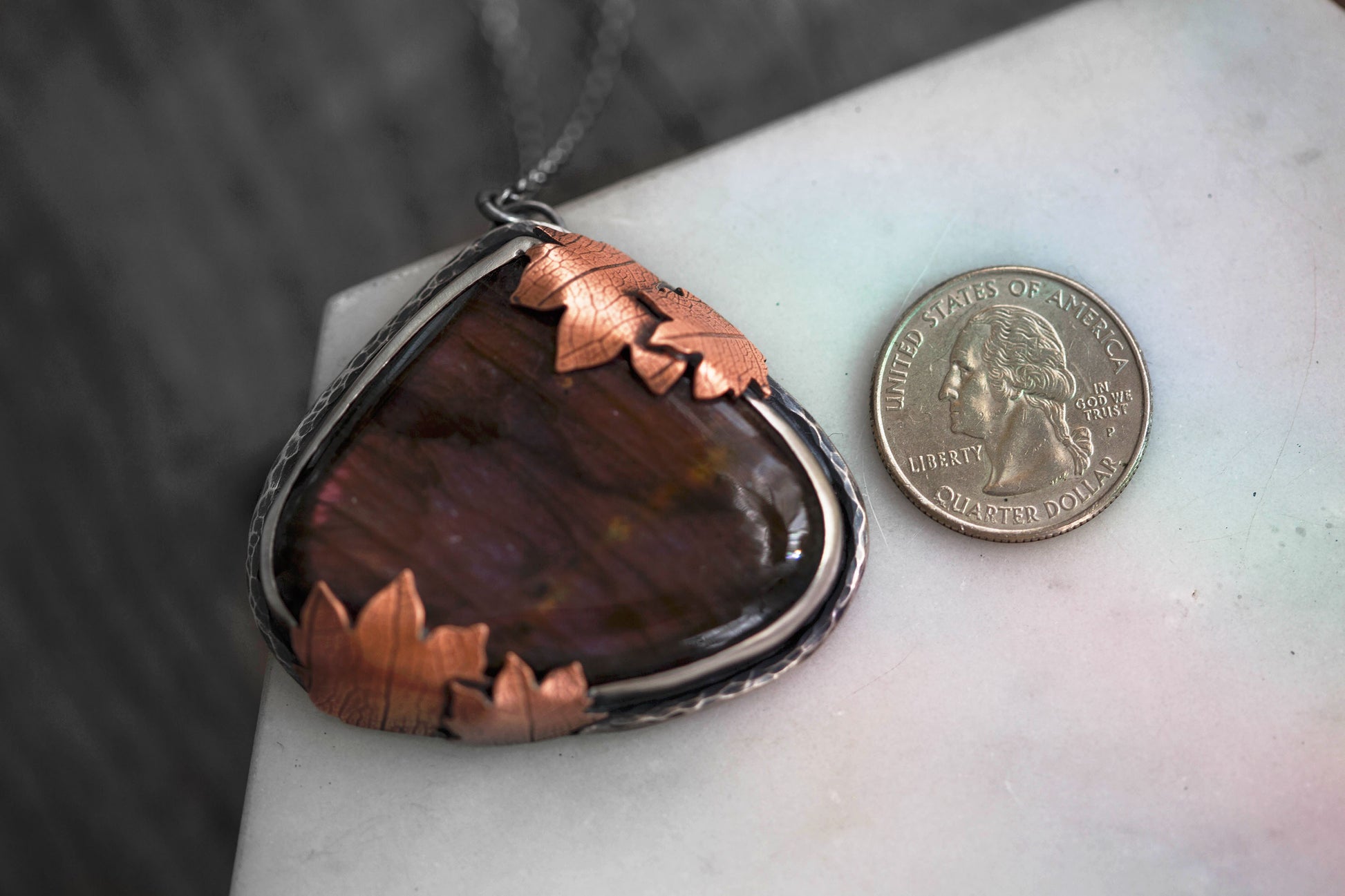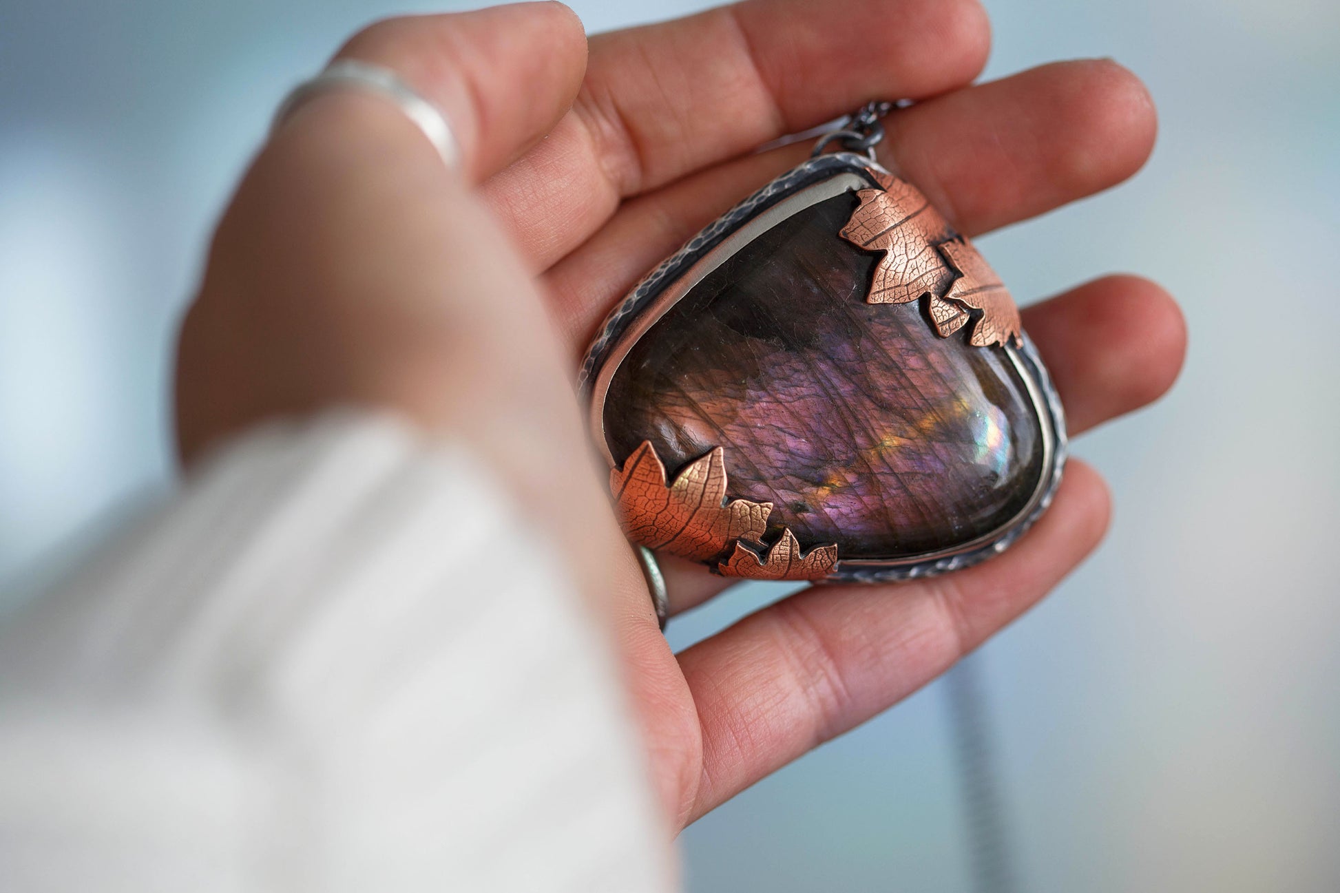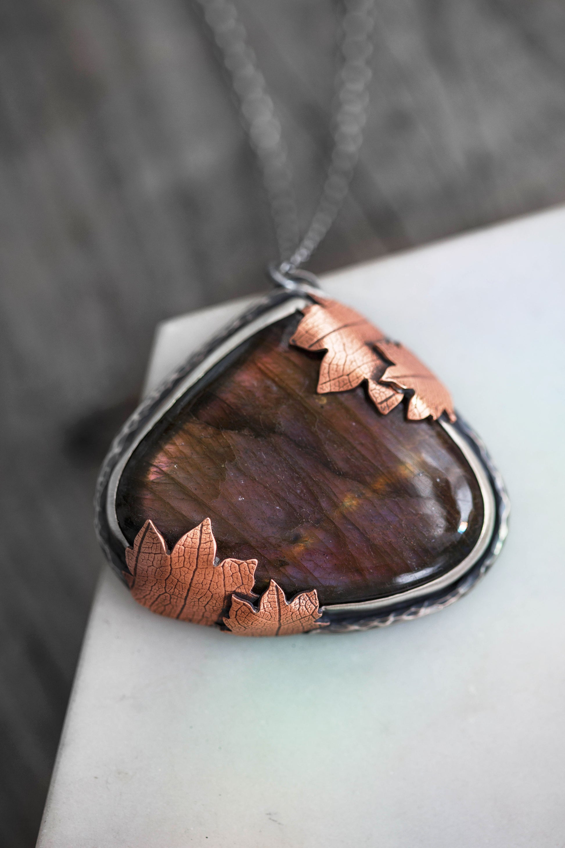 Each flashing labradorite gemstone is held by straight sterling silver bezel. Surrounding the gemstones are hand-textured branch borders. And gently draping over the stones are carefully sawn copper leaves with a leaf-print taken from real leaves.
