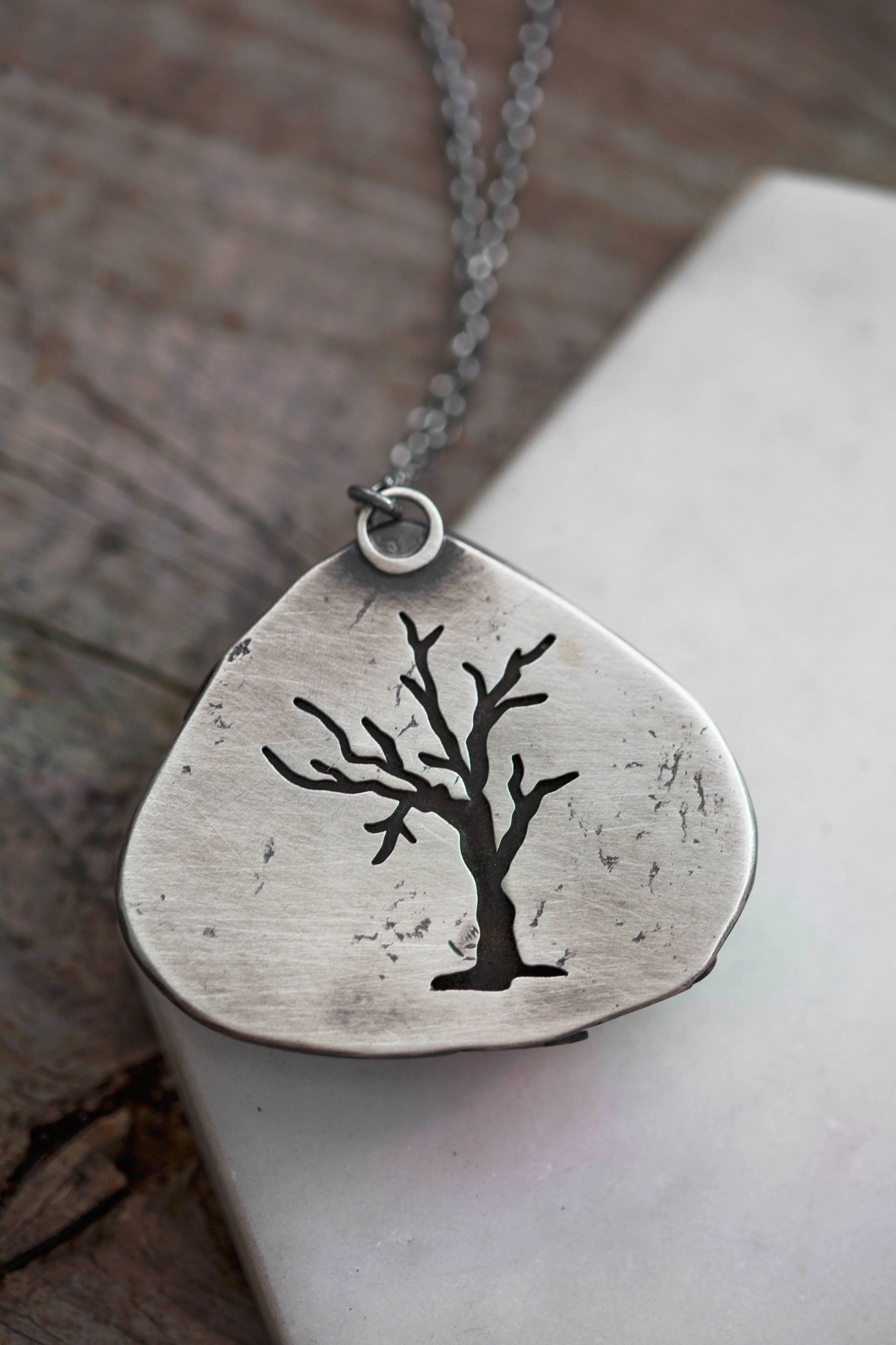 This pendant has been aged and hand-polished for a textured, organic look, and to bring out the lowlights and accent the stone.