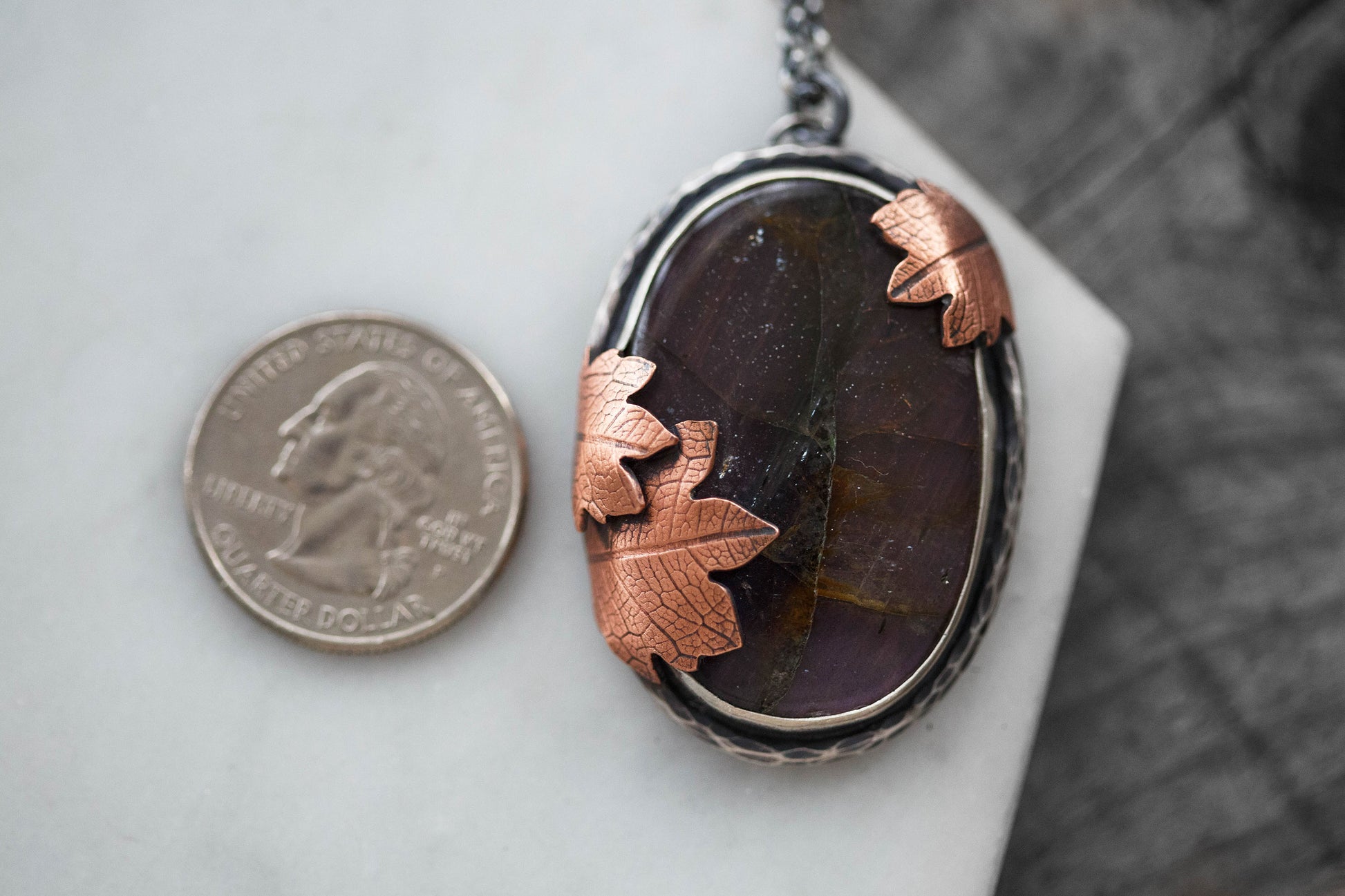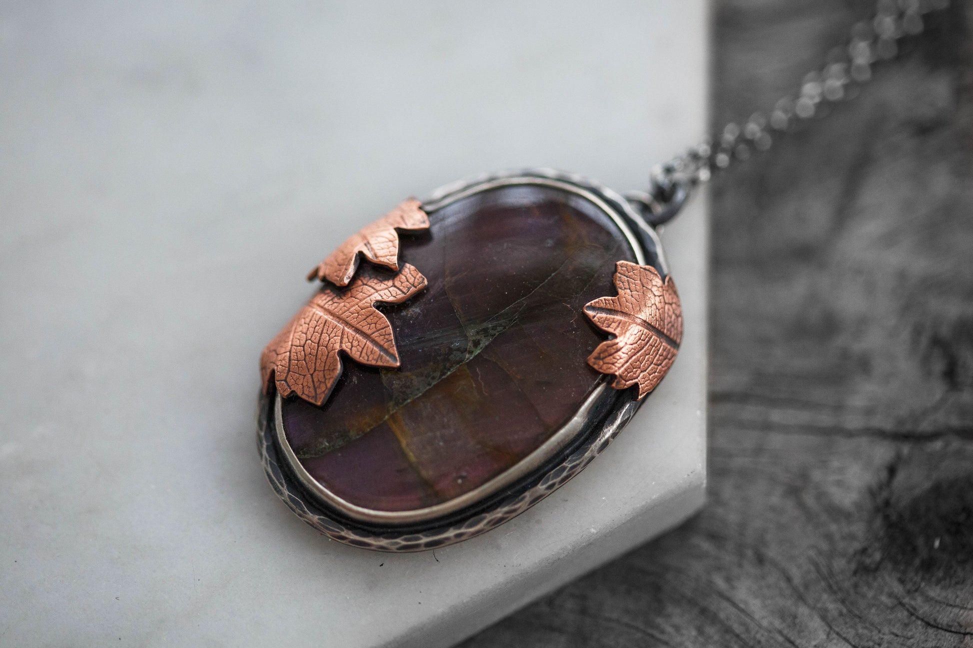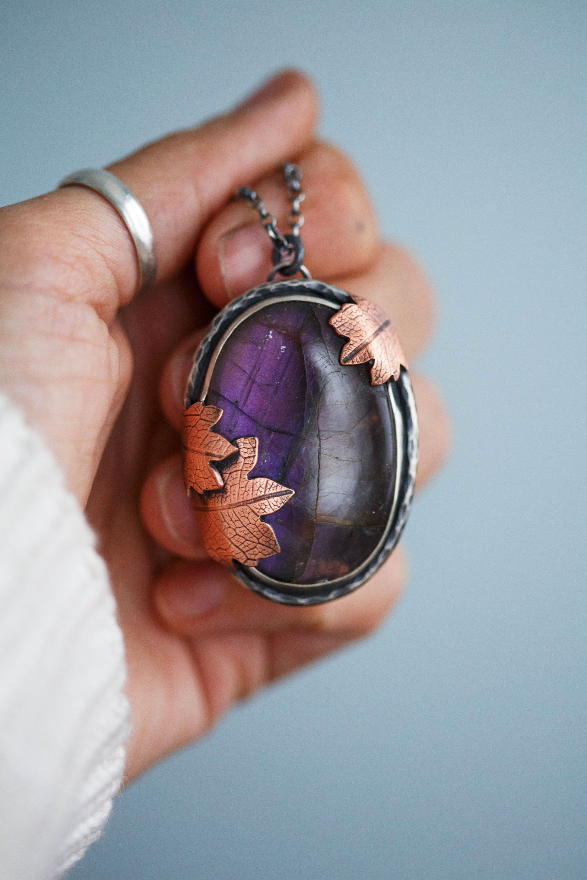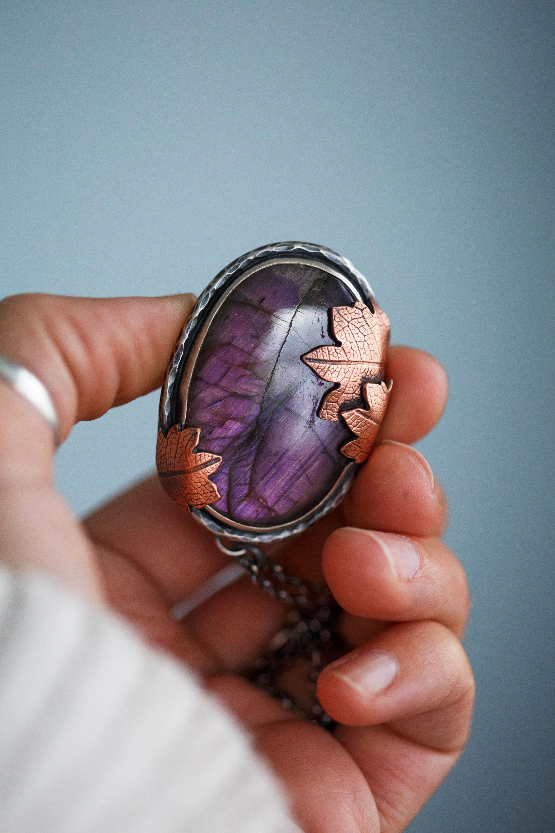 Each flashing labradorite gemstone is held by straight sterling silver bezel. Surrounding the gemstones are hand-textured branch borders. And gently draping over the stones are carefully sawn copper leaves with a leaf-print taken from real leaves.