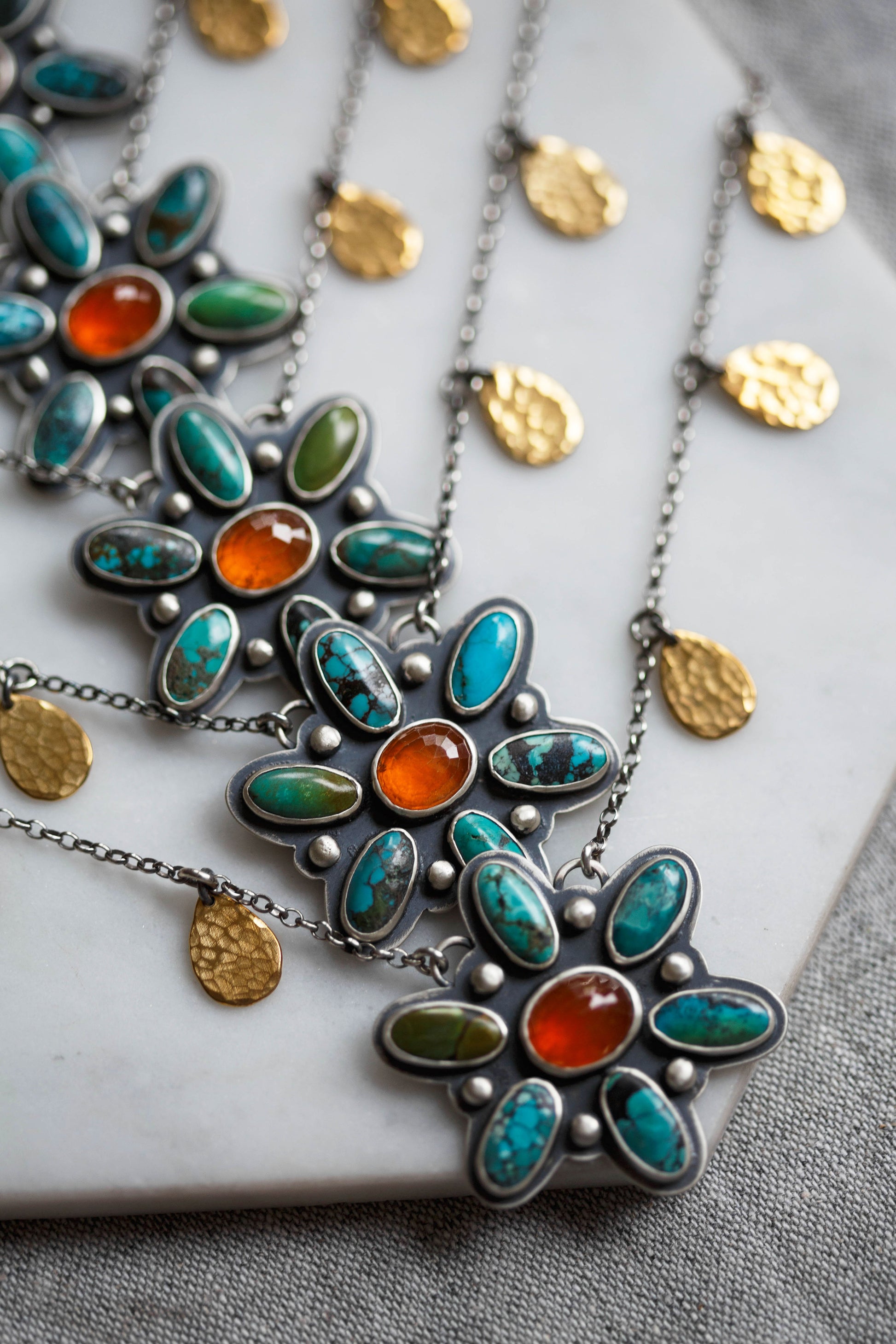 These necklaces all feature an oval focal hessonite garnet gemstone, surrounded by petals of turquoise, all very different in cut, color, shape, and matrix. As unique as it's wearer. On the backs of the pendants are secret bird silhouettes, eternally sailing through the air.