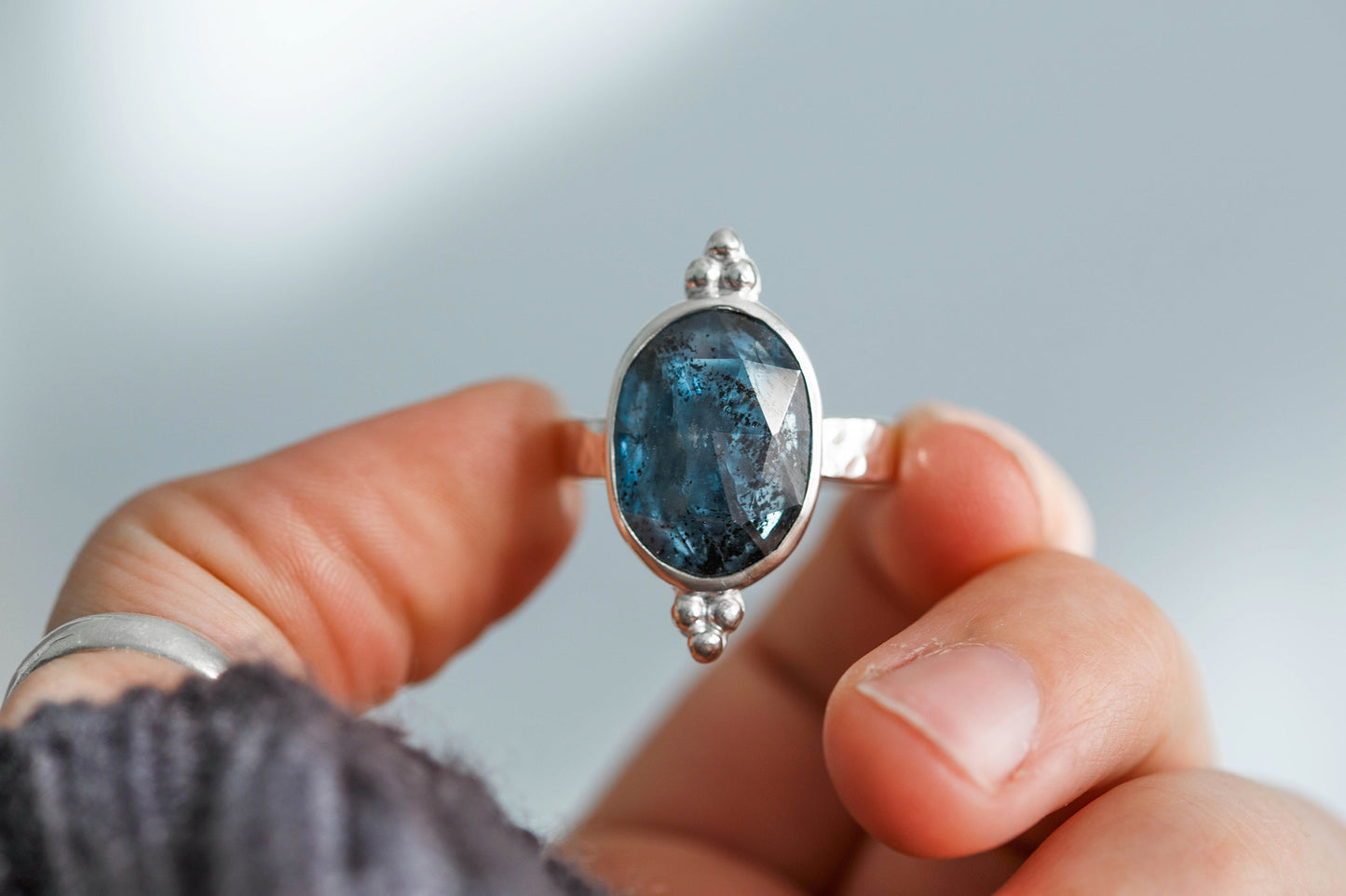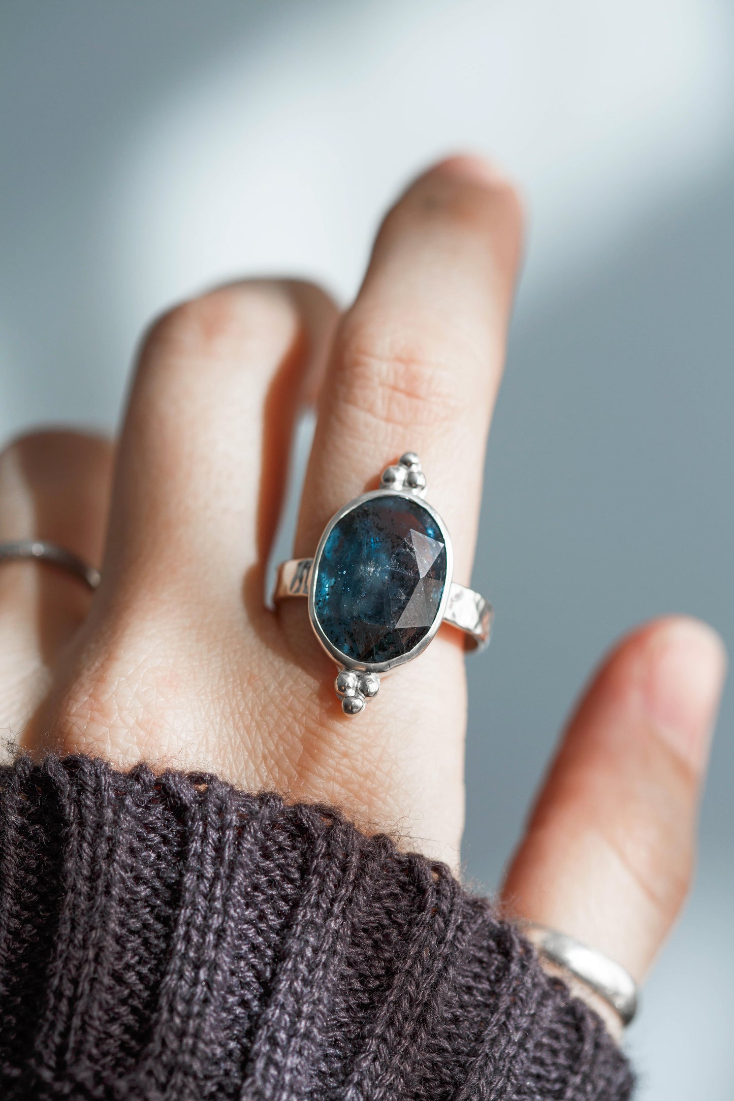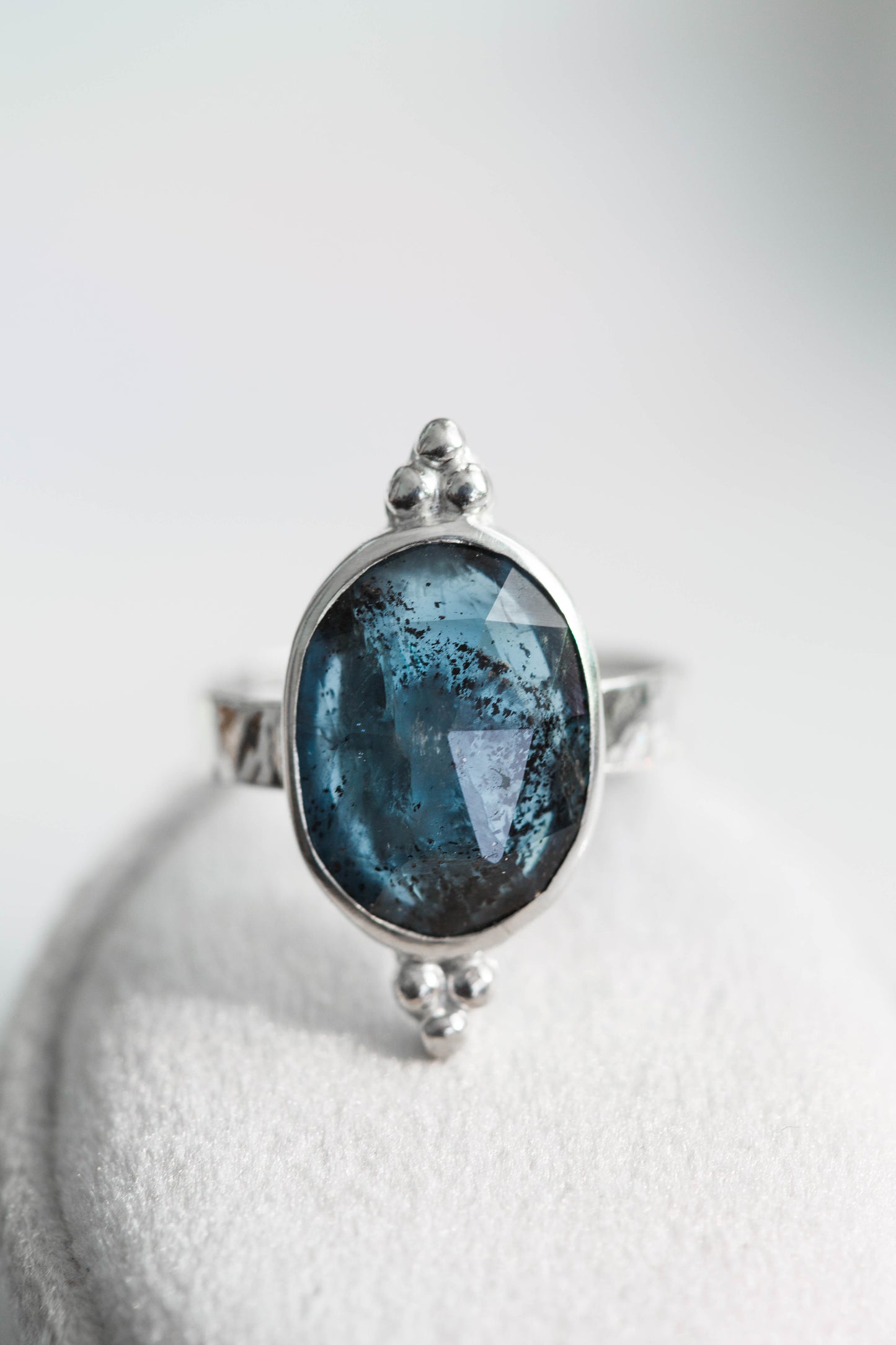 A ring for exploring ocean coves still sparkling with sea ice. A ring for the deep Atlantic, all saturated blues and shadows. A ring for mermaids and wave-walkers, ocean explorers with hearts made of sea salt. The teal blue kyanite gemstone drinks the light and holds it within.