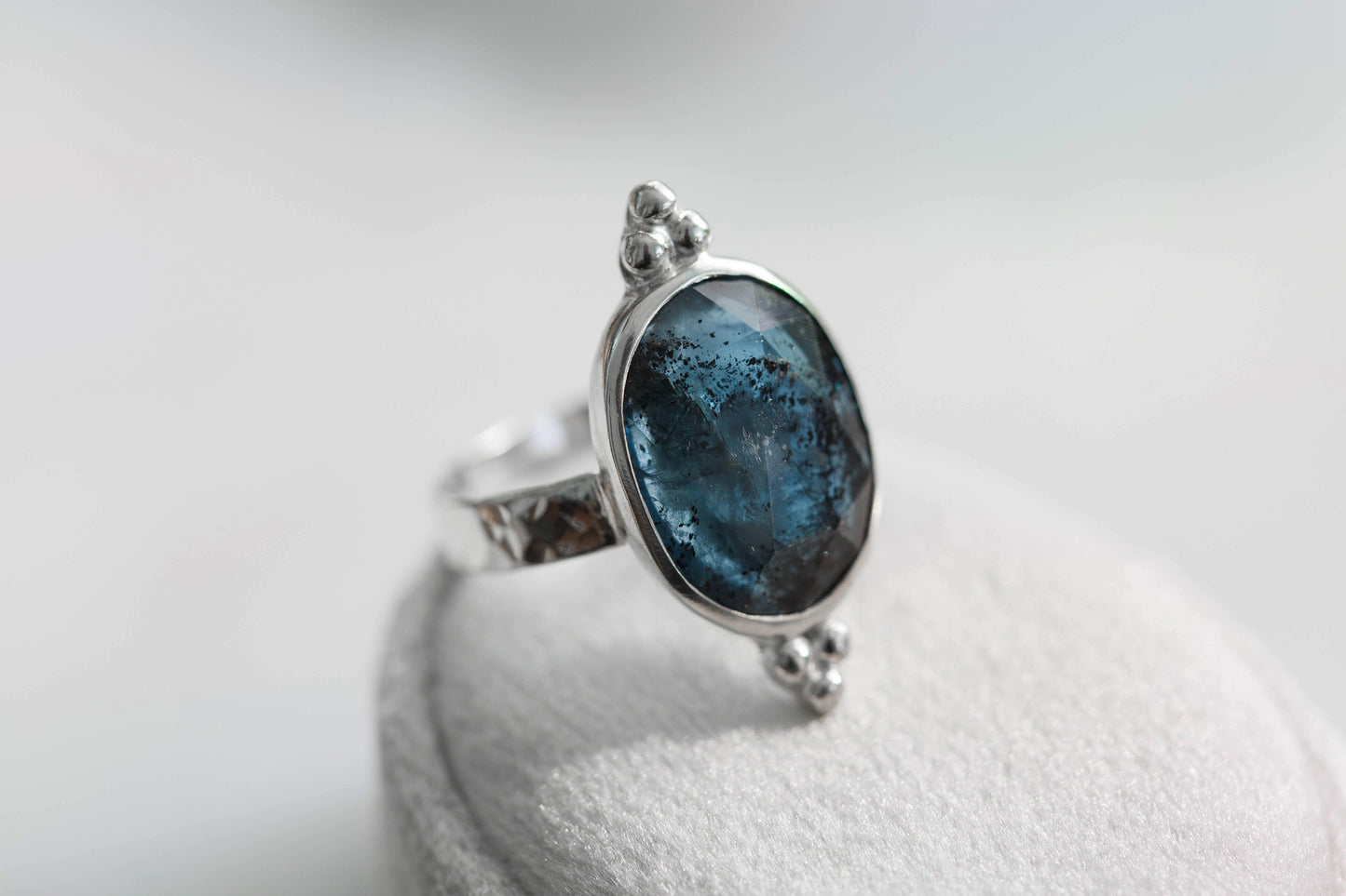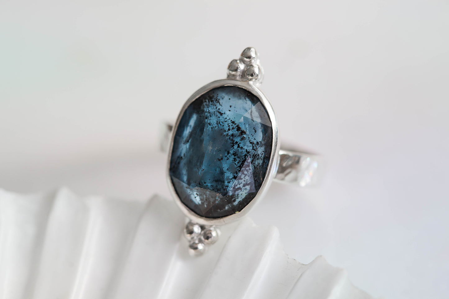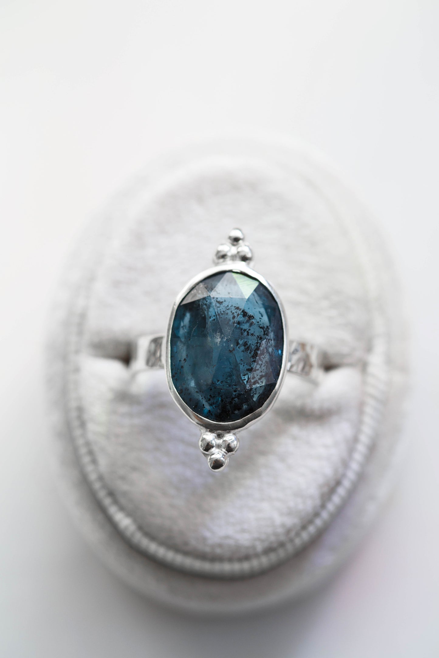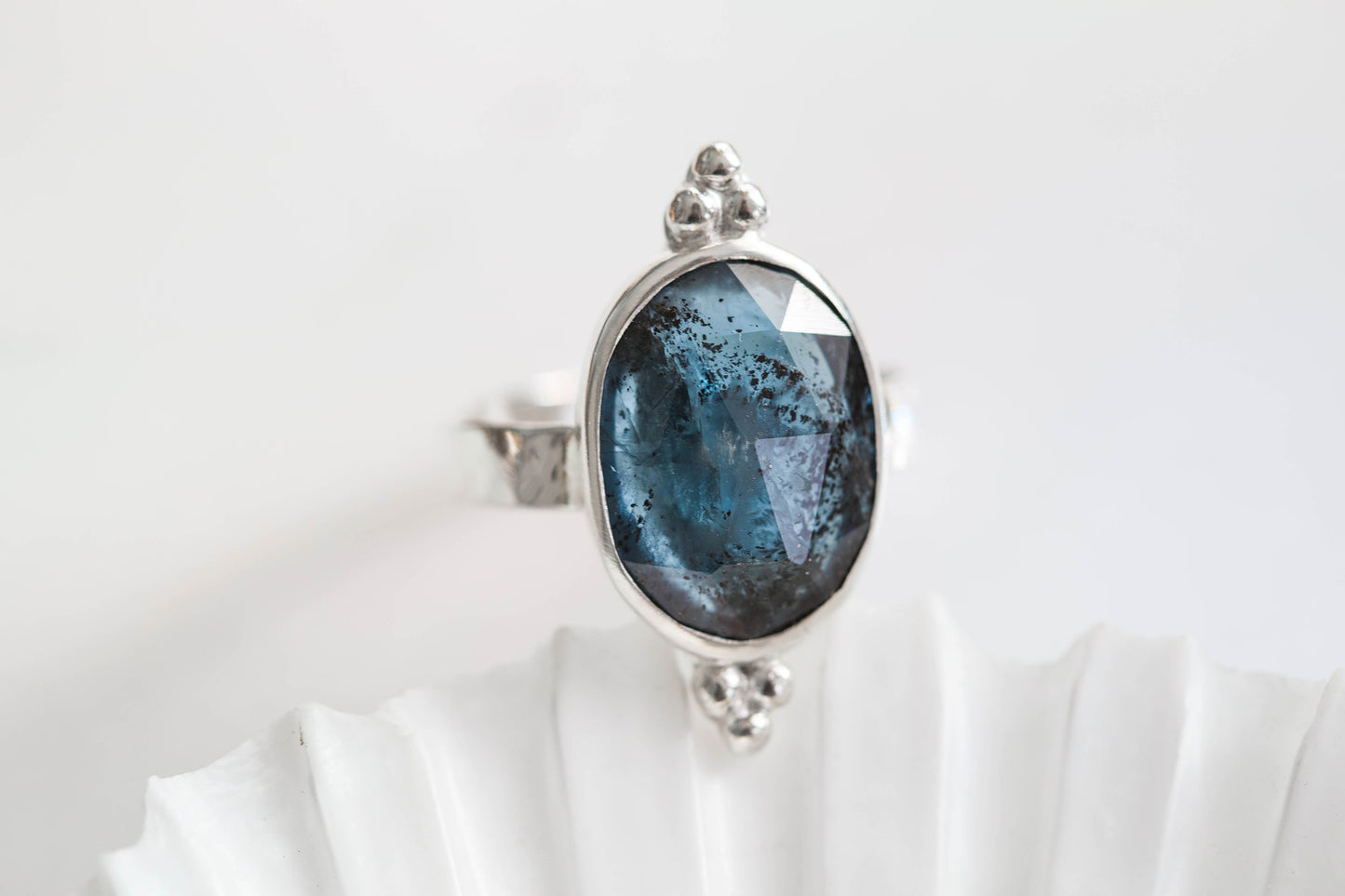 A ring for exploring ocean coves still sparkling with sea ice. A ring for the deep Atlantic, all saturated blues and shadows. A ring for mermaids and wave-walkers, ocean explorers with hearts made of sea salt. The teal blue kyanite gemstone drinks the light and holds it within.