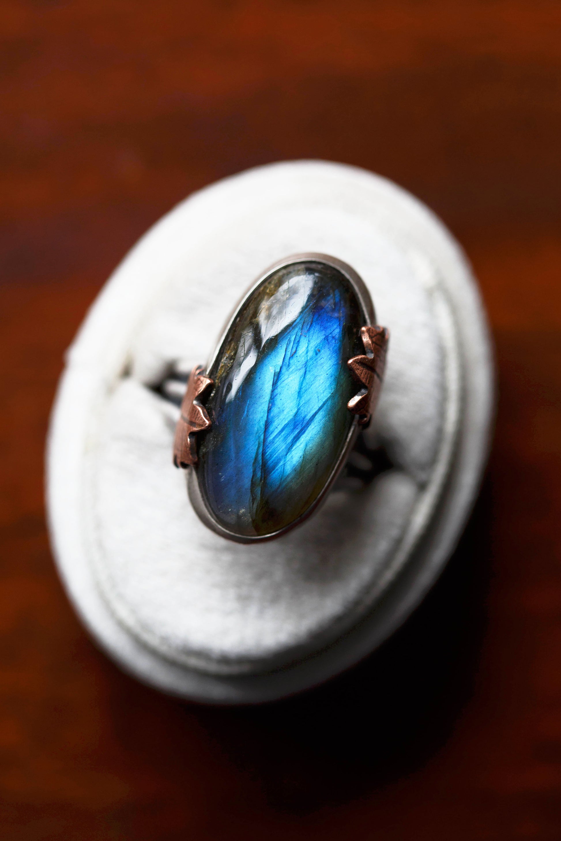 This ring design consists of beautiful labradorites, ranging from deep blues to snakey greens to crackling golds to soft purples. Some have a soft, smokey surface where to color is furtive and secretive. Others have a color that is bright and searing. Some gemstones are striated with surface imperfections, and others are smooth and liquidy.