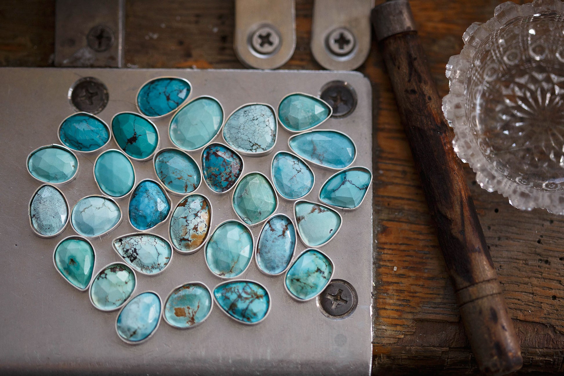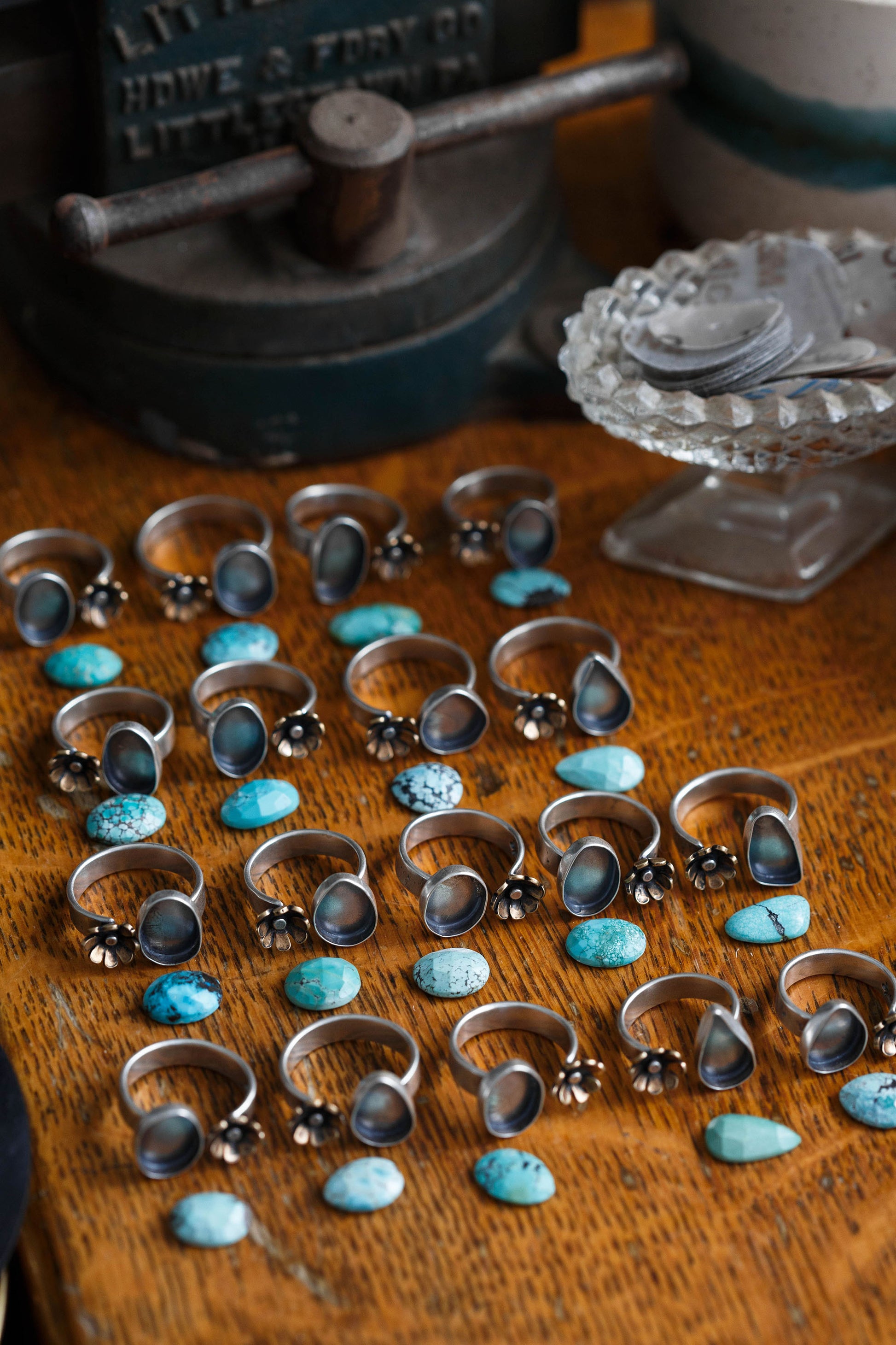 These rings are made from unique cuts of turquoise, some faceted, others smooth, and in as many shapes as I could find.