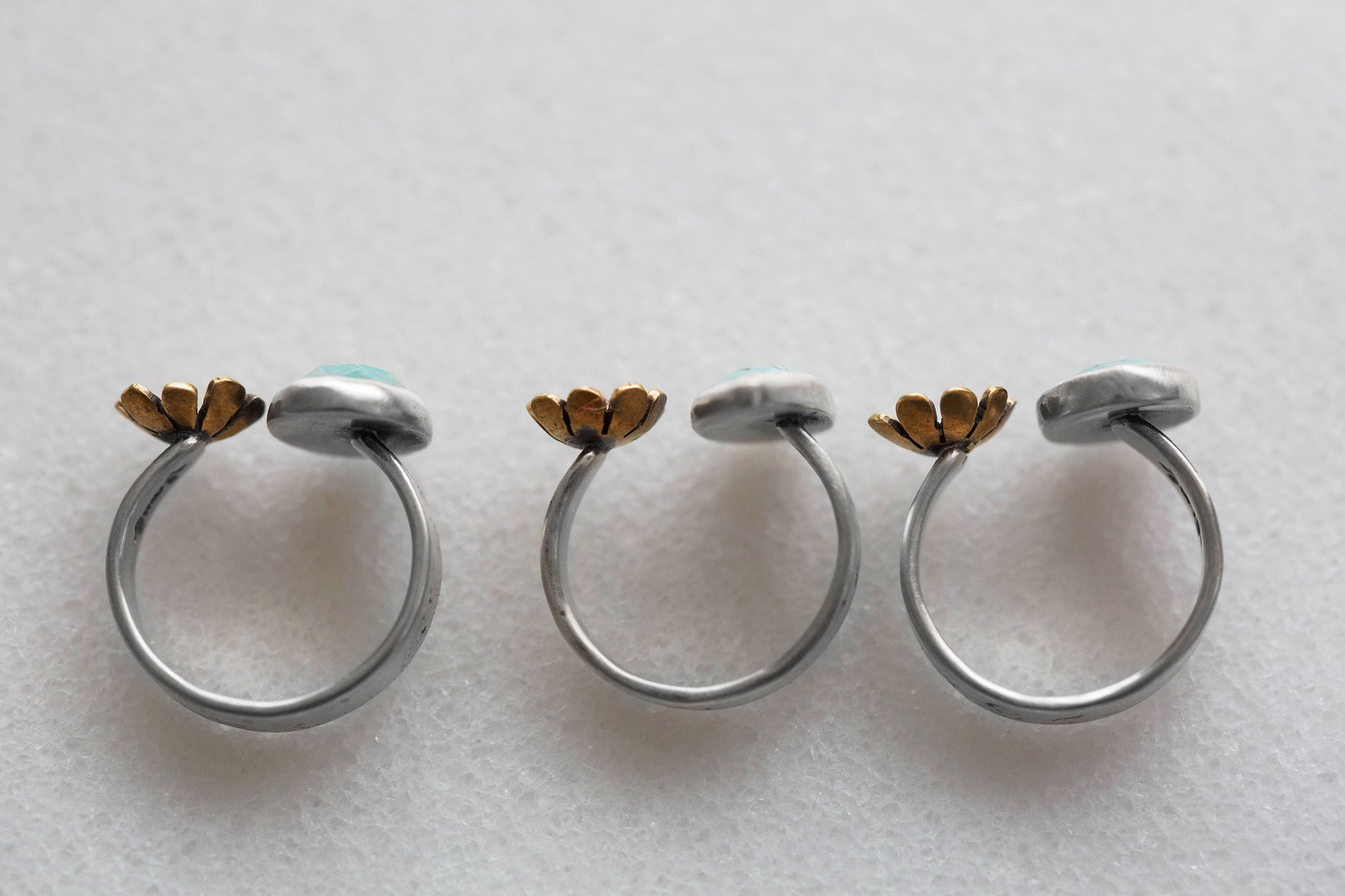 Each ring features a turquoise gemstone and a tiny brass flower set on either side of a split textured rectangle ring band.