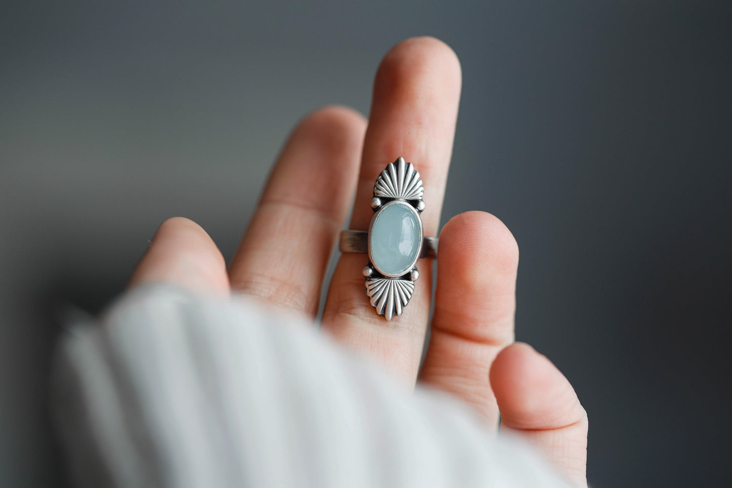 This ring is made from a natural, crackling aquamarine gemstone set in a straight bezel. Accenting the stone is a single sterling silver pebbles, like a beach stone smooth and shining from a recent wave.