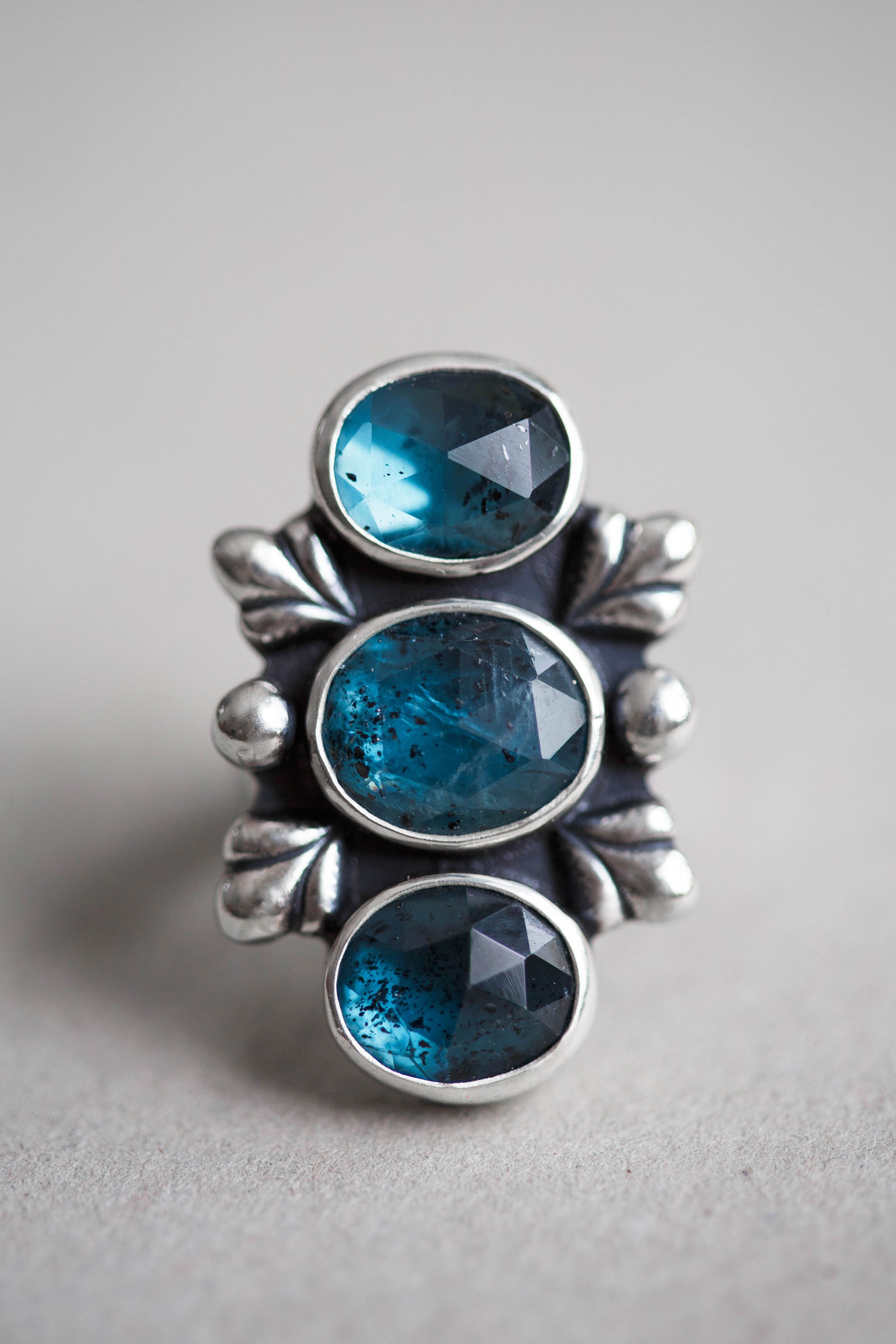 The gemstones are set in straight bezels. Accenting the stones are little sterling silver pebbles, like beach stones smooth and shining from a recent wave. And little fronds made of molten silver and hand sawn and smoothed before affixing them to the ring.