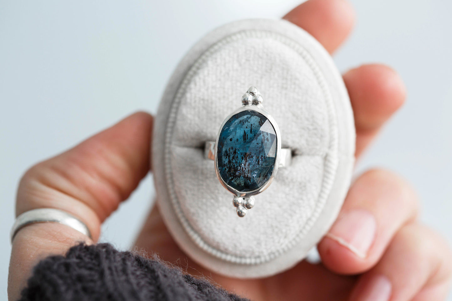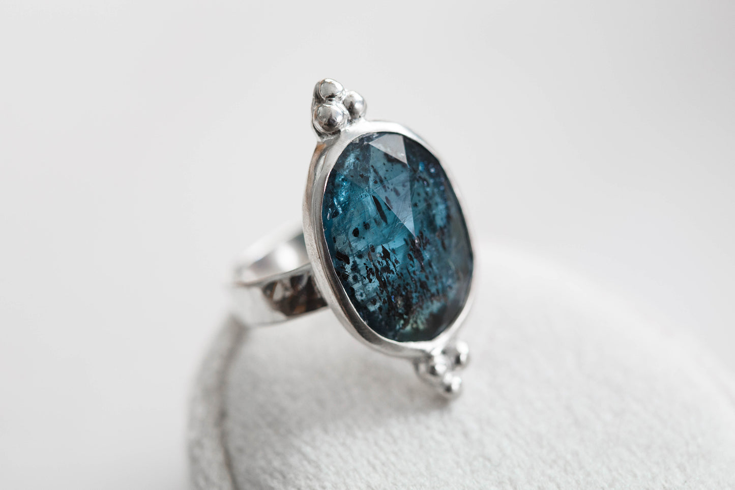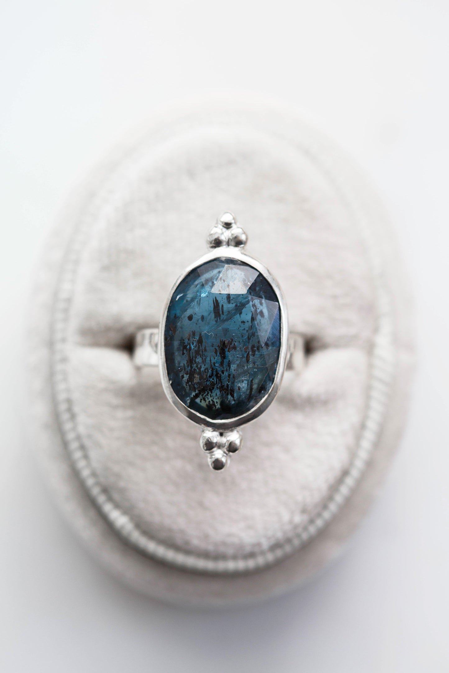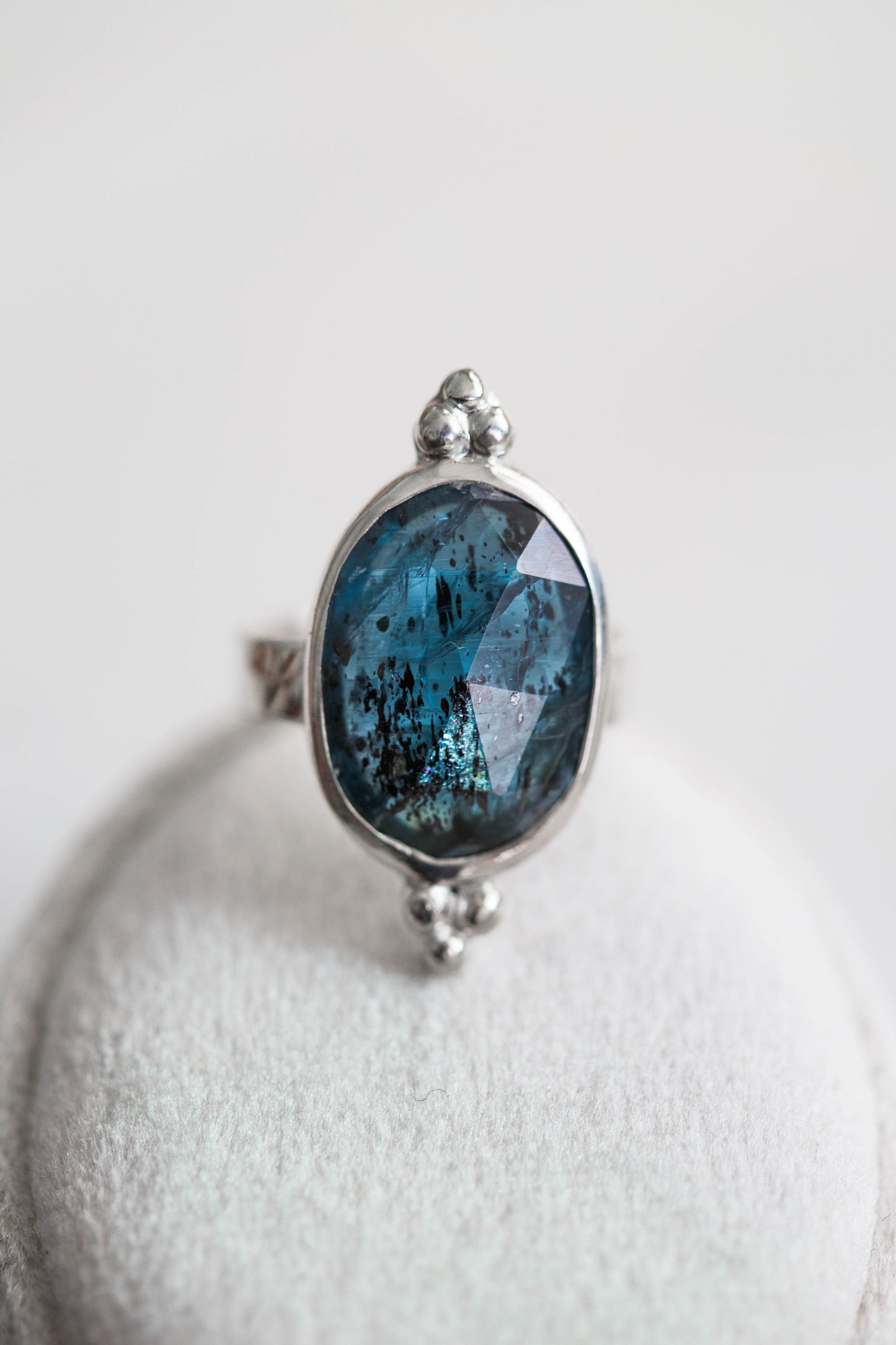 A ring for exploring ocean coves still sparkling with sea ice. A ring for the deep Atlantic, all saturated blues and shadows. A ring for mermaids and wave-walkers, ocean explorers with hearts made of sea salt. The teal blue kyanite gemstone drinks the light and holds it within.