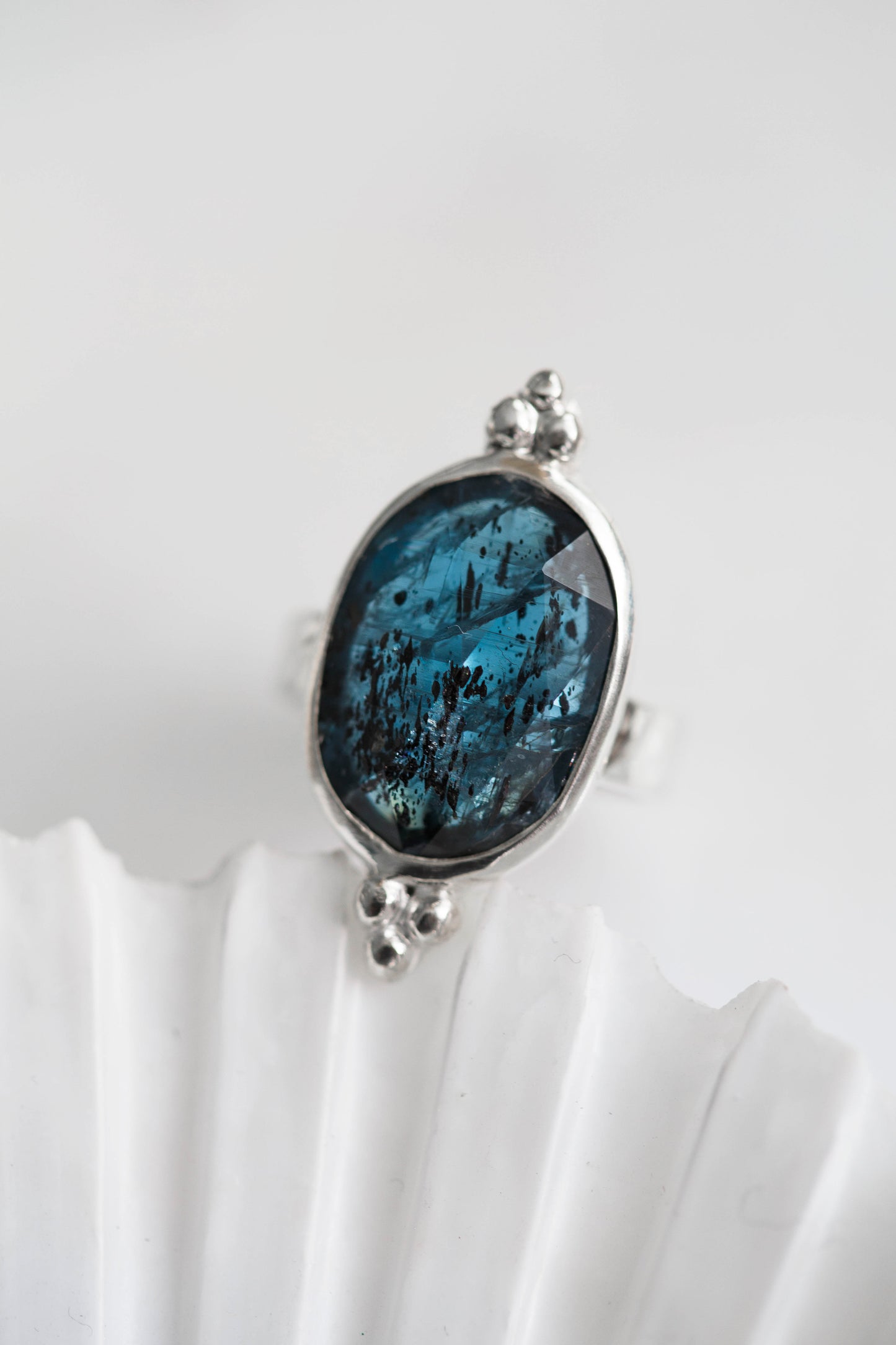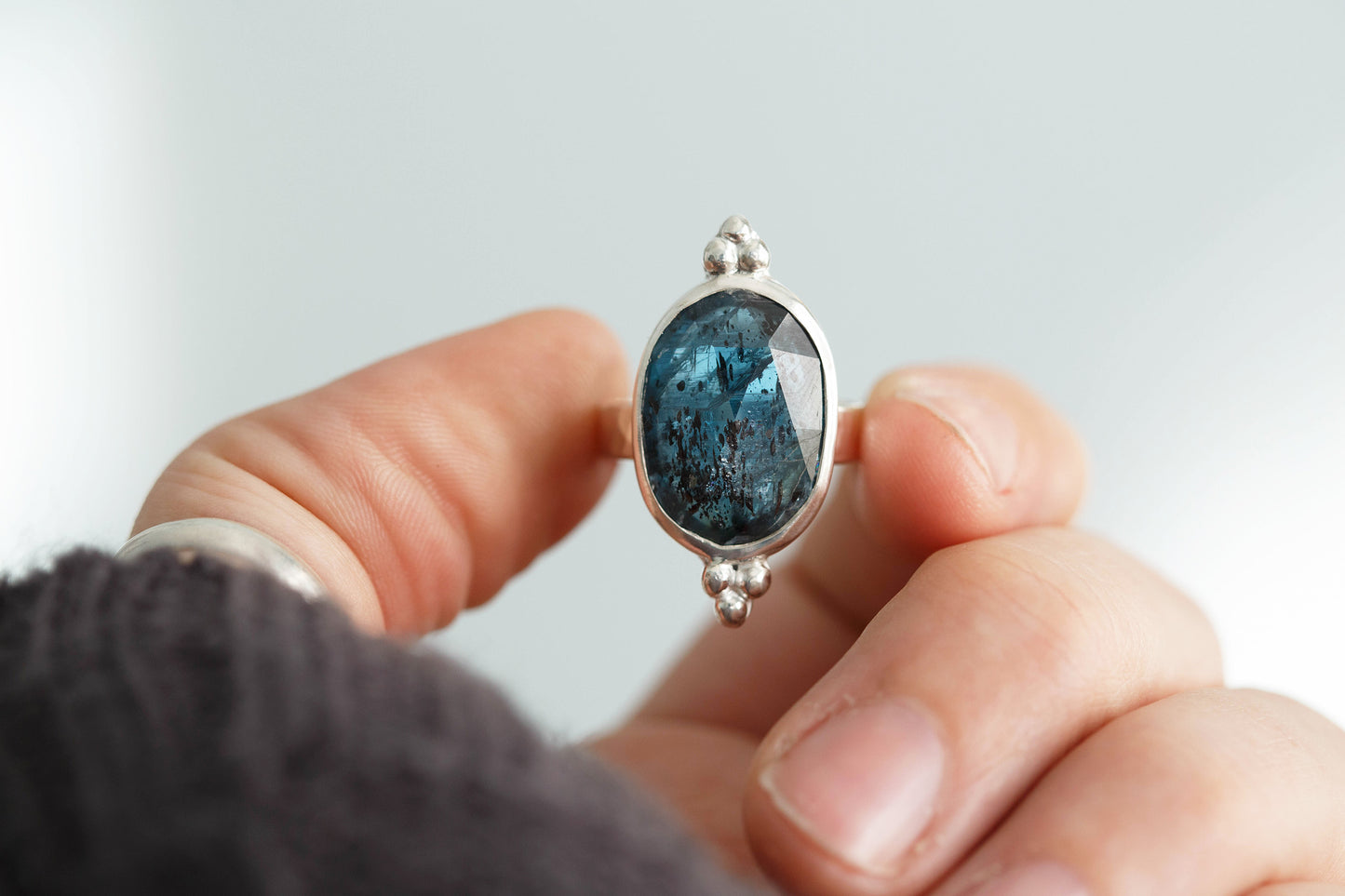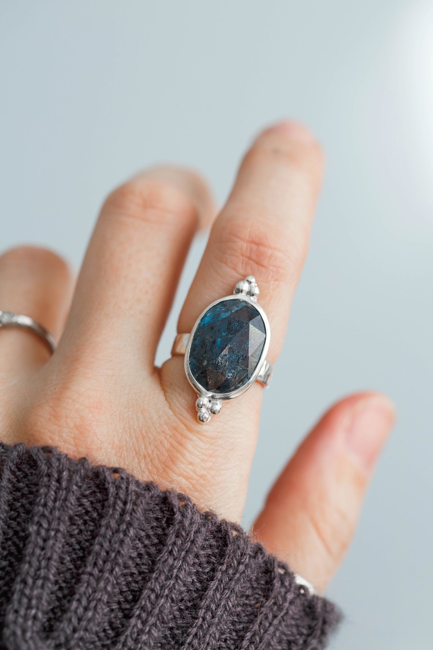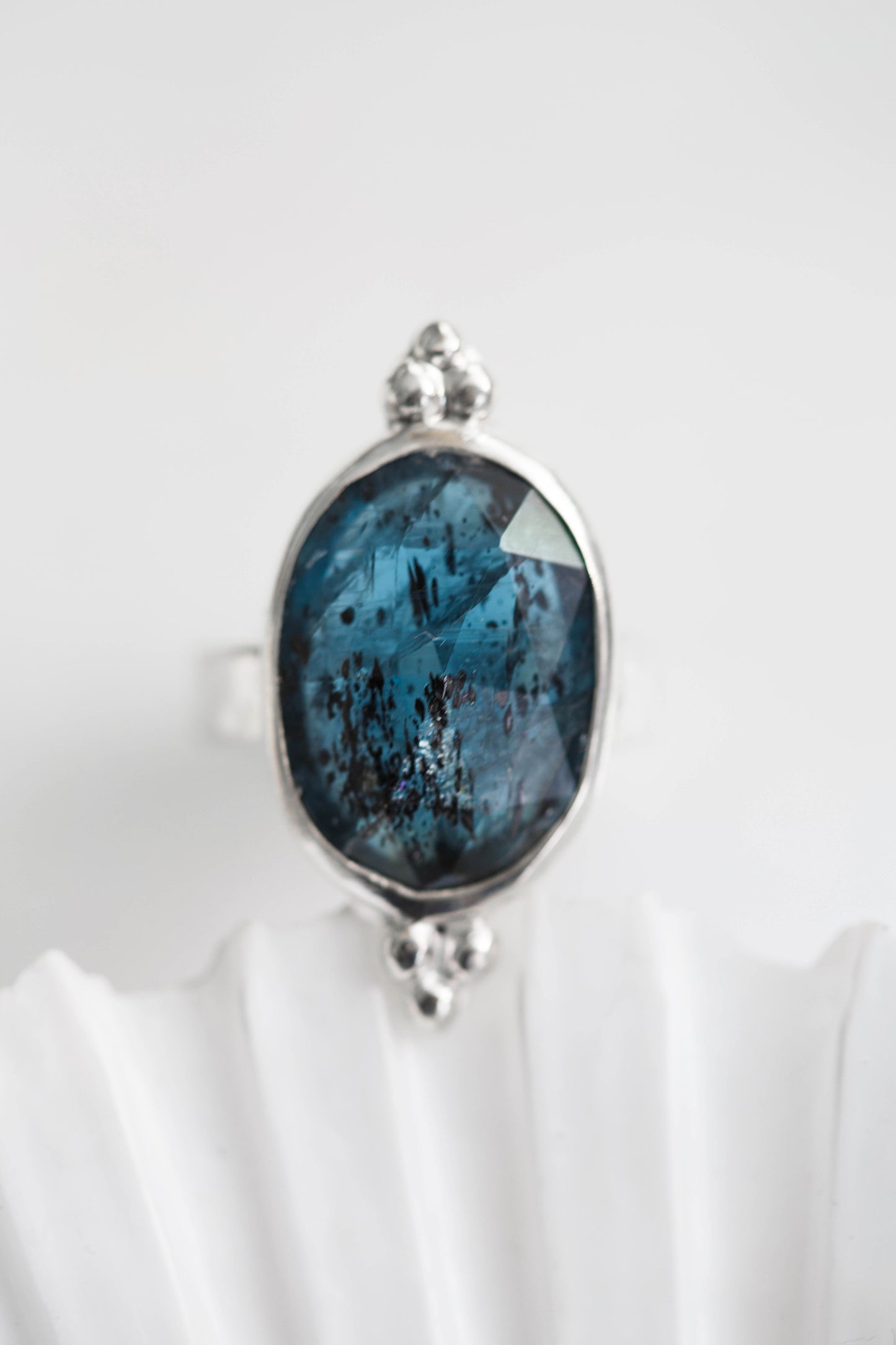 A ring for exploring ocean coves still sparkling with sea ice. A ring for the deep Atlantic, all saturated blues and shadows. A ring for mermaids and wave-walkers, ocean explorers with hearts made of sea salt. The teal blue kyanite gemstone drinks the light and holds it within.