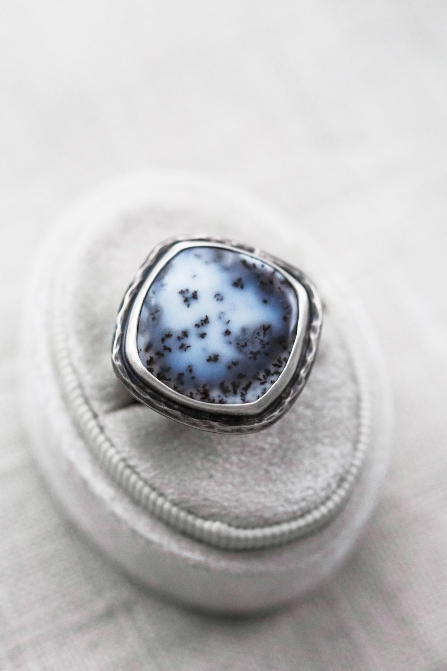 This ring is made from a natural, snowy dendritic agate/merlinite stone, which is set in a hand smithed bezel of sterling silver.